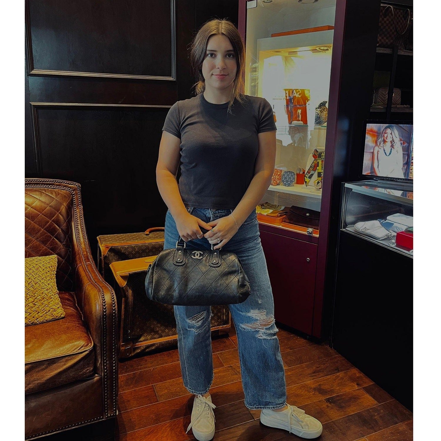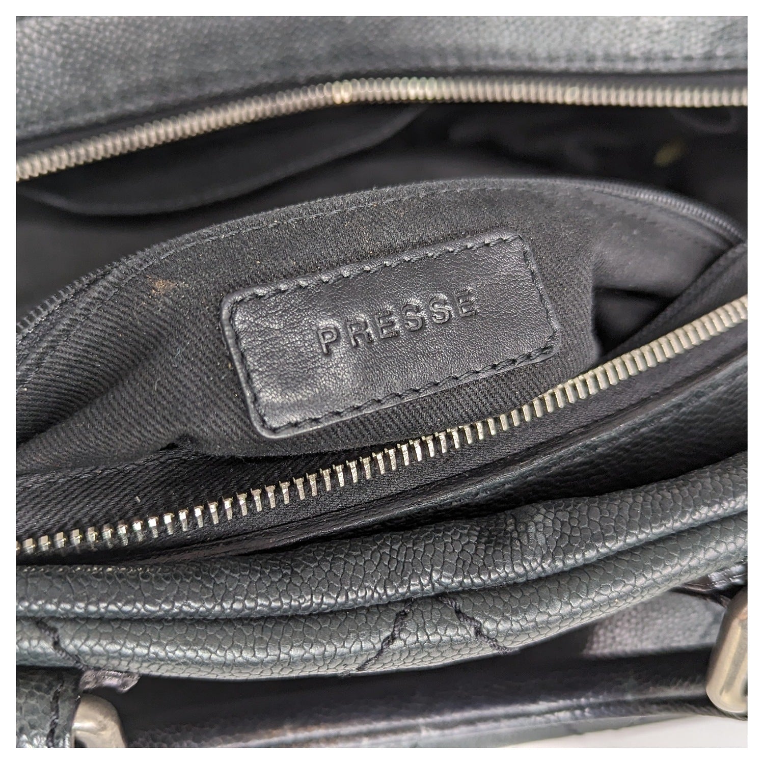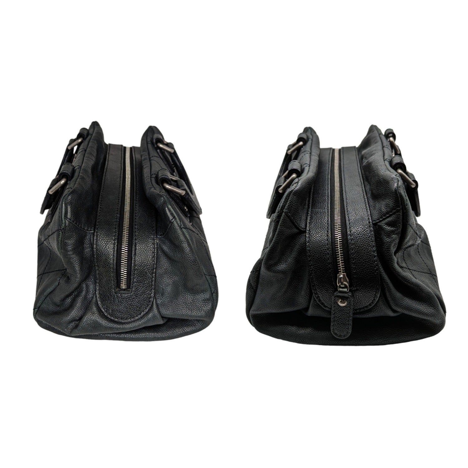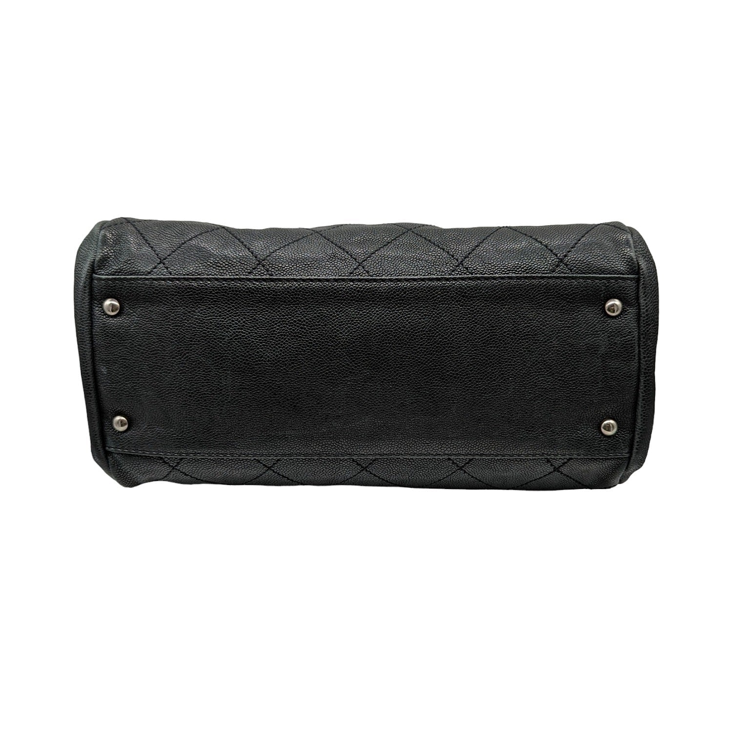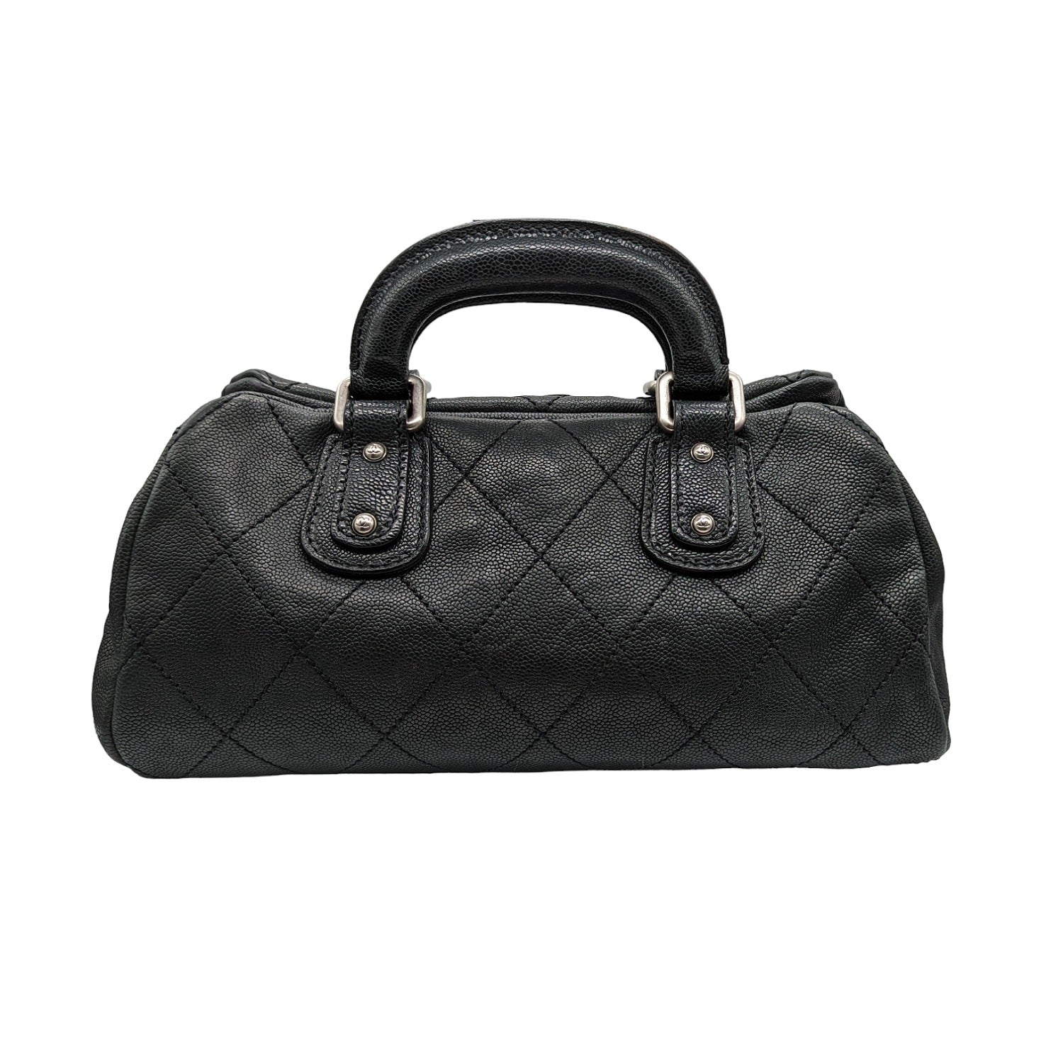 This chic doctor inspired bag is crafted of diamond stitched caviar textured leather. The bag features reinforced leather top handles with ruthenium squared links, expanded sides, a raised top crest, and a central sunken zipper. This handbag opens with a leather pull to a black fabric interior for everyday essentials.