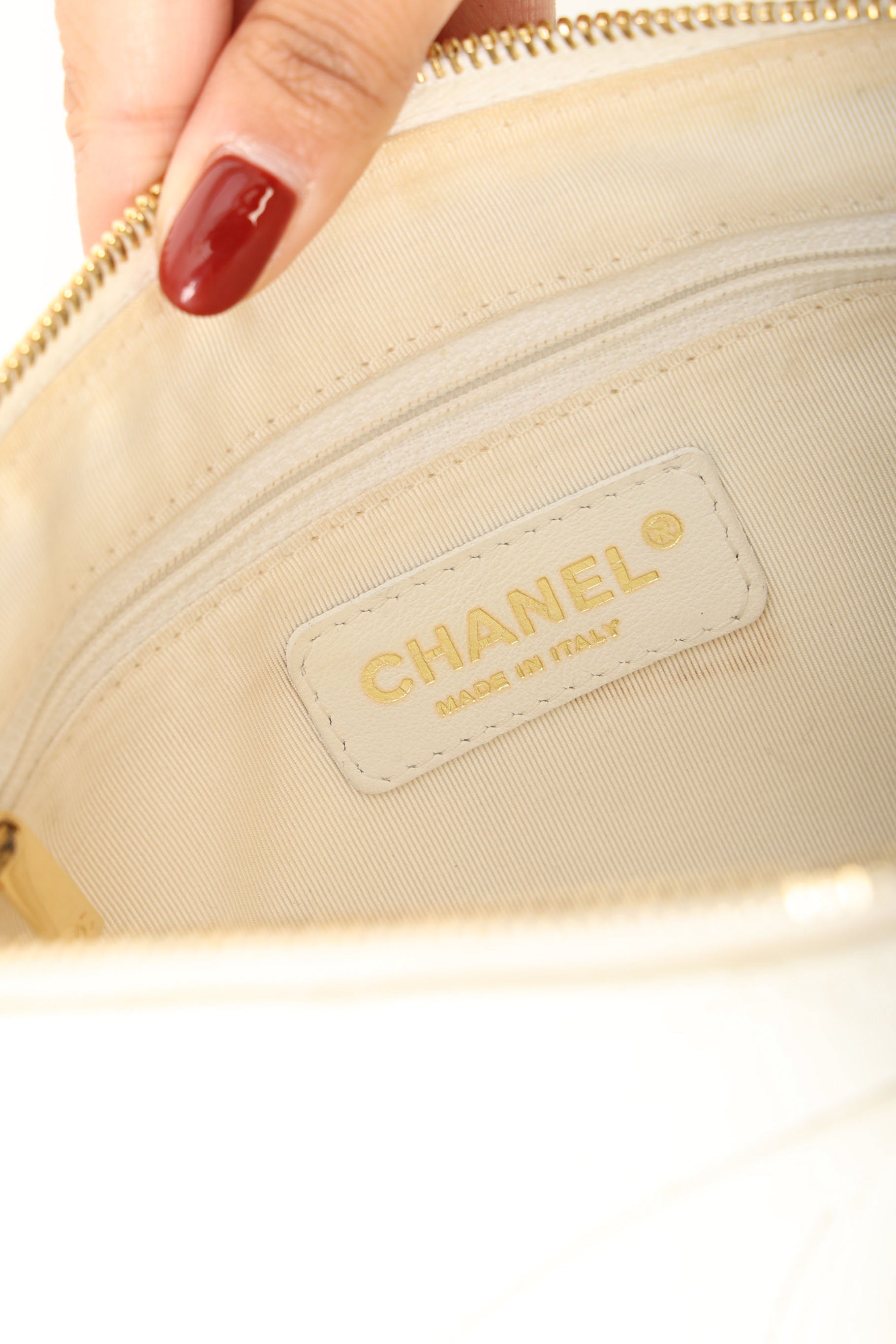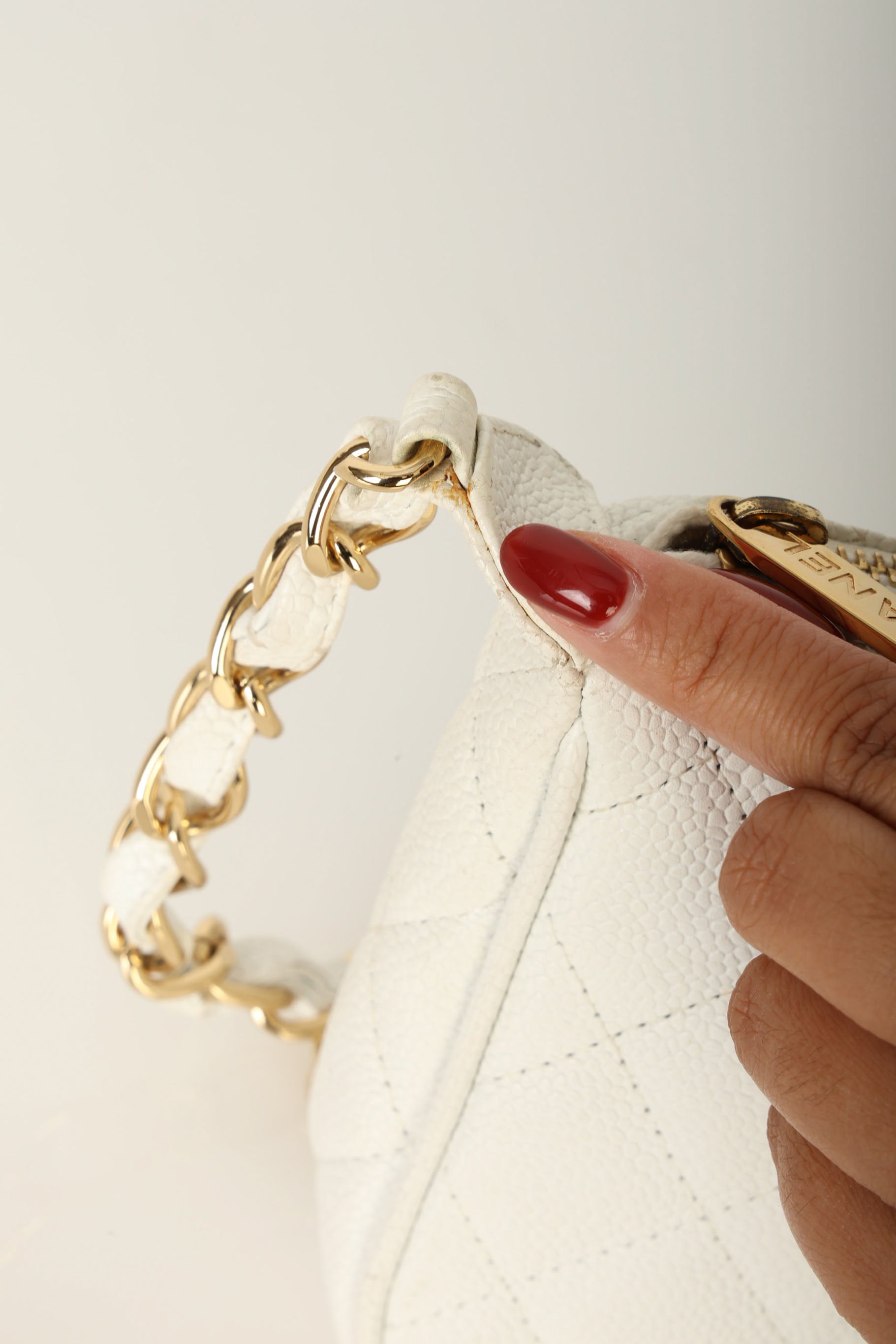 Please note: Light tarnish on zipper pull. Hairline scratches on hardware. Slight glue residue on sides where chains begin. Slight corner/edge wear. Light discoloration on zipper fabric. Please refer to photos for more details.?