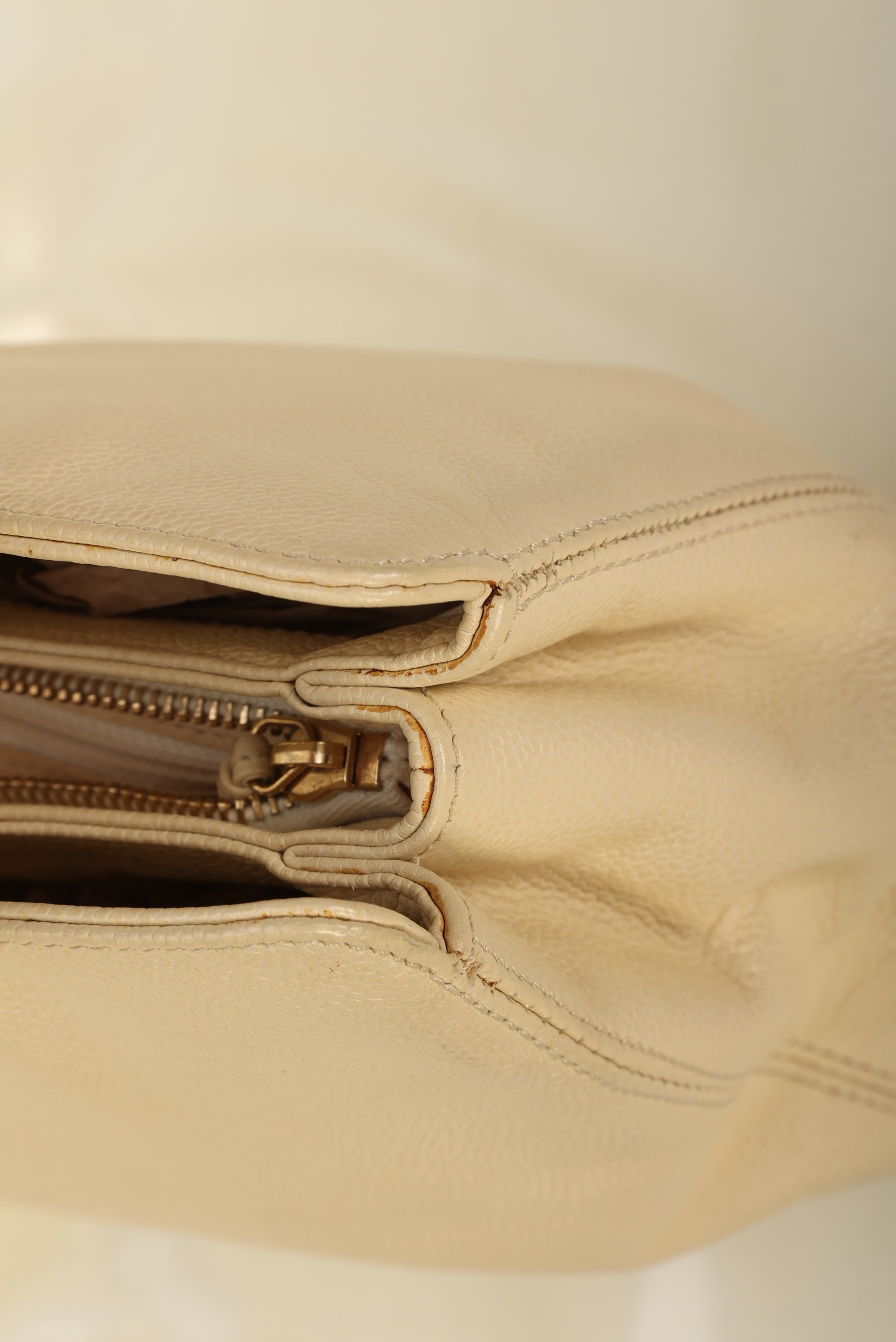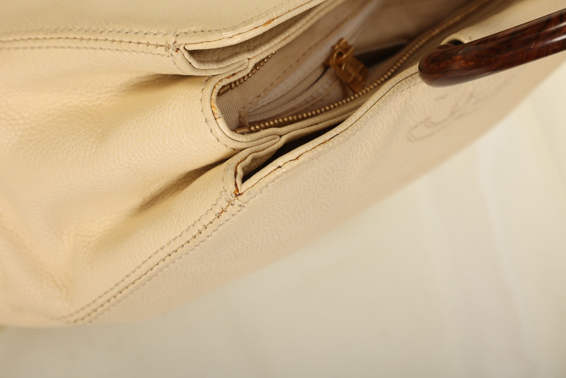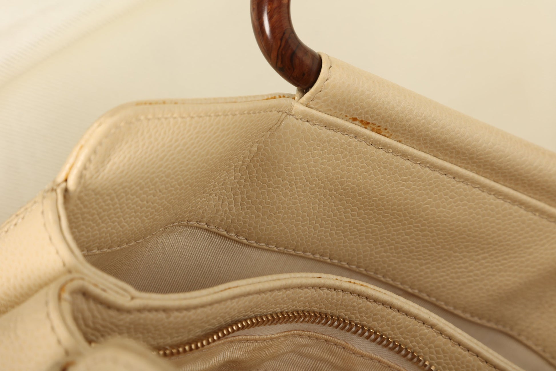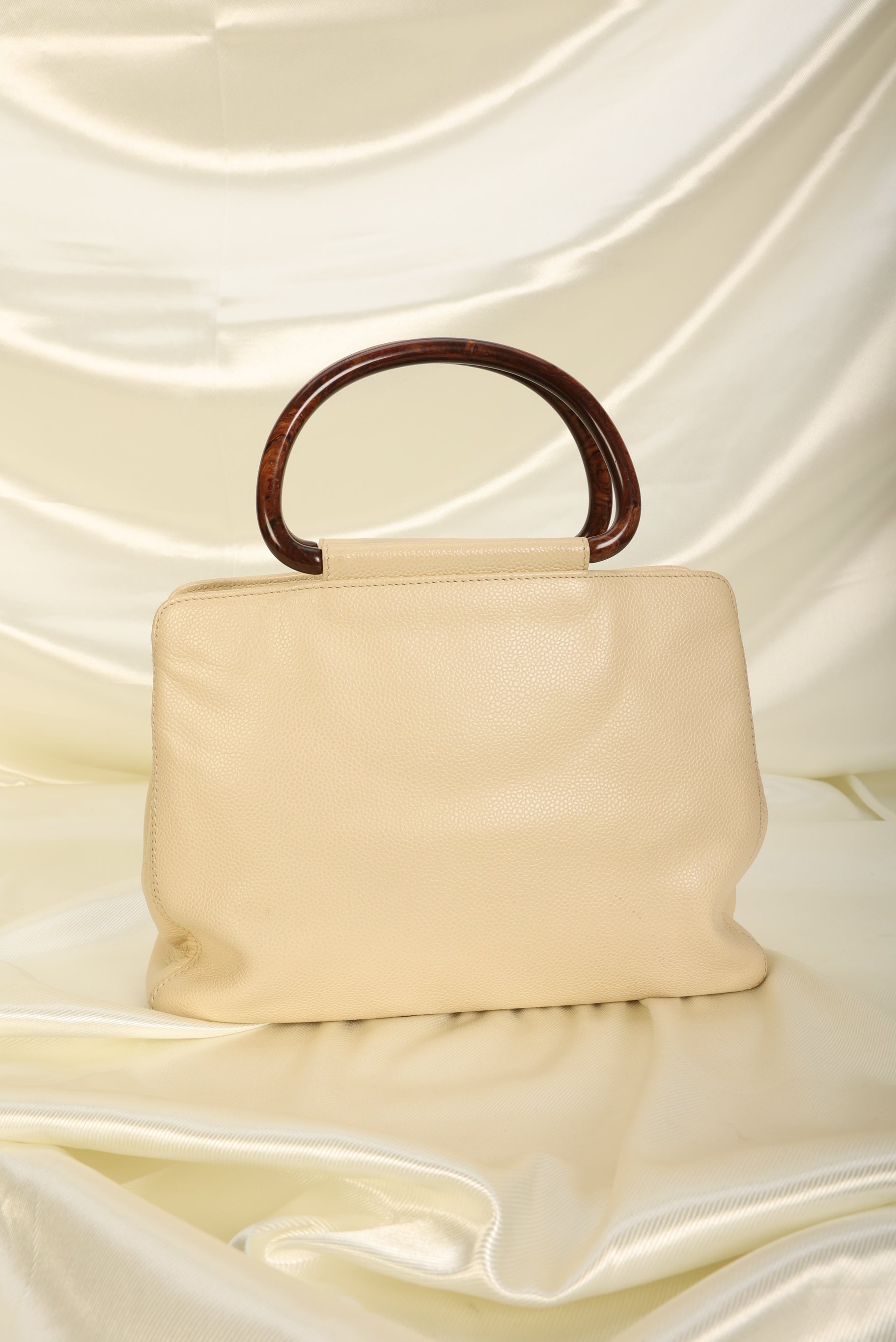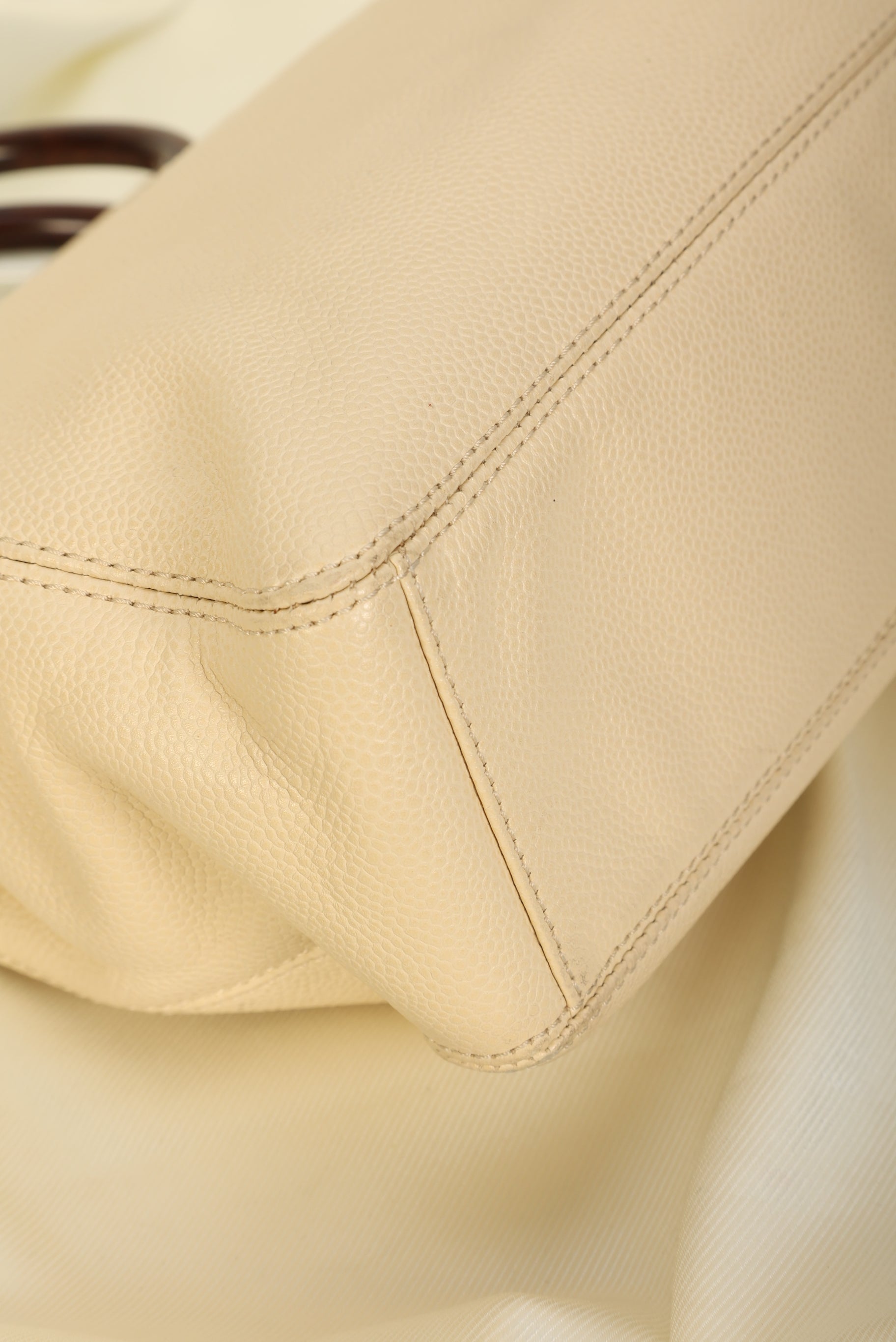 Crafted in Chanel's durable caviar leather and stunning acrylic handles, this rare piece is coming back to the shop! The creamy neutral tone allows this to be the perfect handle tote for every season. The wood-like acetate adds a unique touch to this bag!