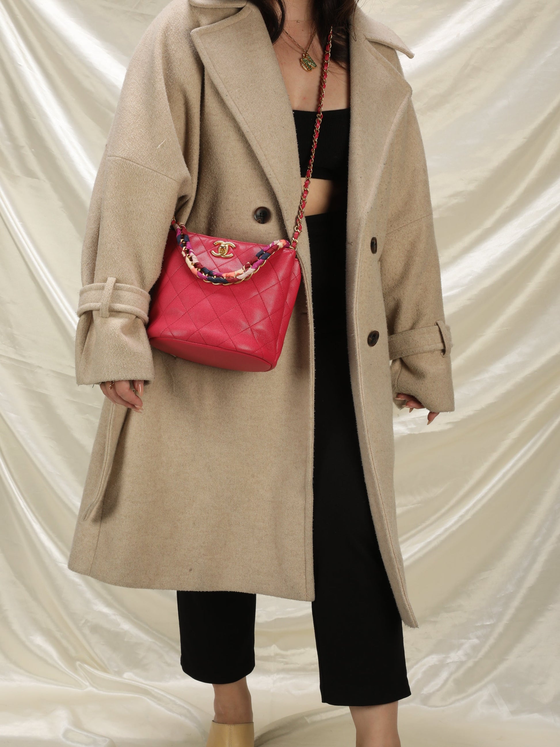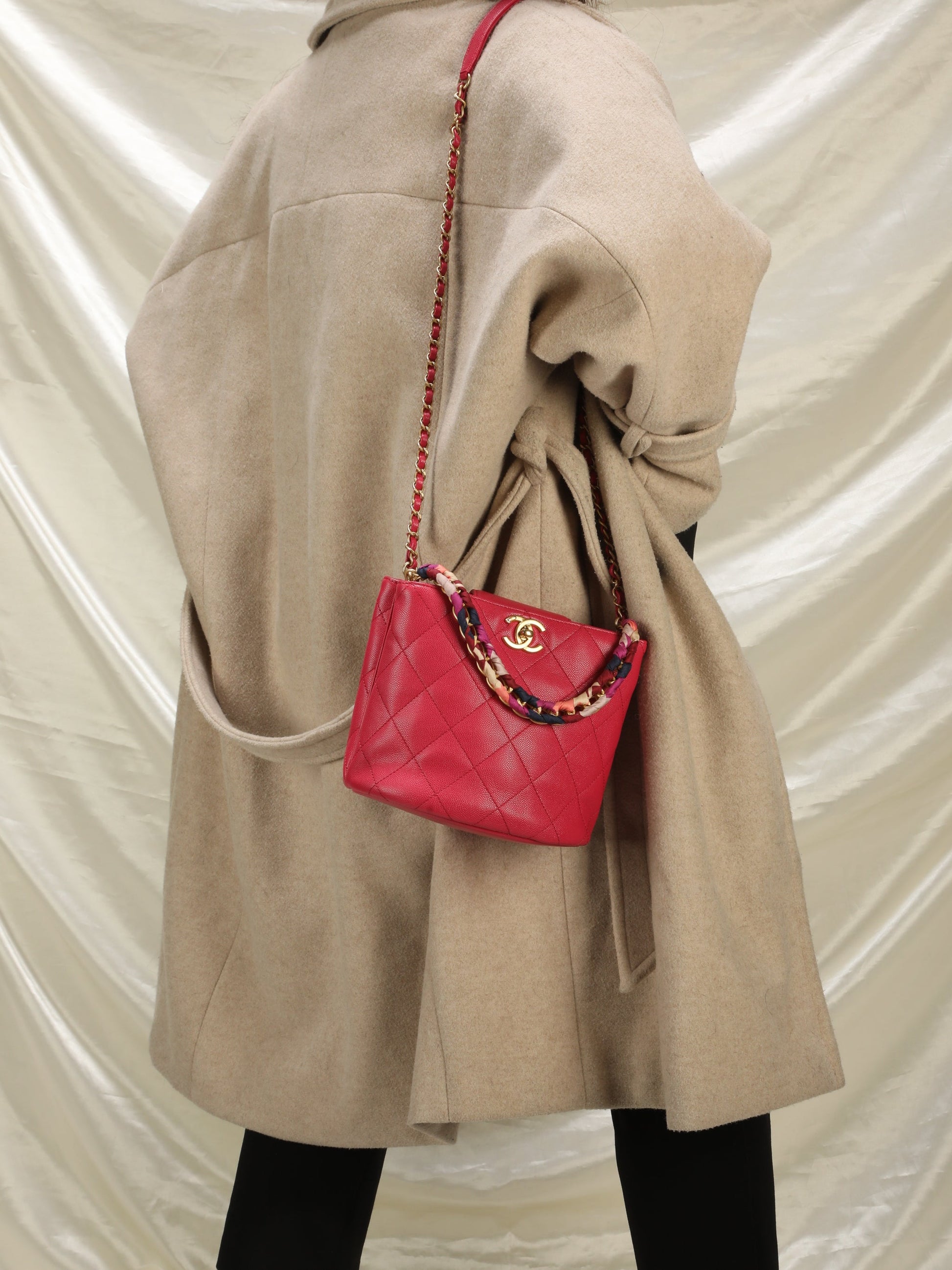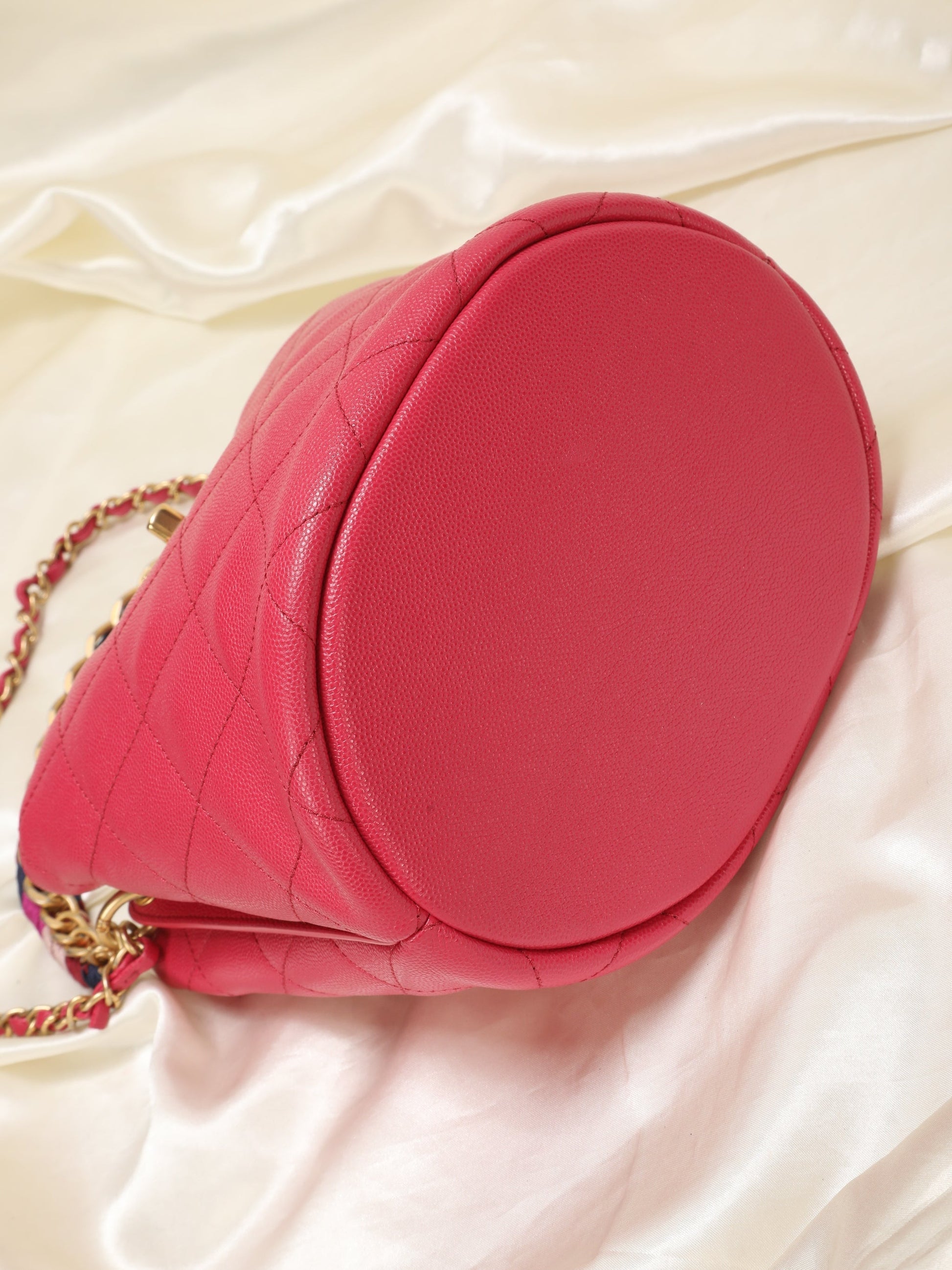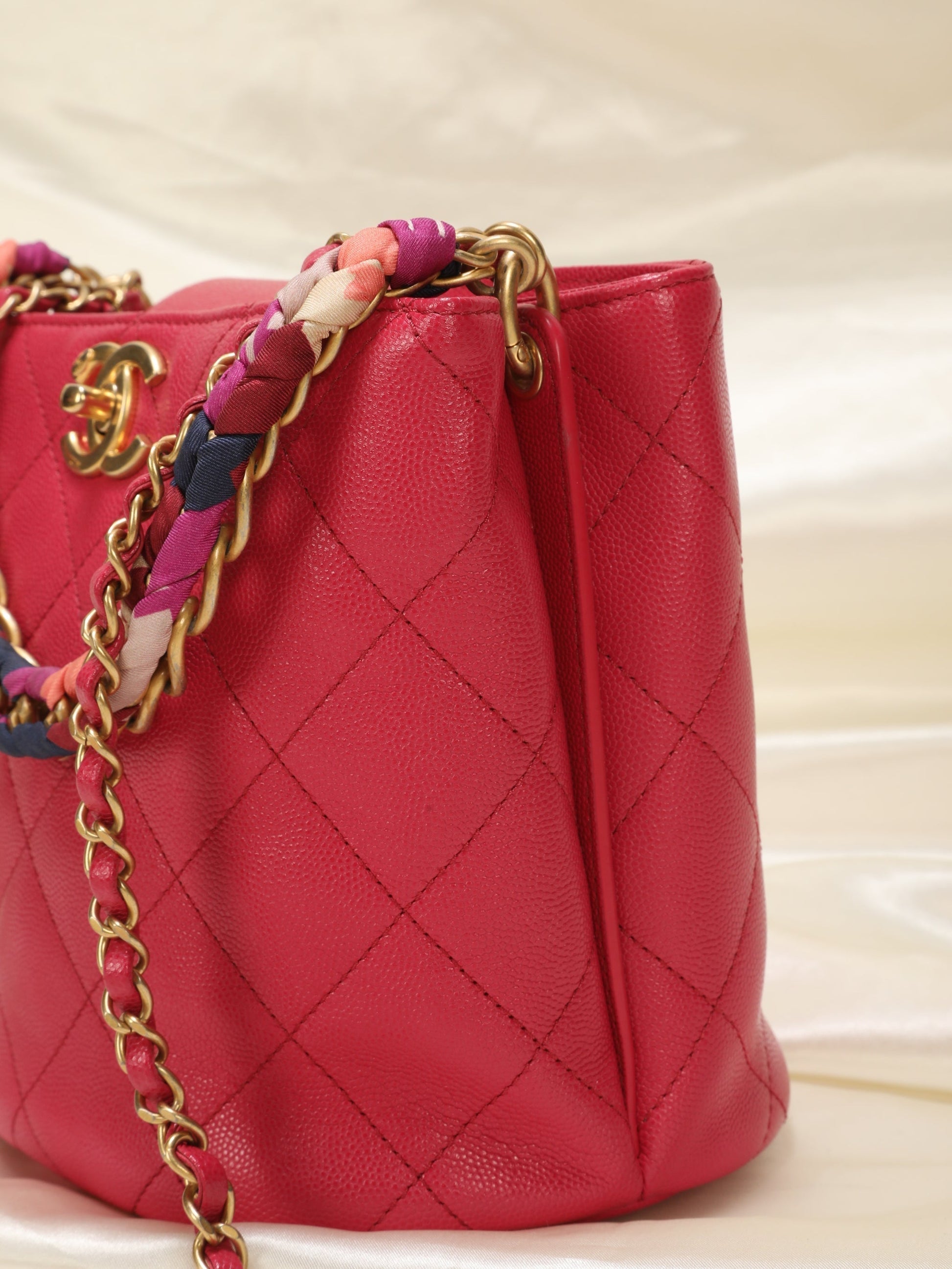 A beautifully-crafted,??rare raspberry 2019 Chanel caviar bucket??bag with scarf detail intertwined in the chunky chain, additional longer strap for versatility! The timeless style makes this the perfect investment piece. Extremely hard to find, crafted in 24k gold plating. A Chanel collector's dream. Gold champagne hardware. Last one online sold for 5500+!