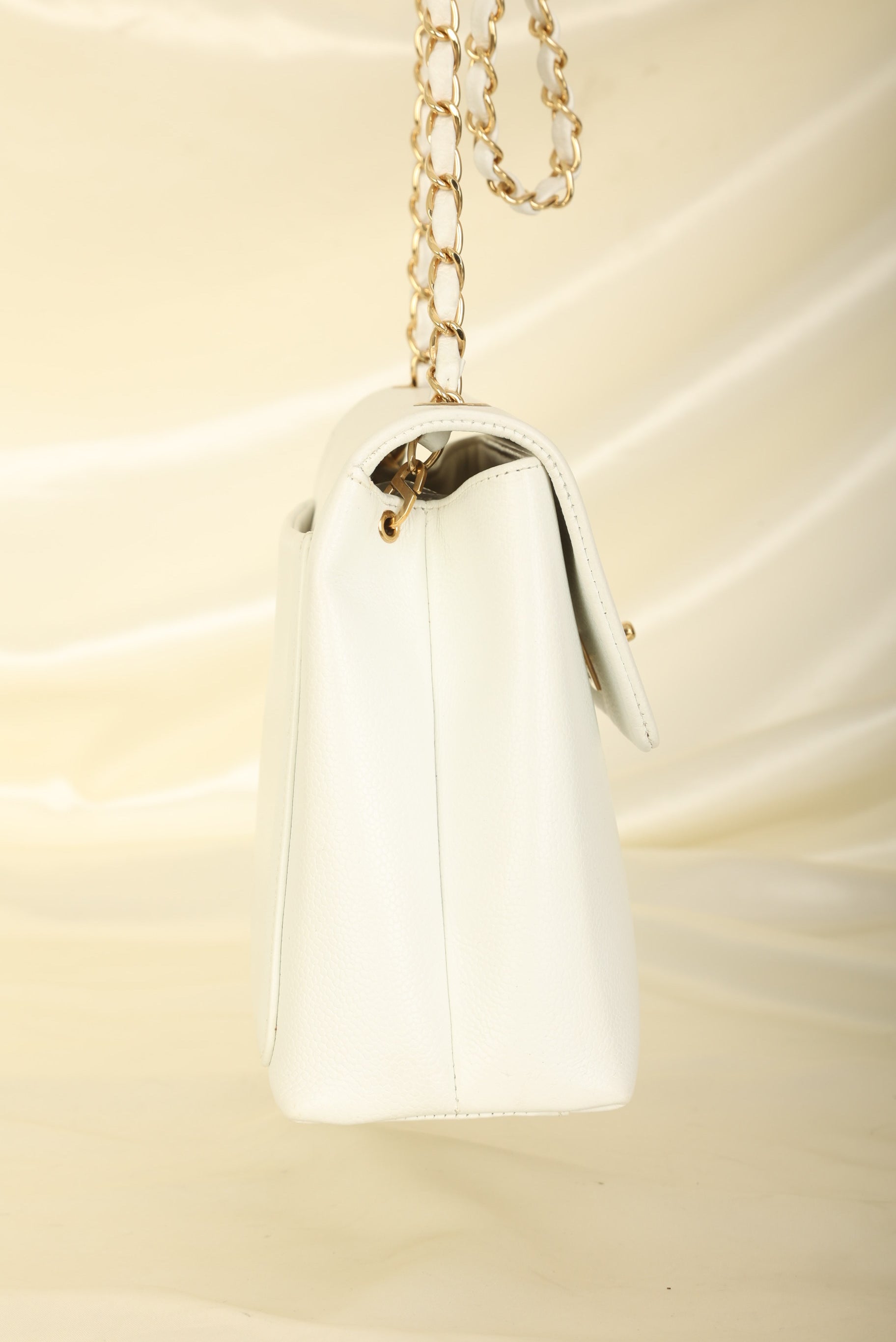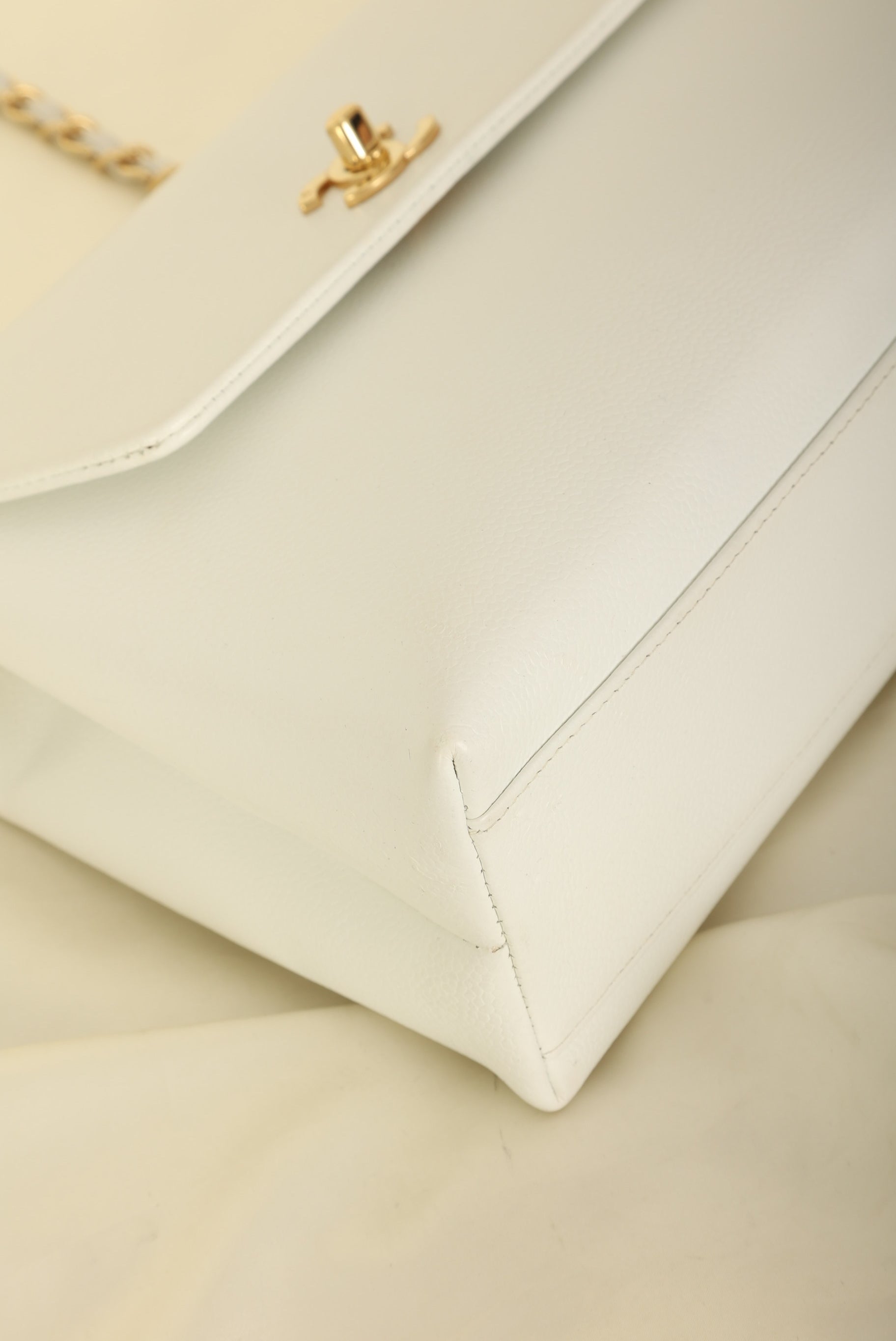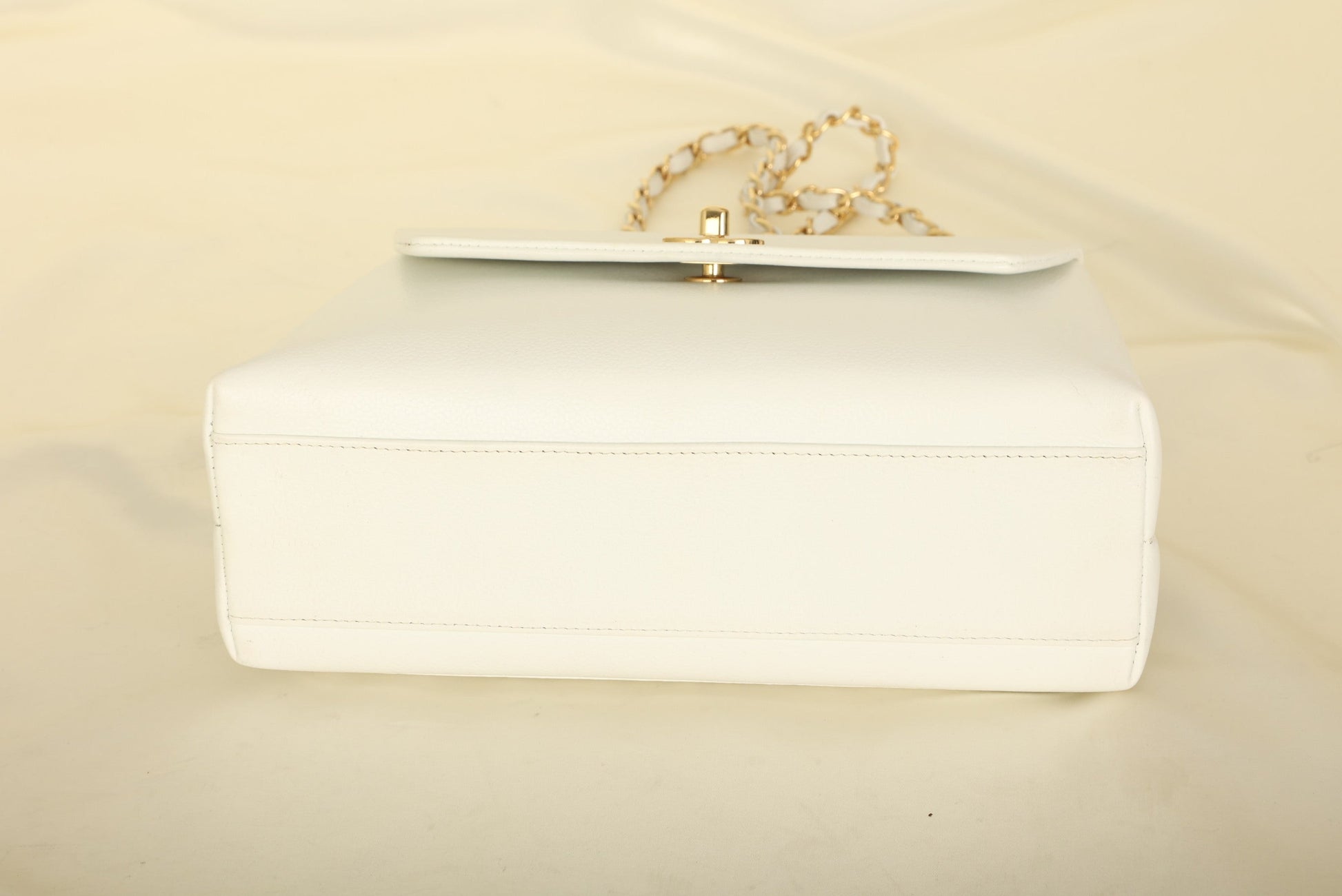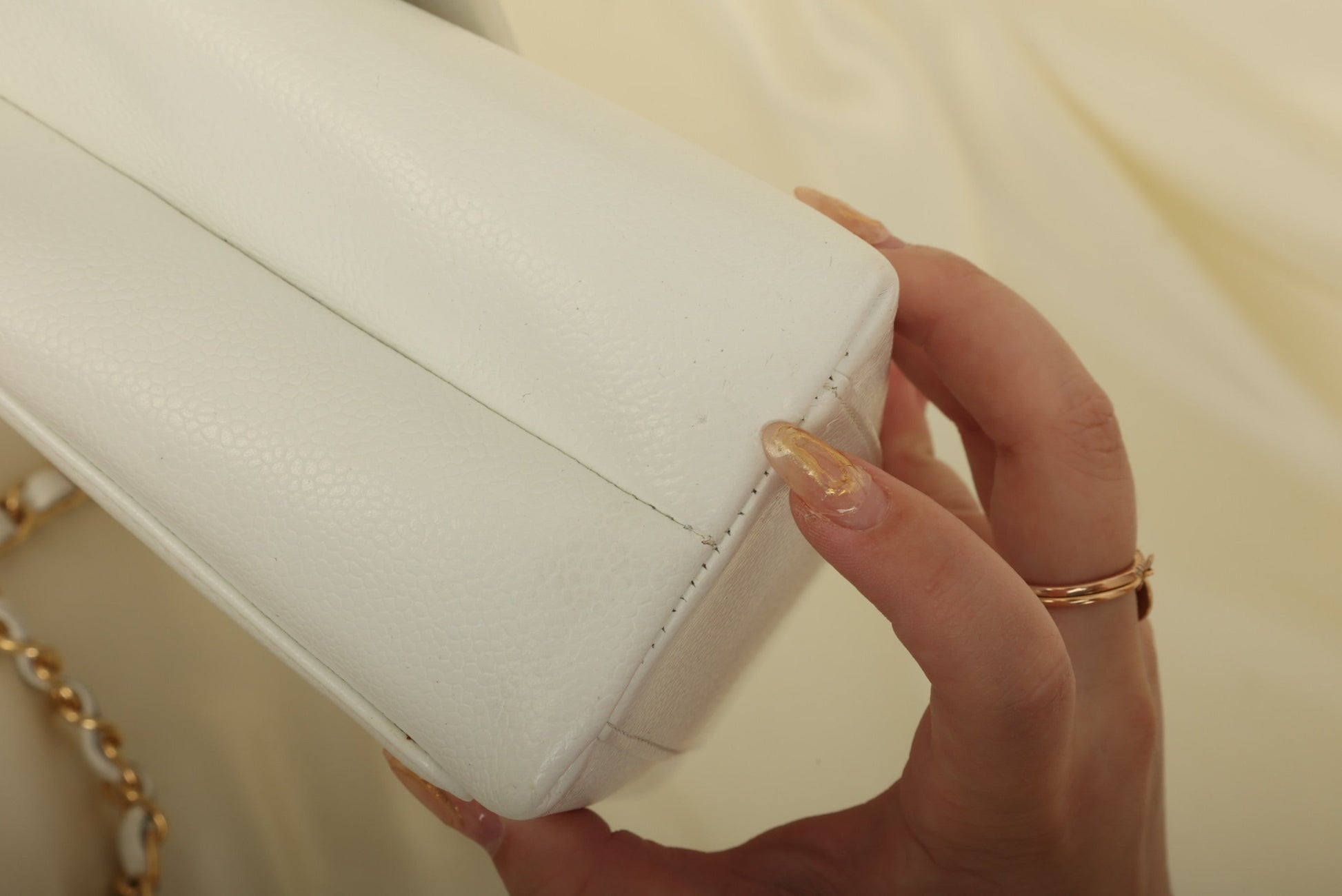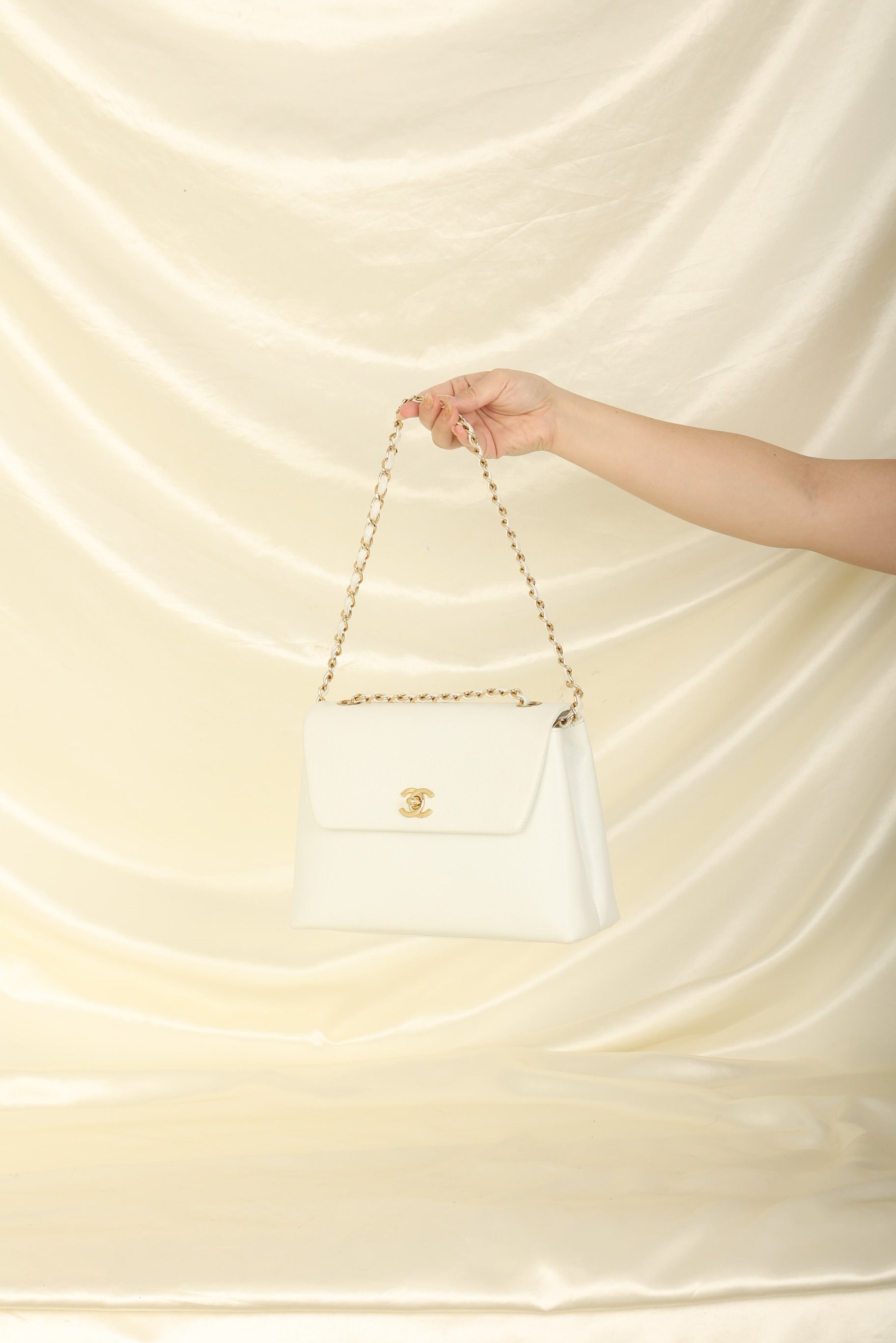 Dropping in the shop is a?timeless Chanel Caviar Trapezoid Flap bag in a gorgeous bright white. Can be loved for years to come. Vintage Chanel crafted in the 90's= 24k hardware and caviar for durability. This piece can be? as a long should bag or play around with the straps to turn it into a short shoulder bag. Such a rare and elegant beauty, sure to elevate your collection! You can fit your phone, wallet, keys, sunglasses, and a few other smaller essentials.?