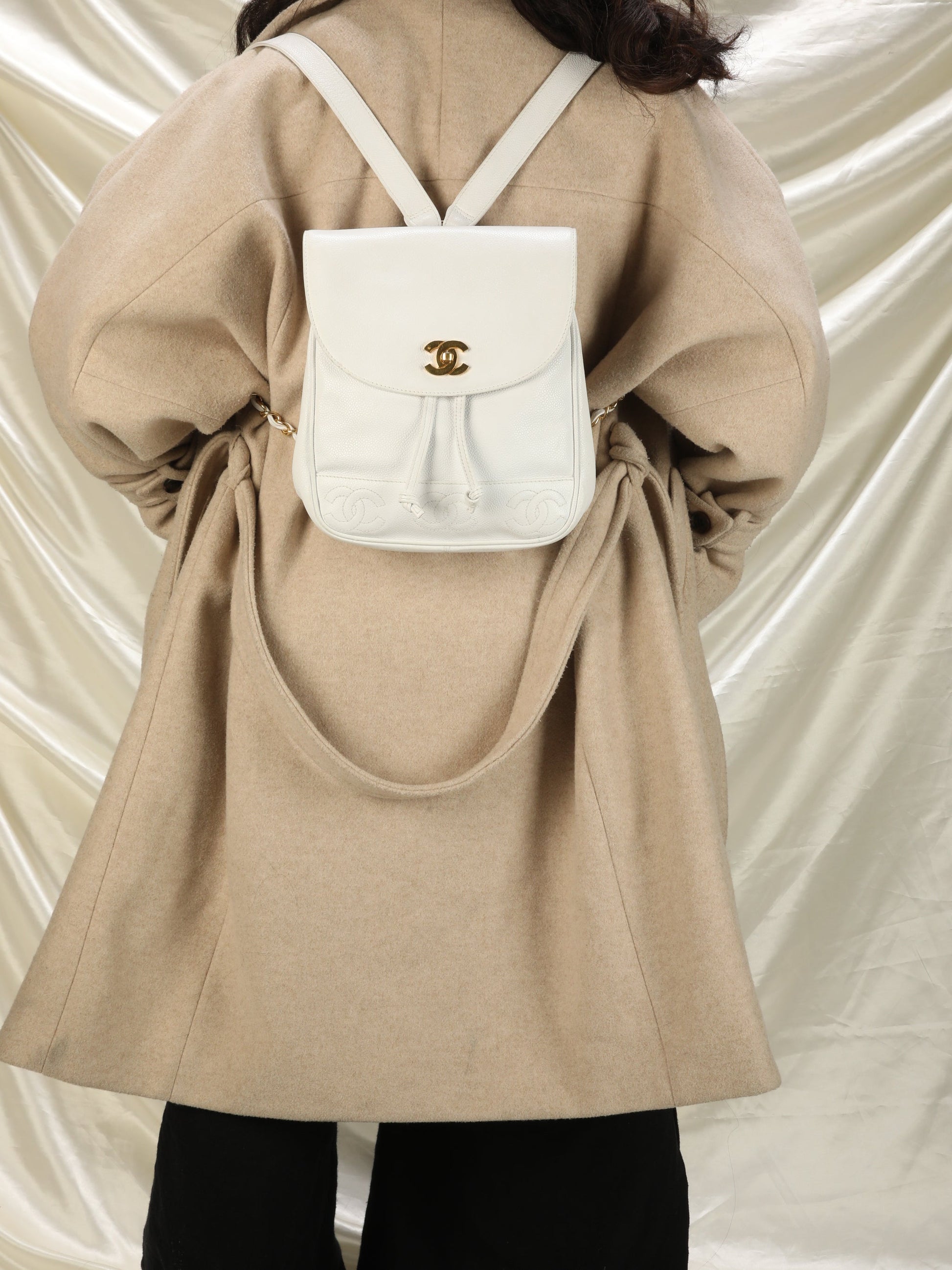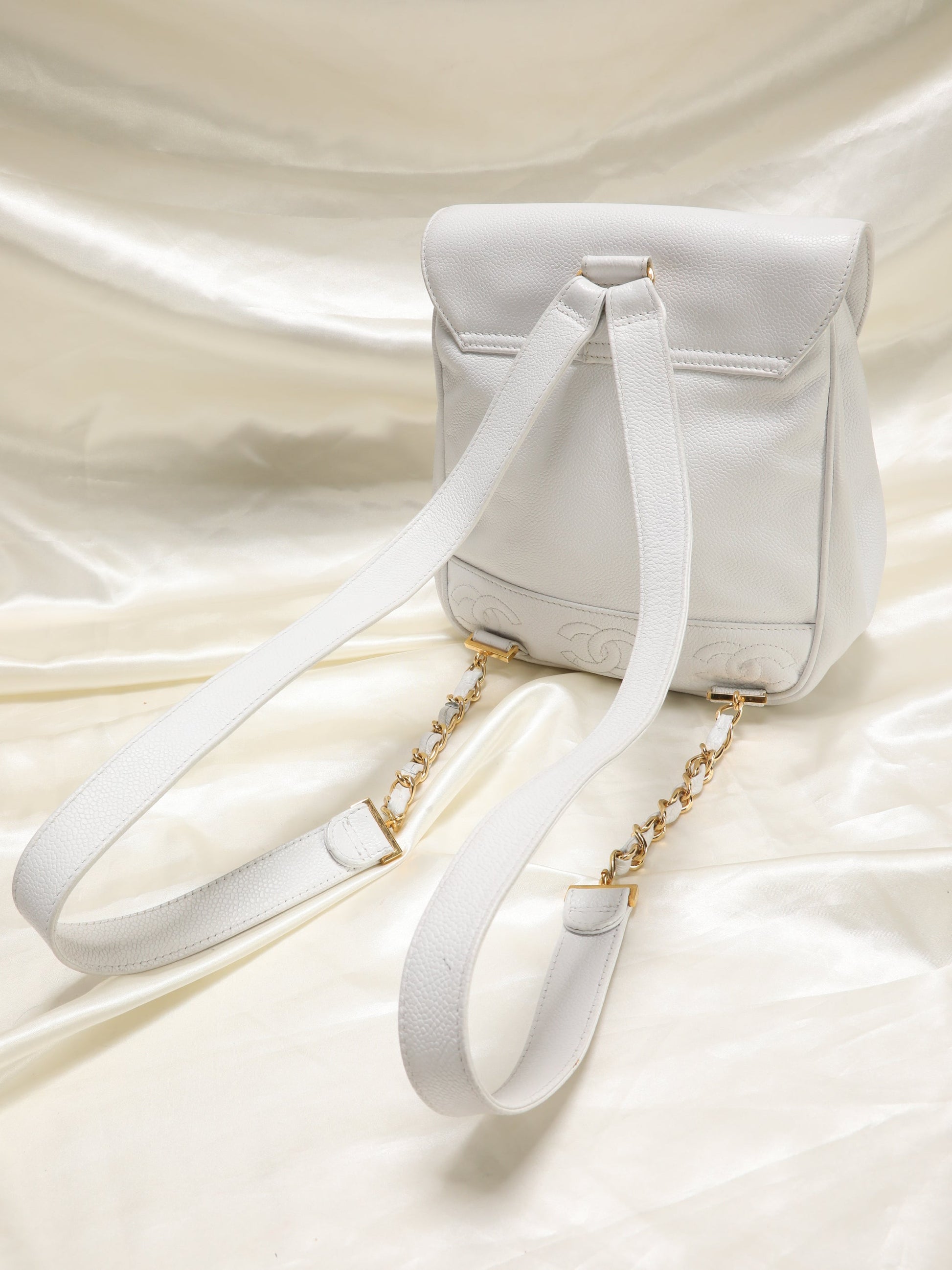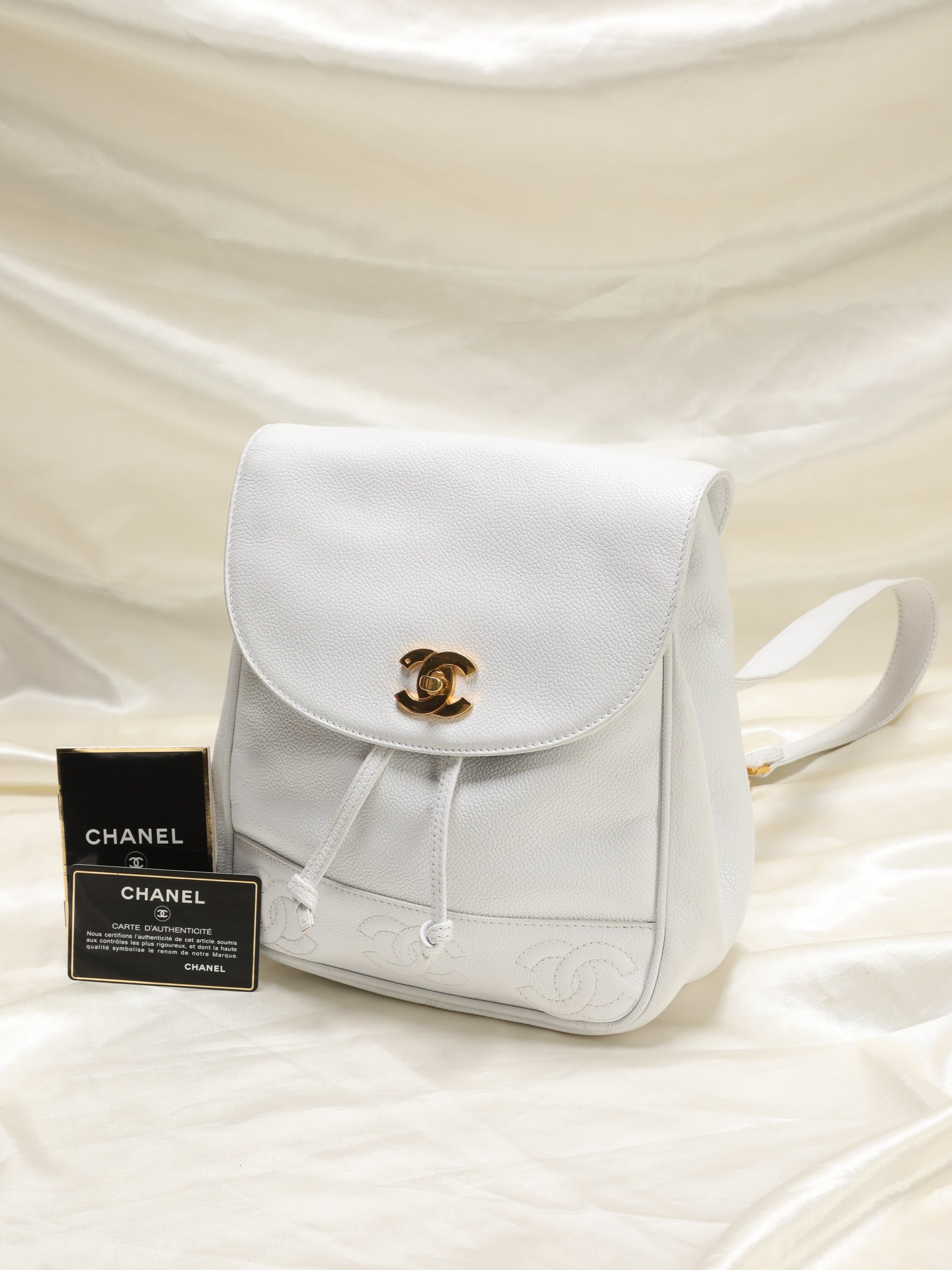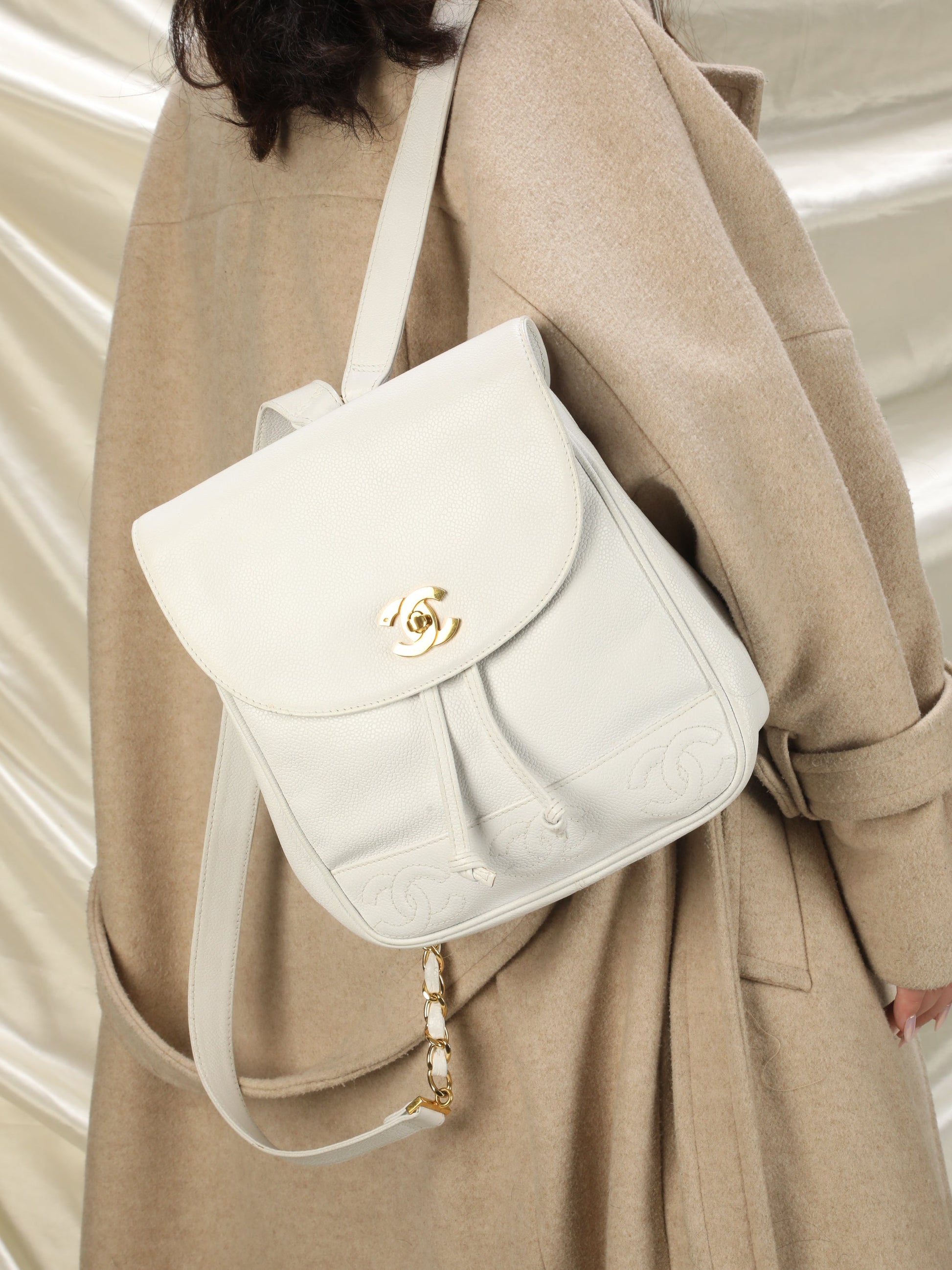 Bringing to the shop a rare snow-white??Chanel caviar backpack! XL??24k plated gold cc logo. Timeless CC logos embossed on bottom of bag. Drawstring bucket for easy access. Perfect for festival season or travel! Spacious interior. 24k gold plated chain straps. Backpack 3300-6000.