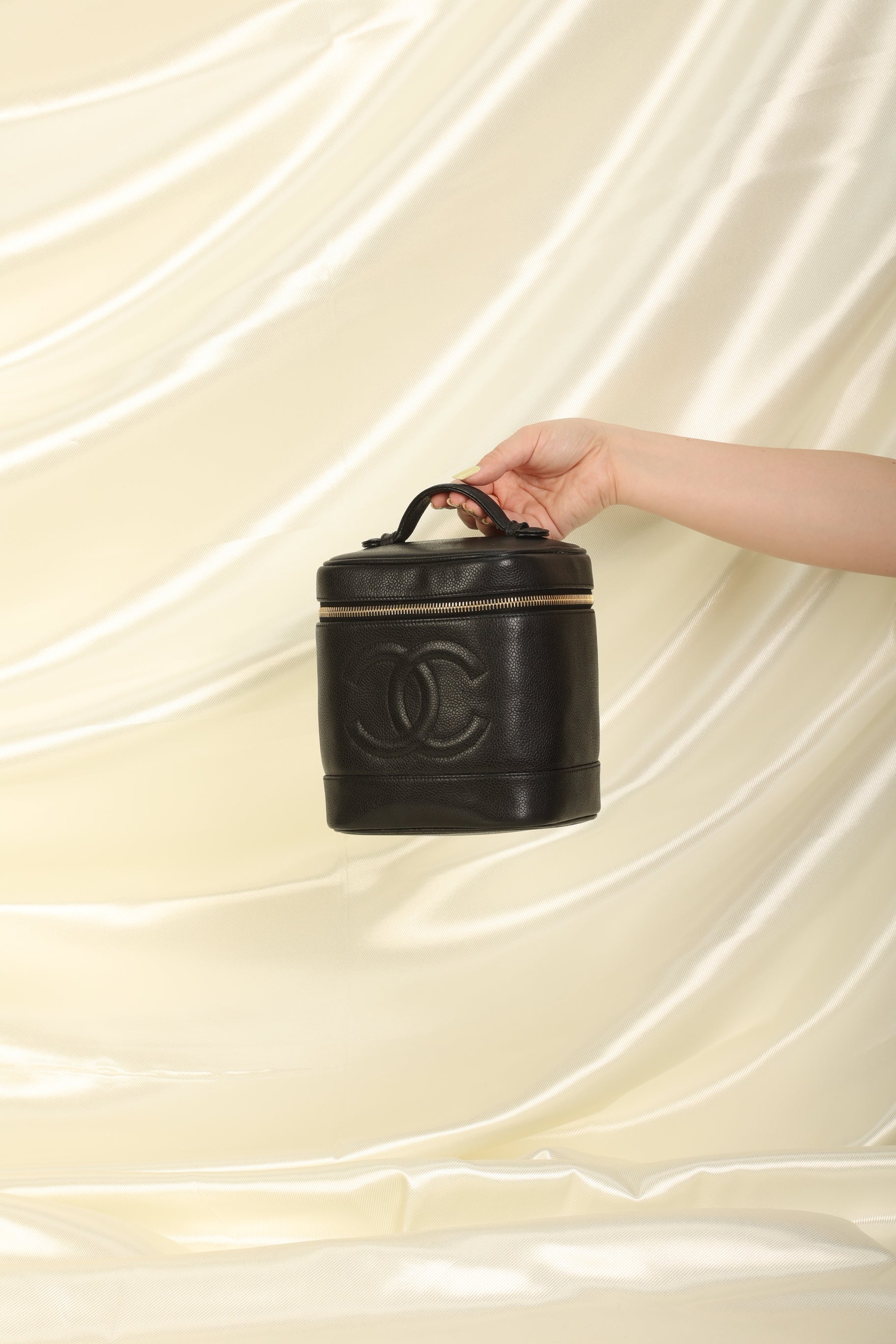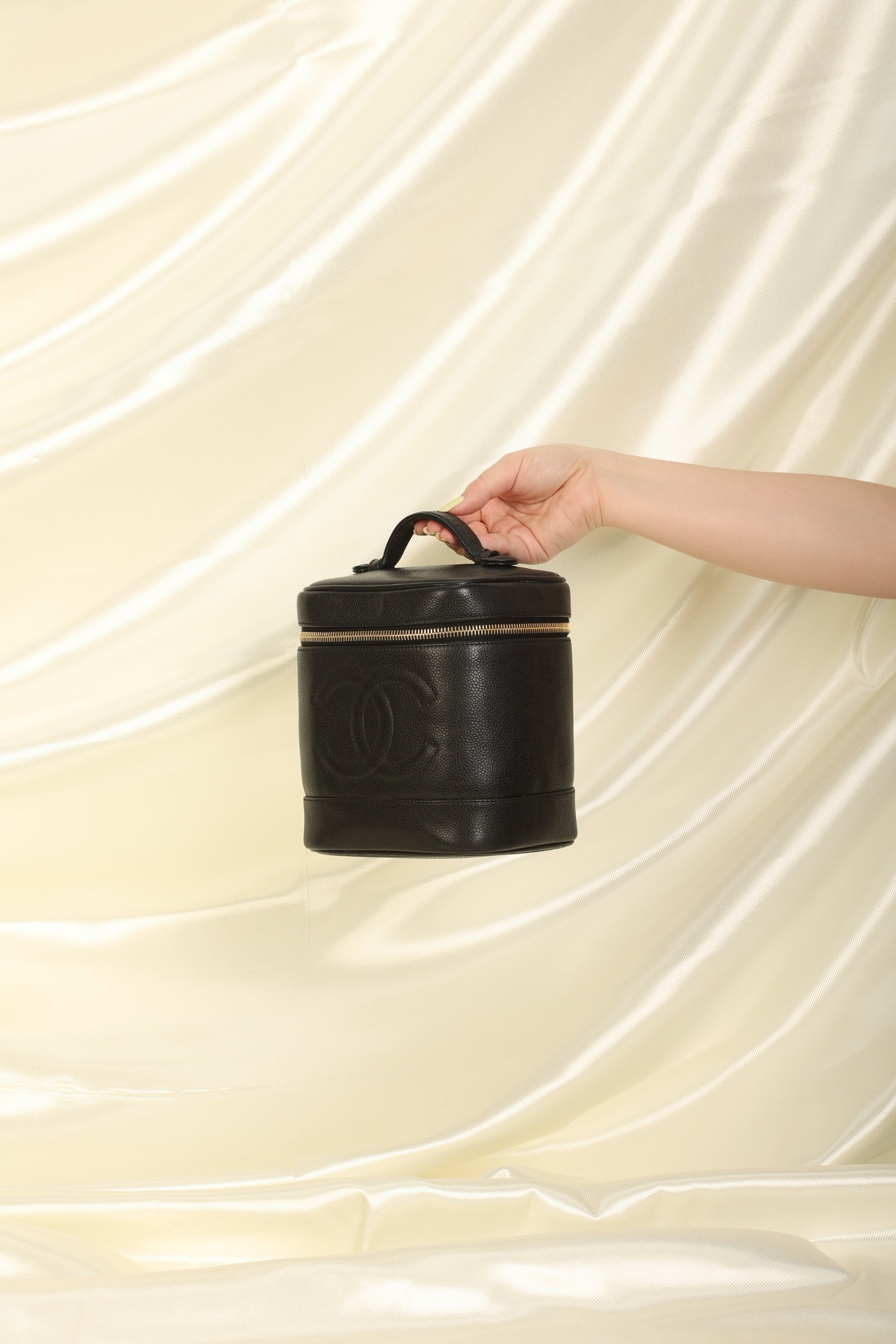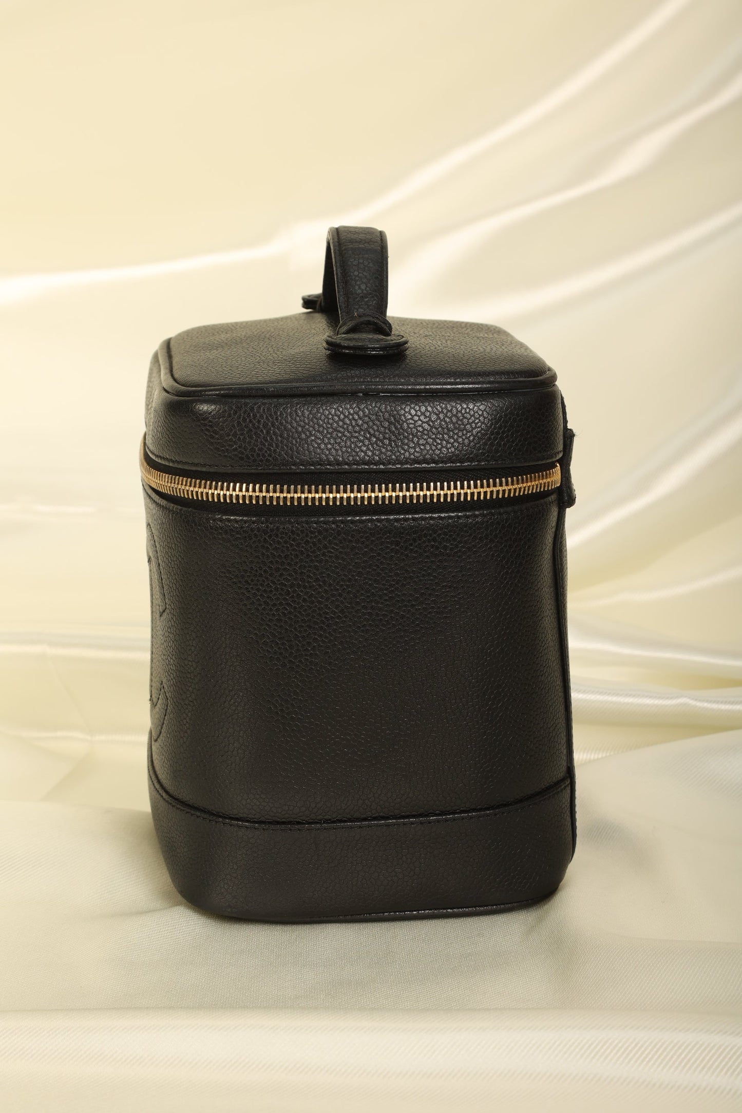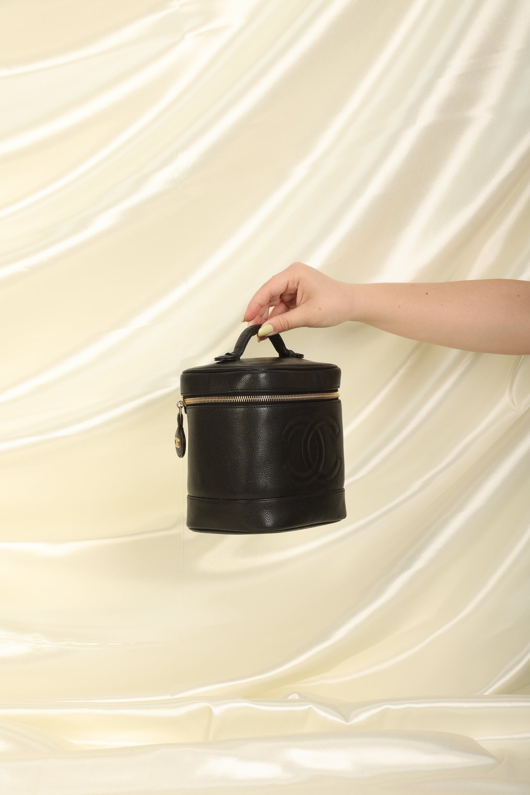 A vintage Chanel vanity bag, crafted in caviar. Iconic CC logo on the front. Can be as a top handle??or used as a makeup bag for travel. Elevate??any outfit and fit all the essentials - including your phone!