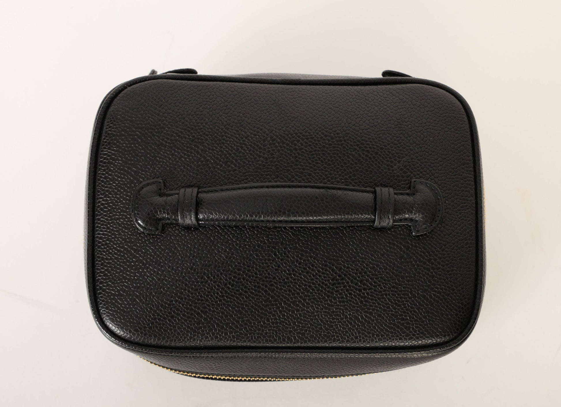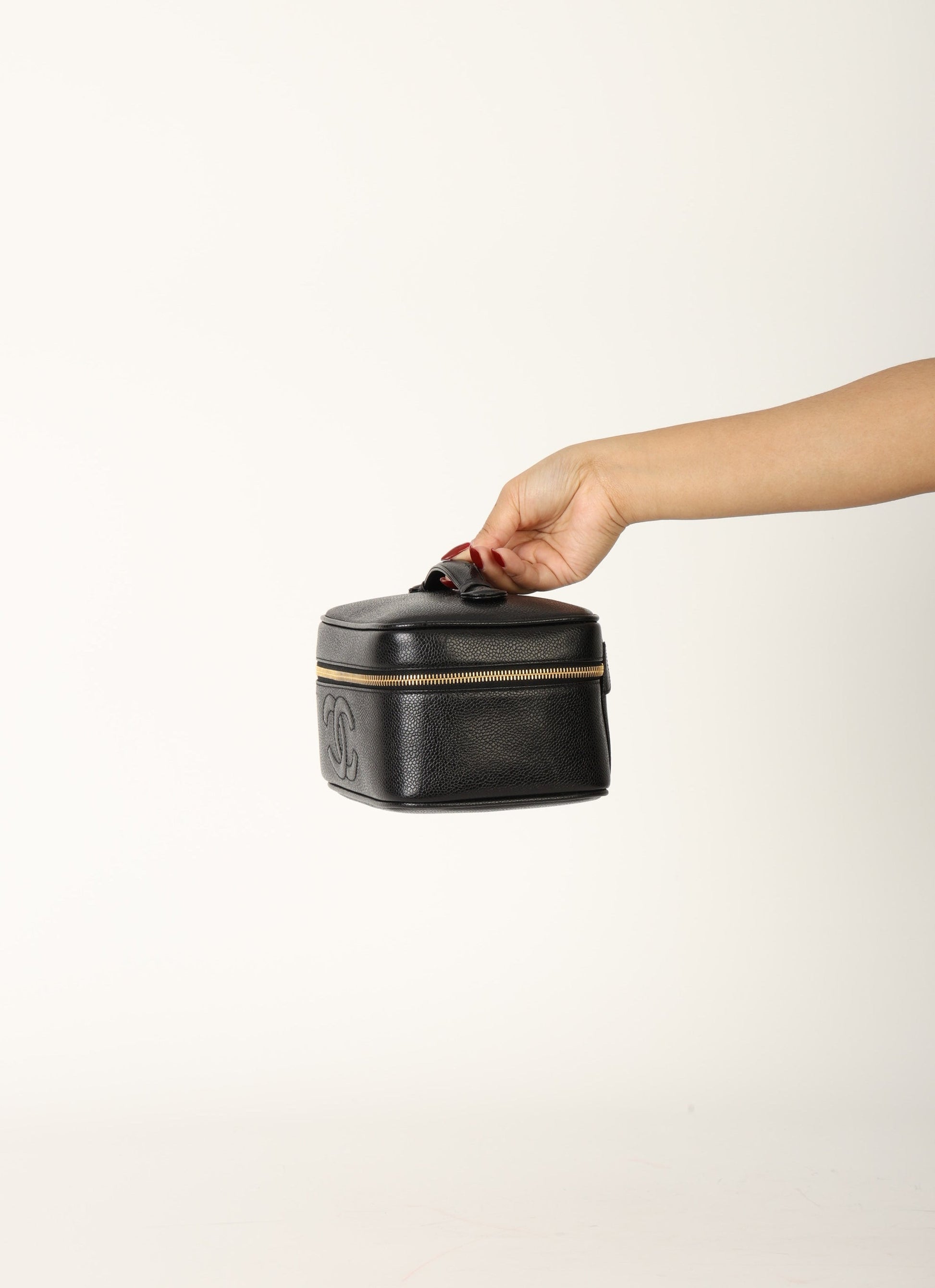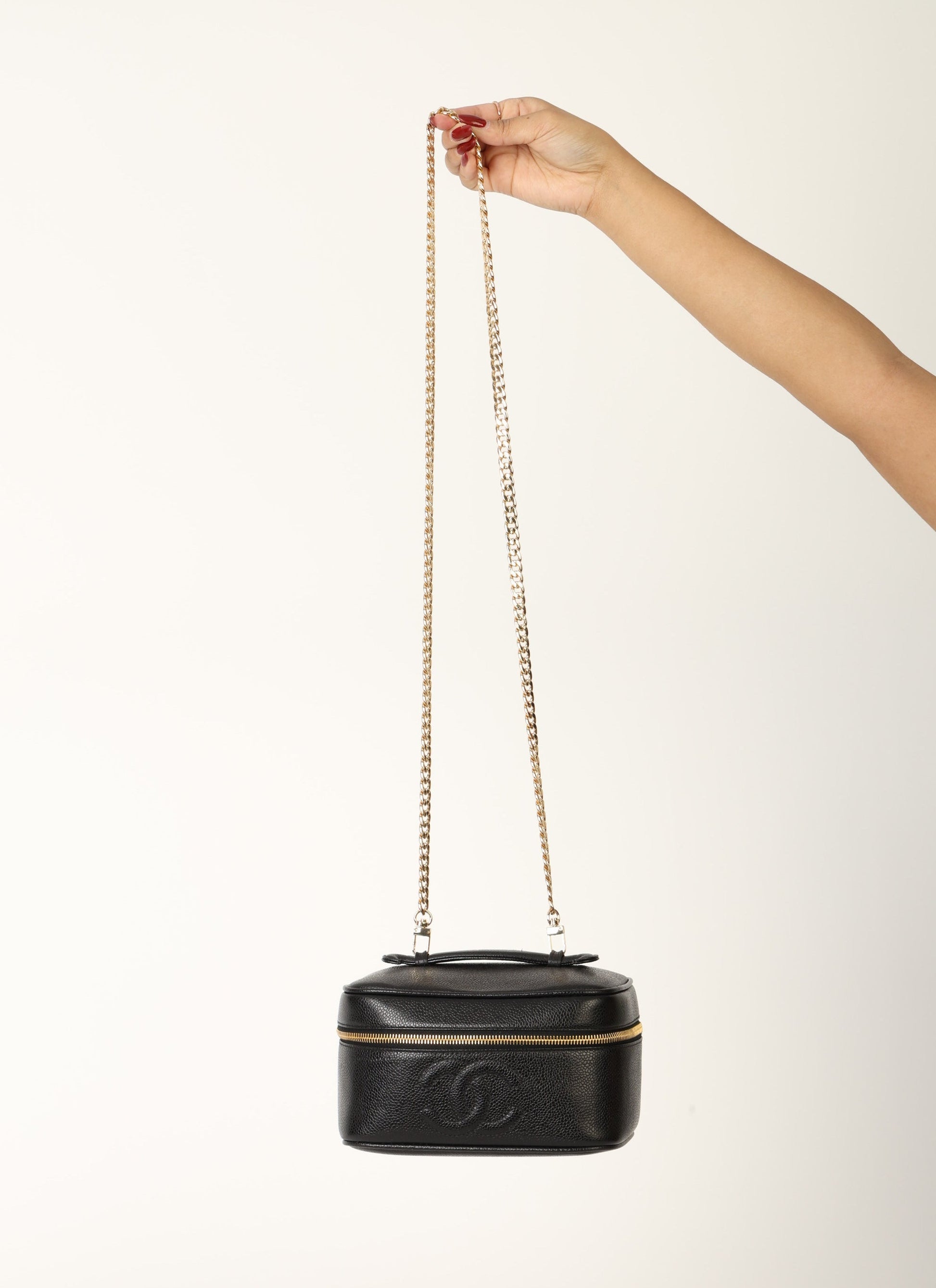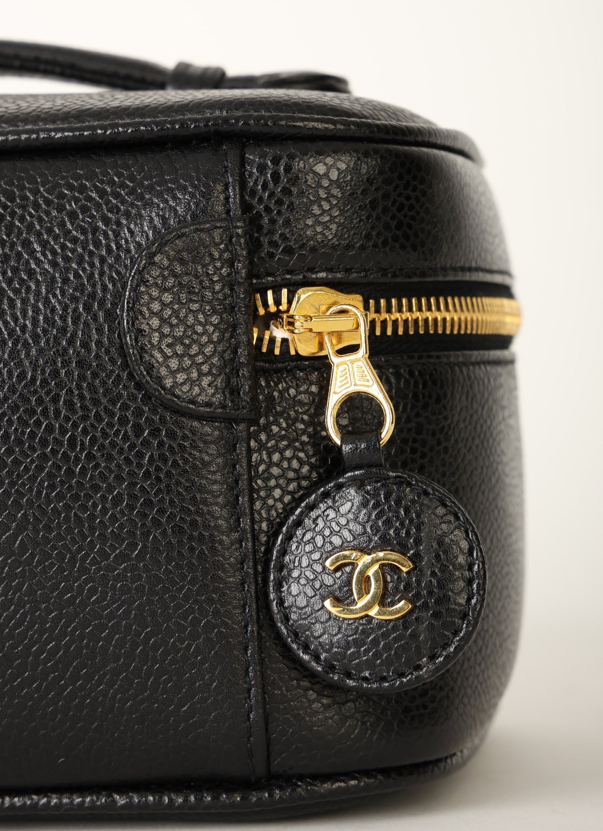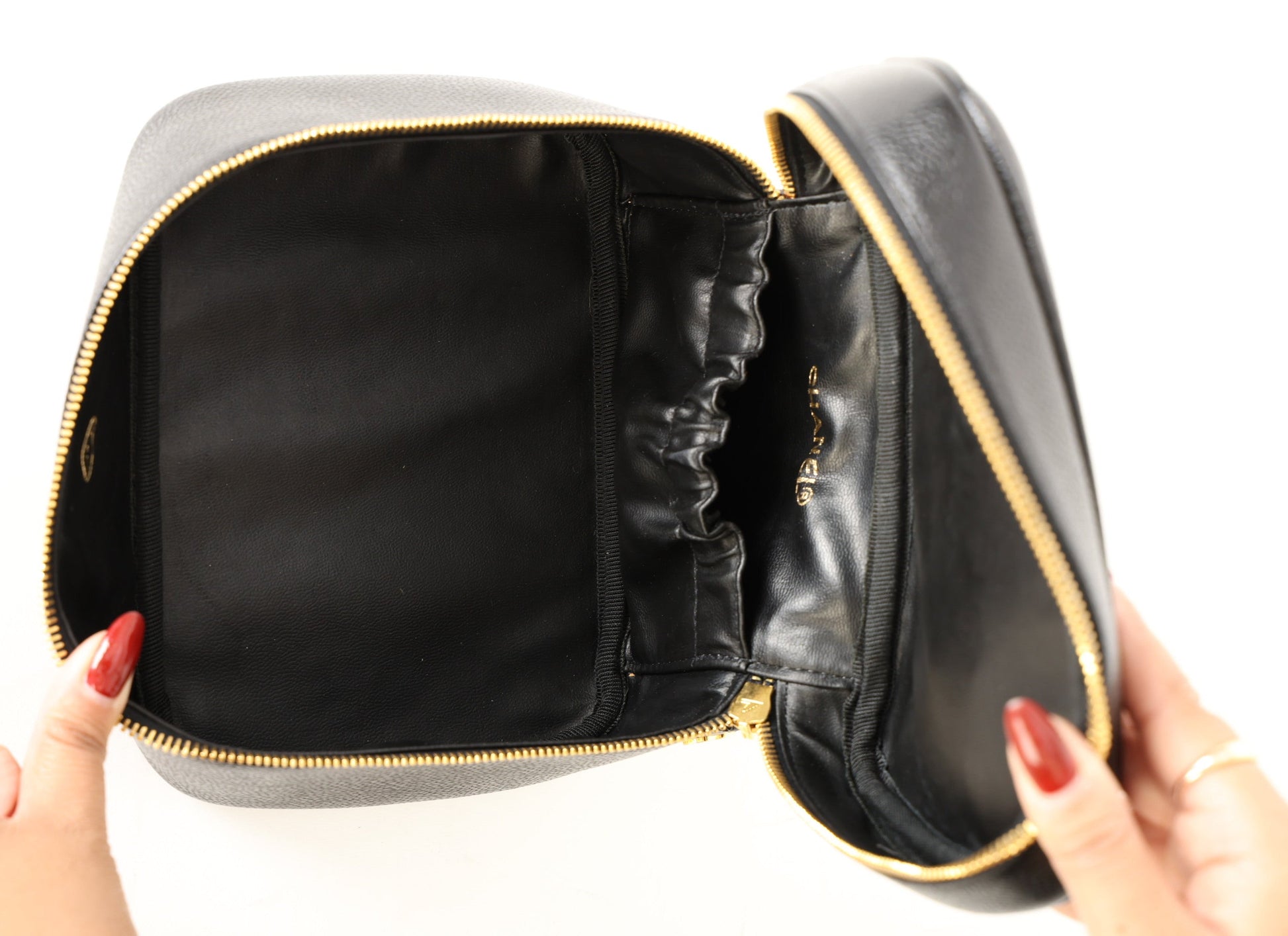 A vintage Chanel vanity bag, crafted in caviar that can be used in such versatile ways!?Features?an iconic CC logo on the front, this bag can be as a top handle or add a generic chain (which we've included!) to use as a crossbody. Use this bag as a makeup bag or to fit your everyday essentials! Can fit your phone, wallet, sunglasses, keys, and a couple more of your small daily essentials.?