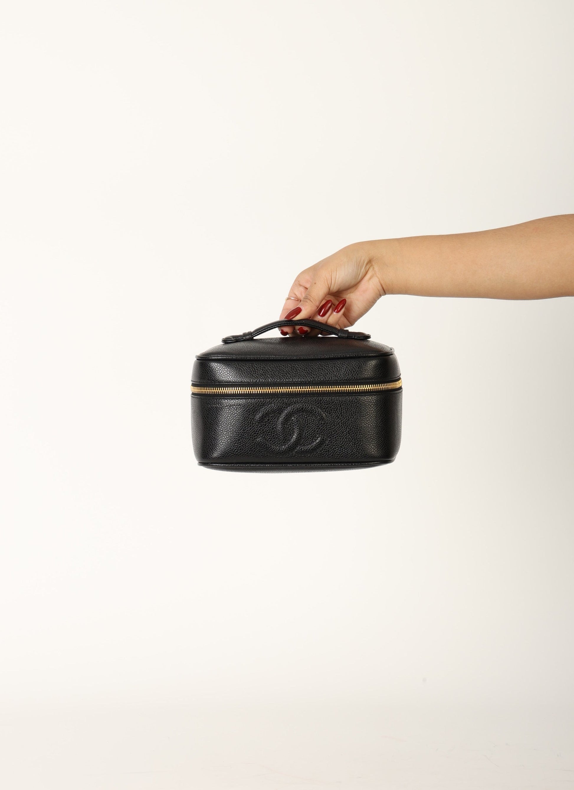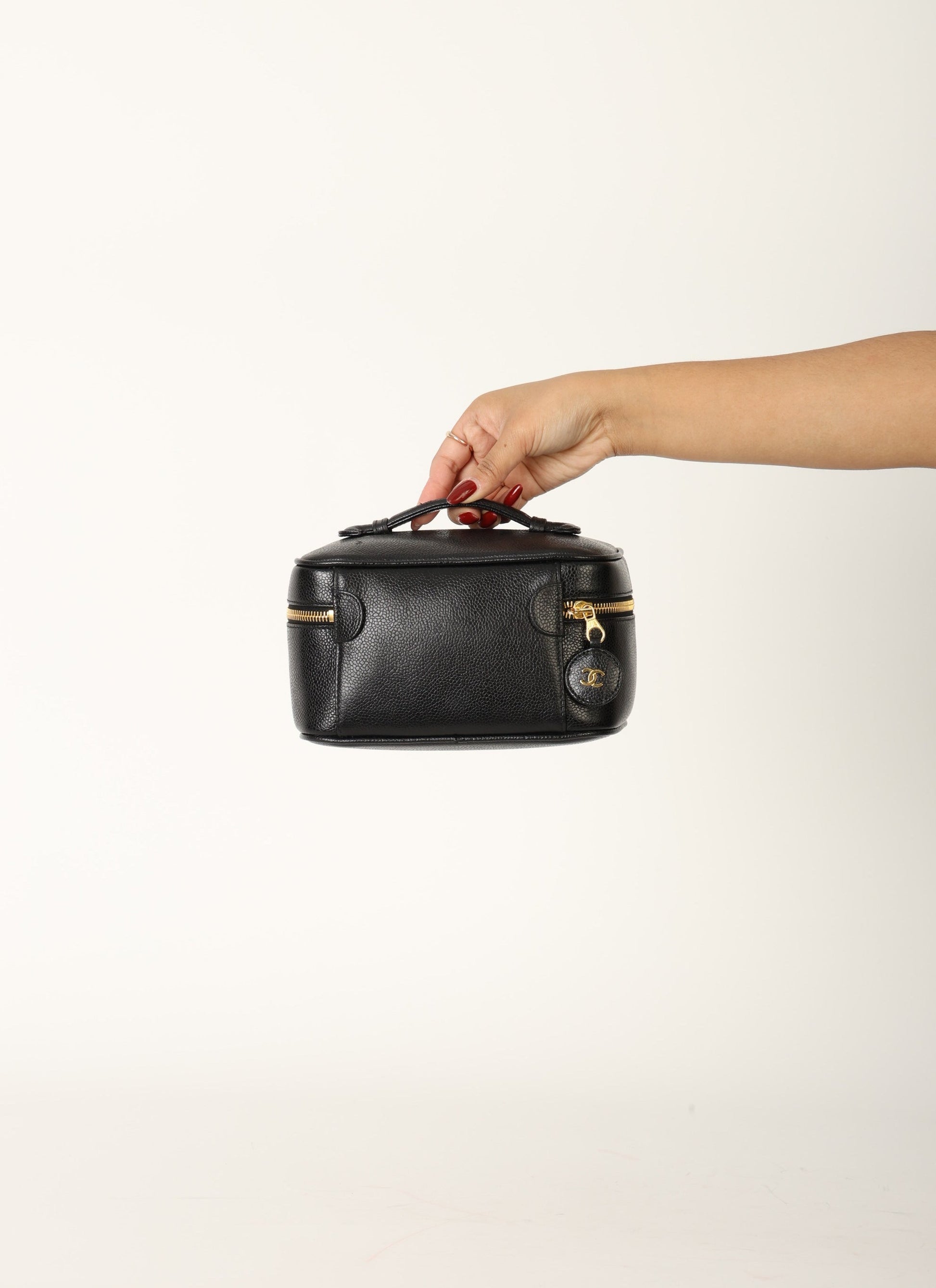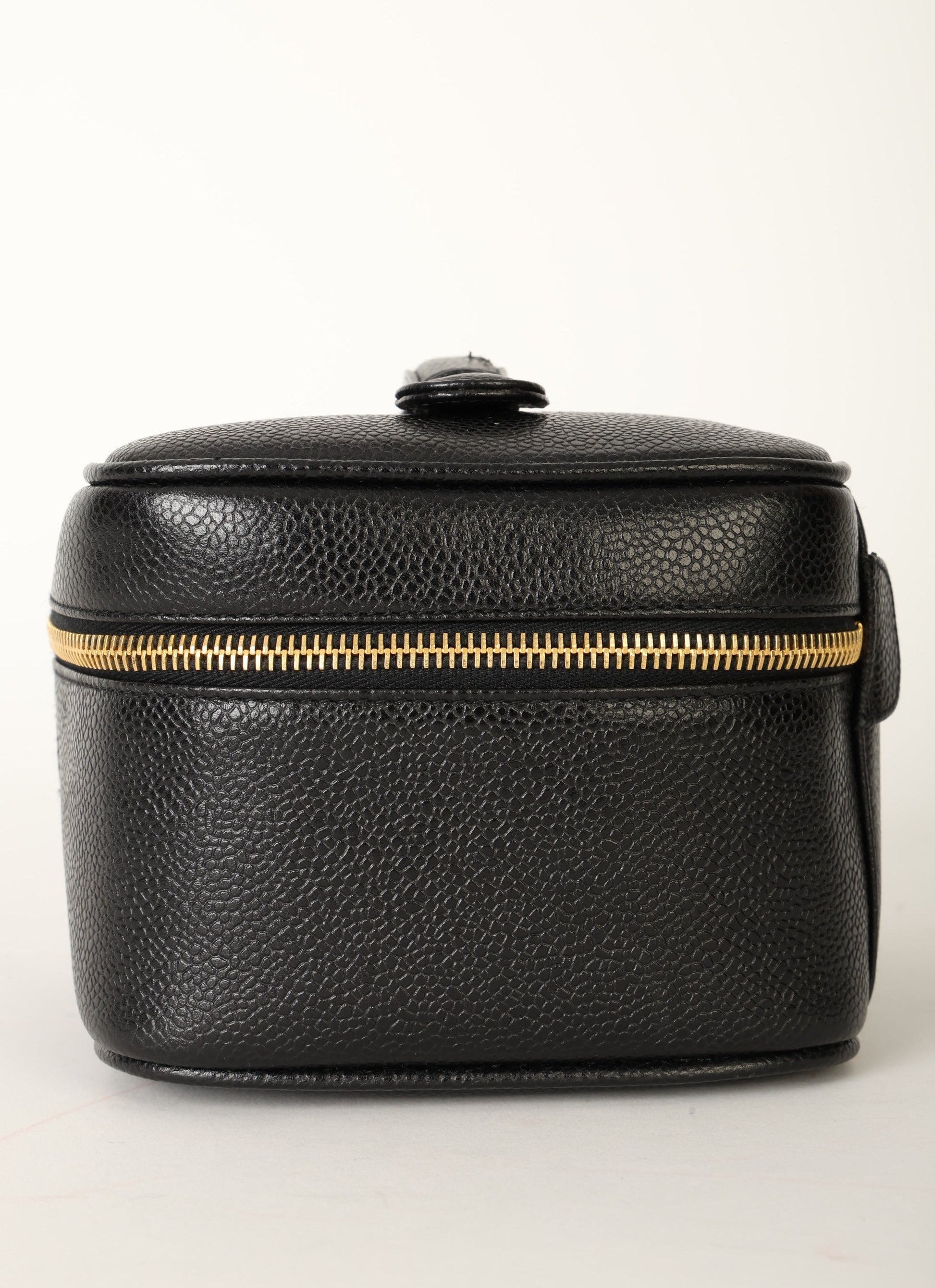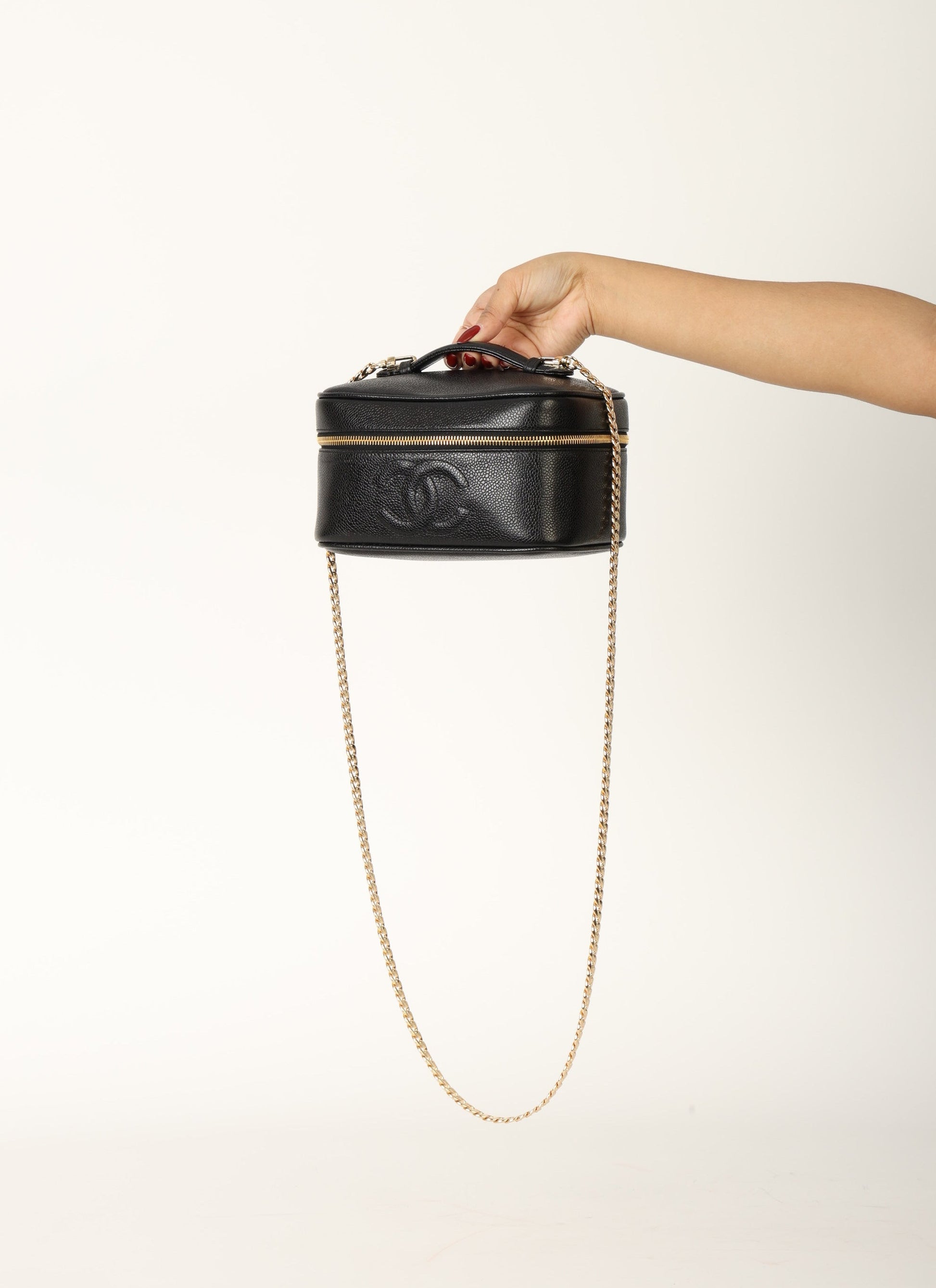 A vintage Chanel vanity bag, crafted in caviar that can be used in such versatile ways!?Features?an iconic CC logo on the front, this bag can be as a top handle or add a generic chain (which we've included!) to use as a crossbody. Use this bag as a makeup bag or to fit your everyday essentials! Can fit your phone, wallet, sunglasses, keys, and a couple more of your small daily essentials.?