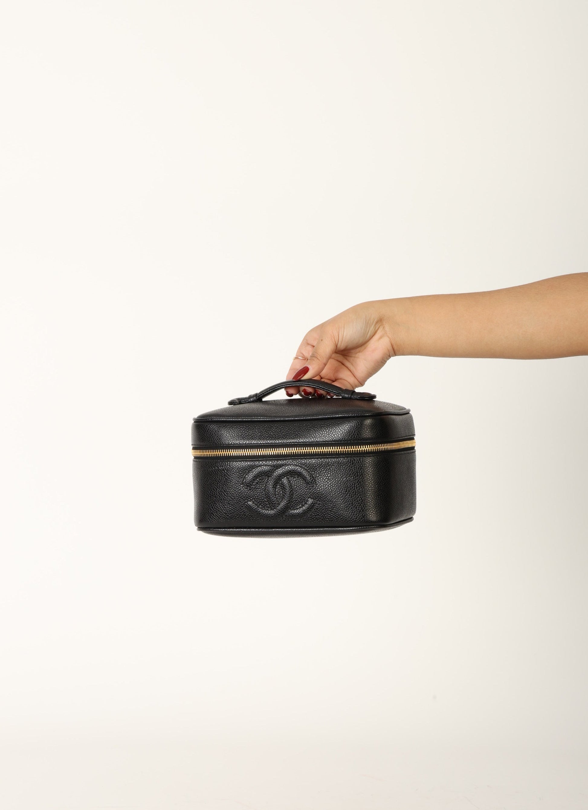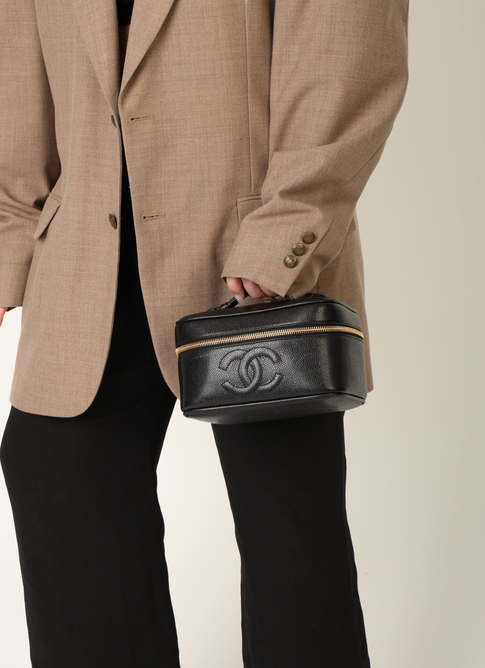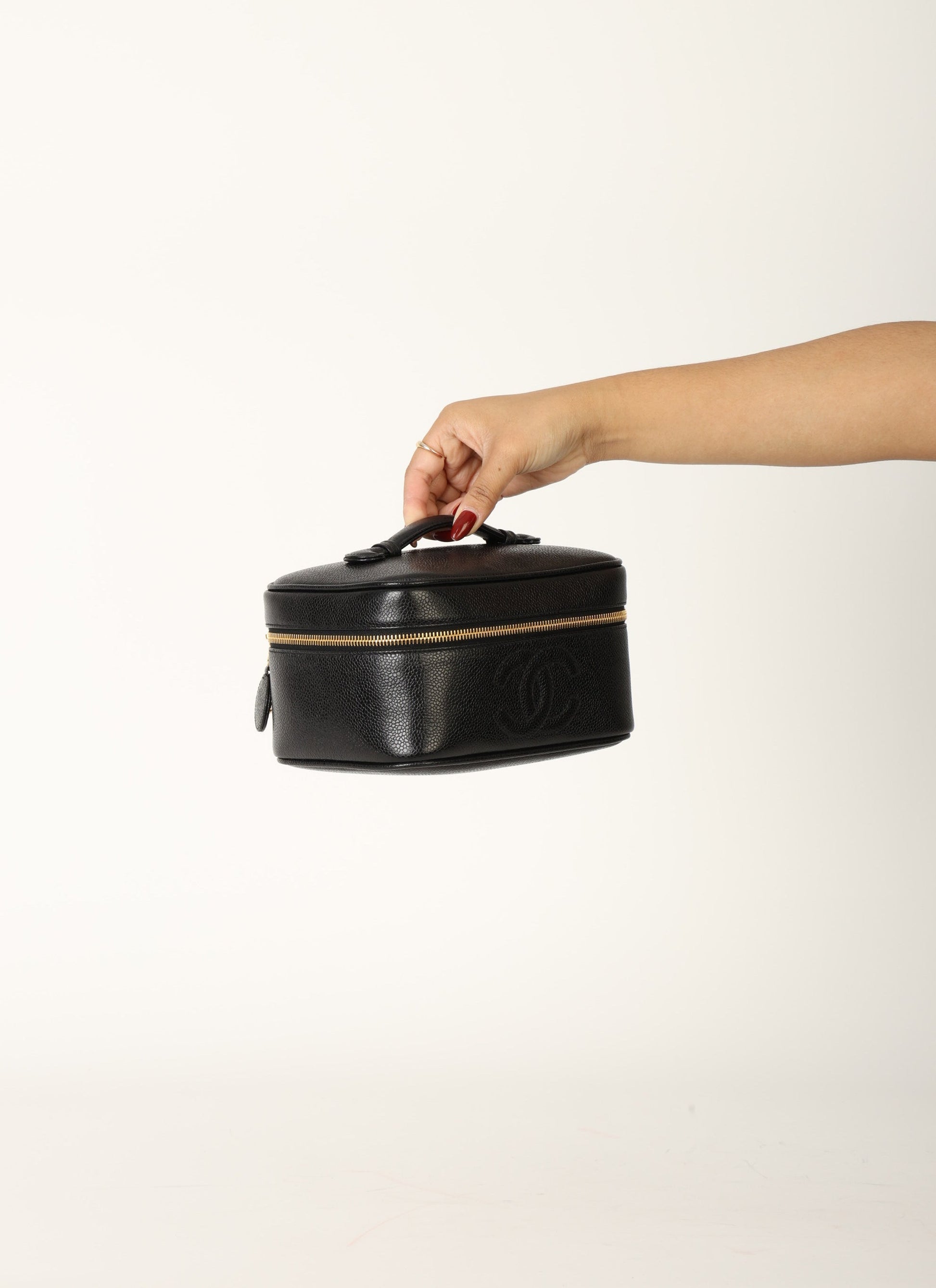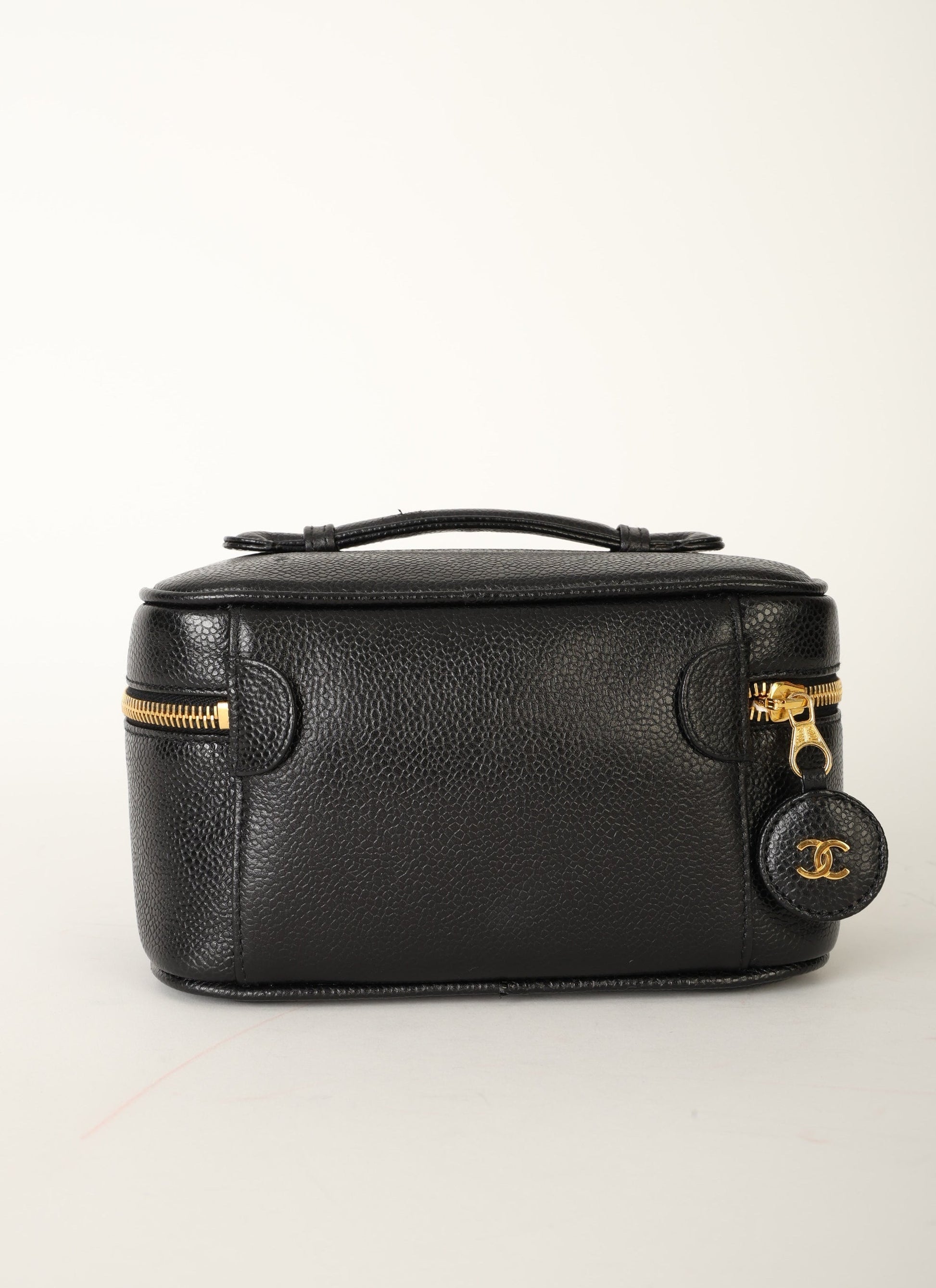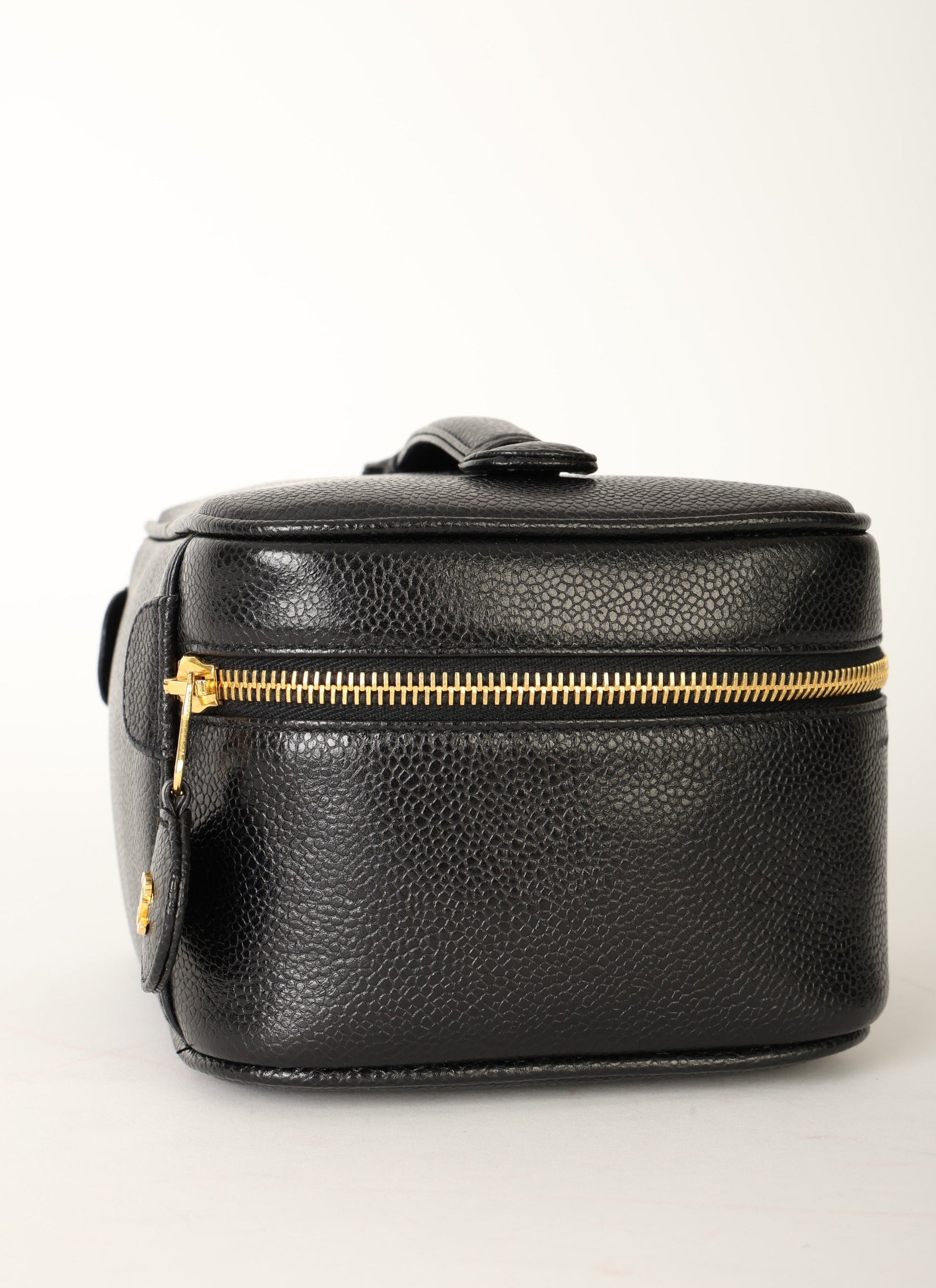 A vintage Chanel vanity bag, crafted in caviar that can be used in such versatile ways!?Features?an iconic CC logo on the front, this bag can be as a top handle or add a generic chain (which we've included!) to use as a crossbody. Use this bag as a makeup bag or to fit your everyday essentials! Can fit your phone, wallet, sunglasses, keys, and a couple more of your small daily essentials.?