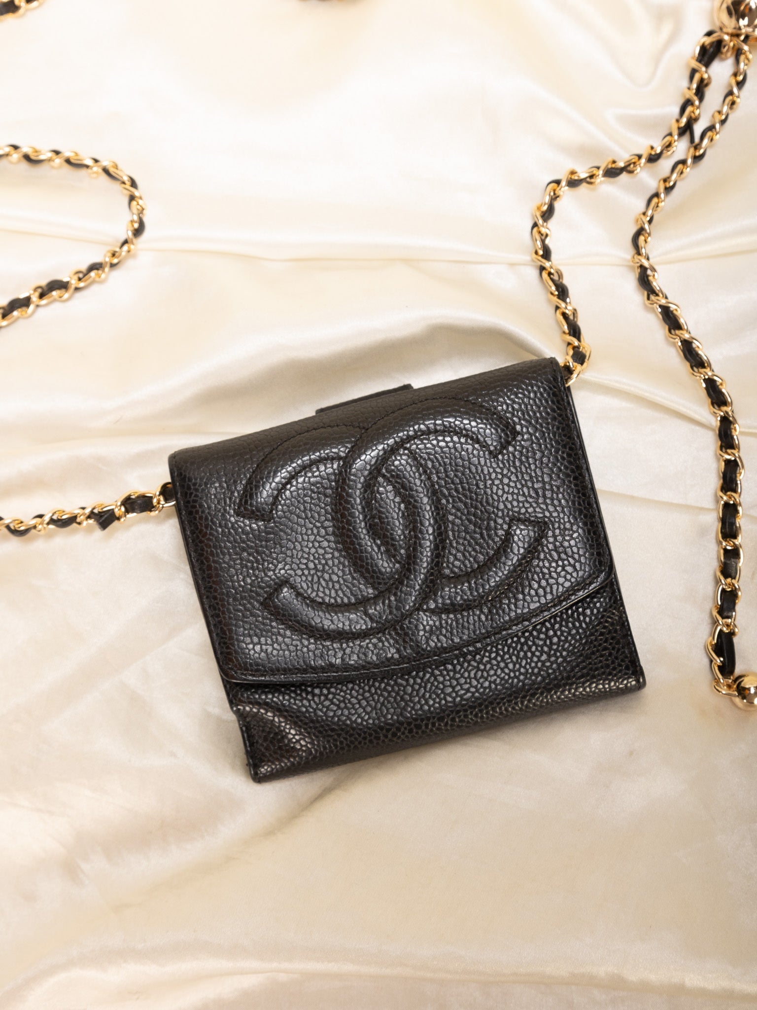 A beautiful vintage Chanel caviar wallet to use on the go! Has multiple compartments to store cash, cards, and more! Added a generic chain to wear as a crossbody or belt bag.
