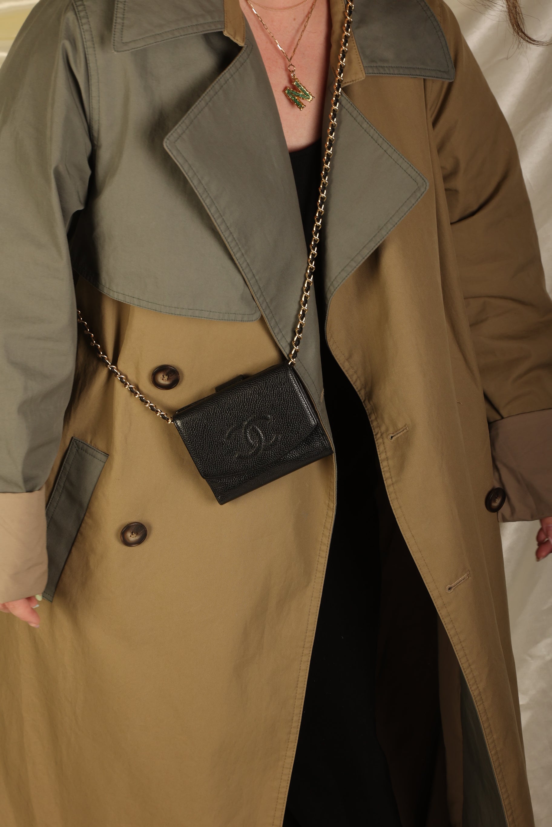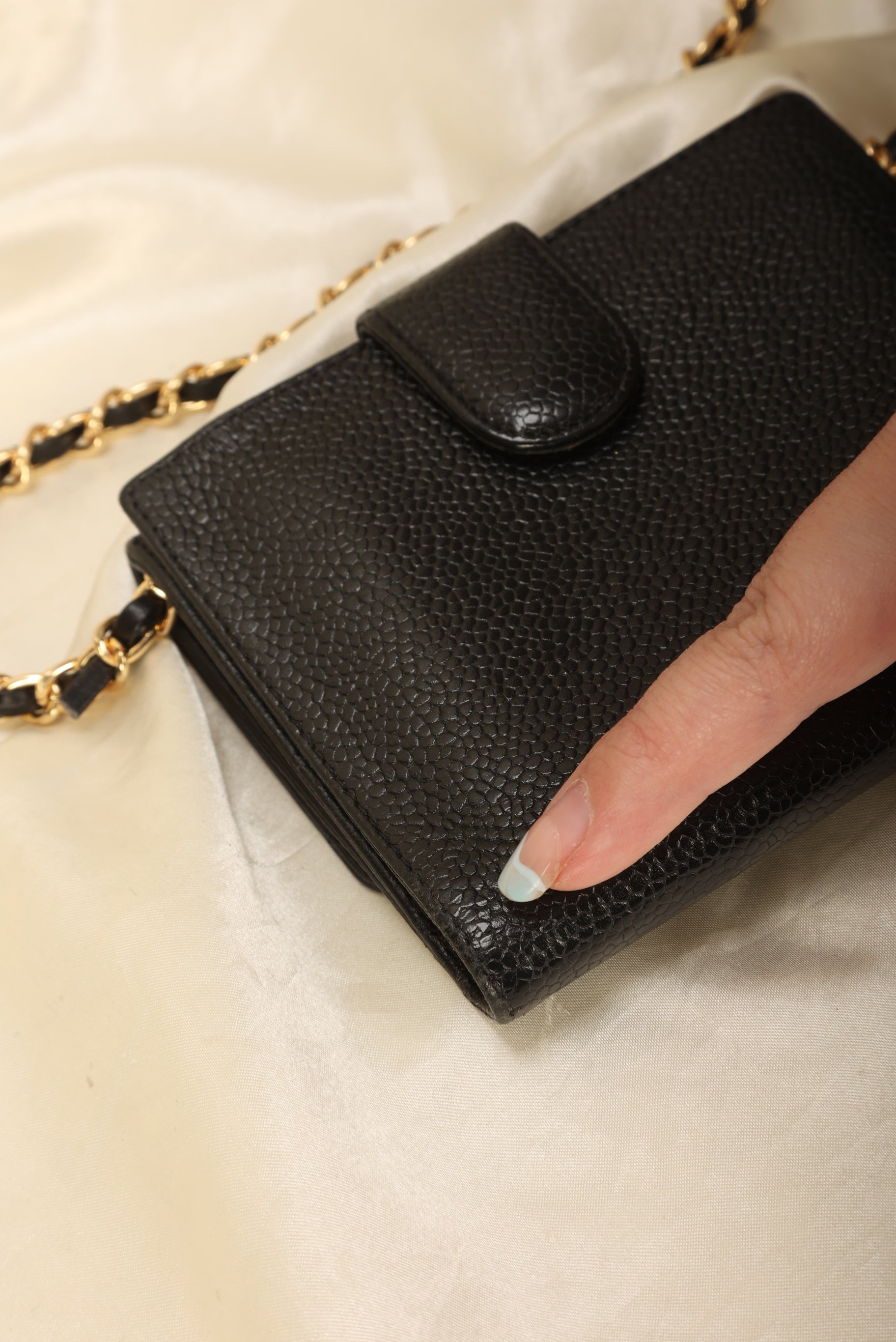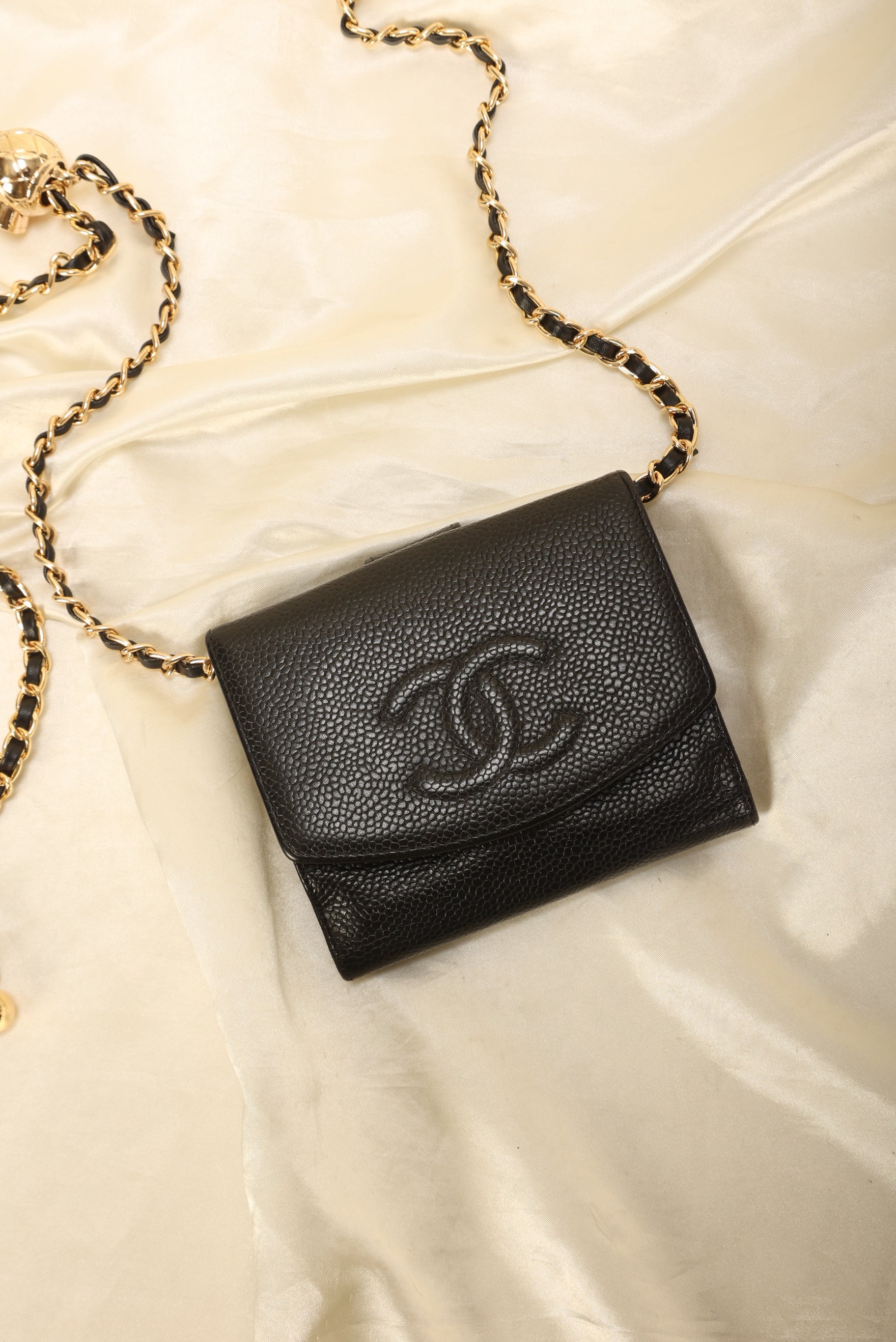 A beautiful vintage Chanel caviar wallet to use on-the-go. Has multiple compartments to store cash, cards, and more! Added a generic chain to wear as a crossbody or belt bag.