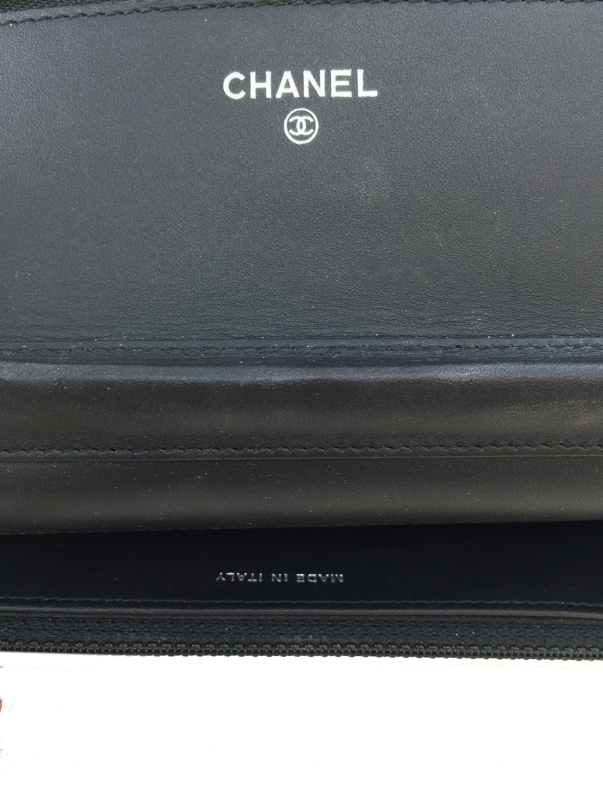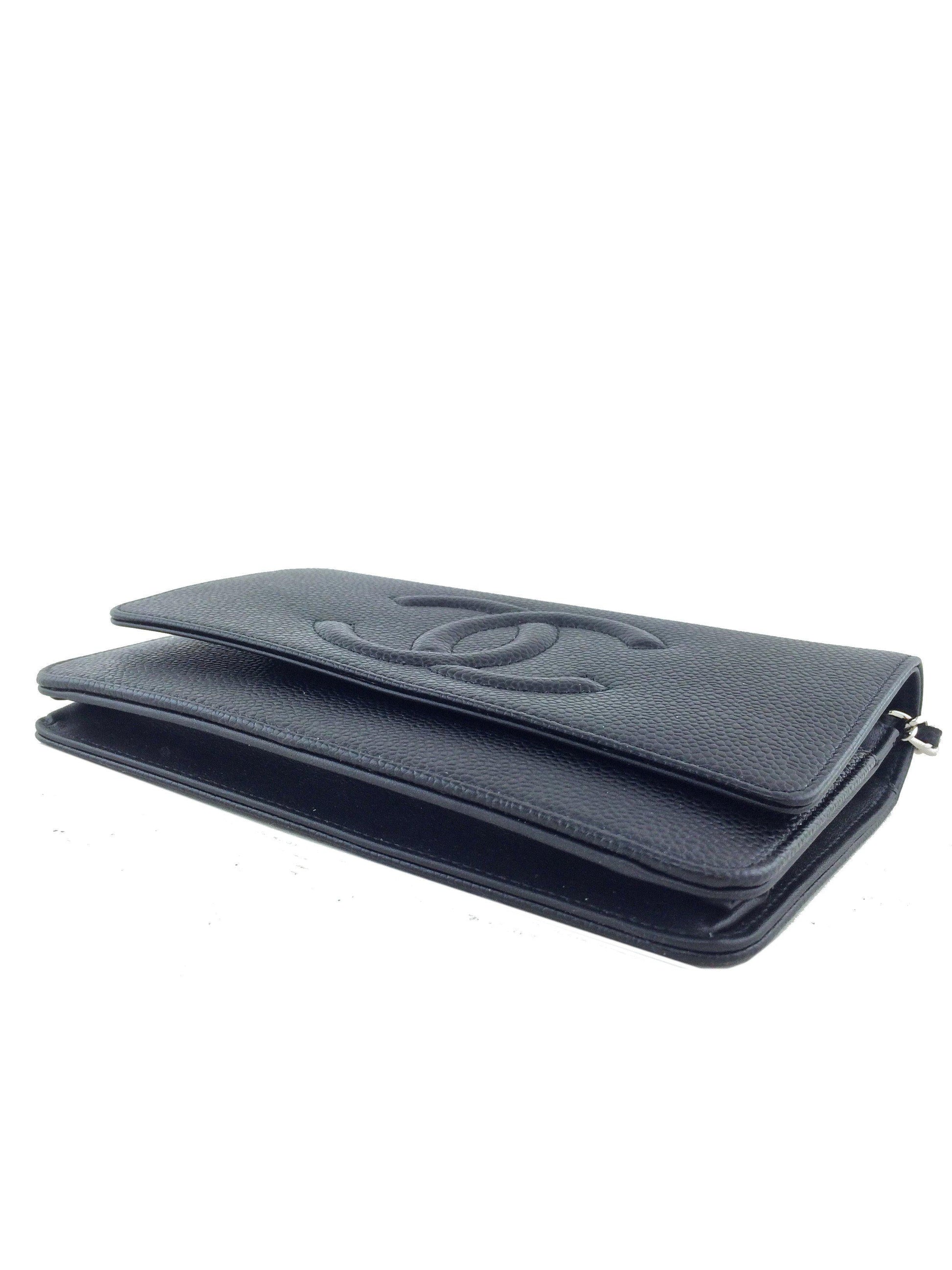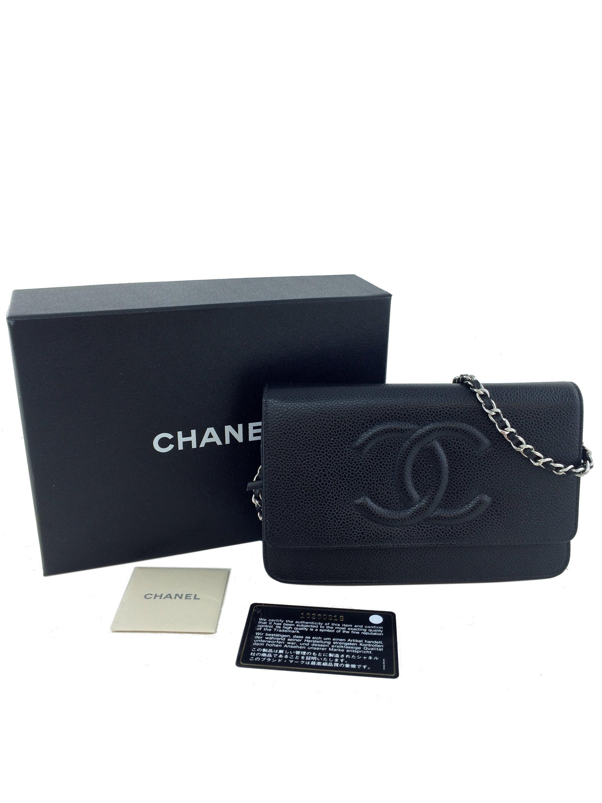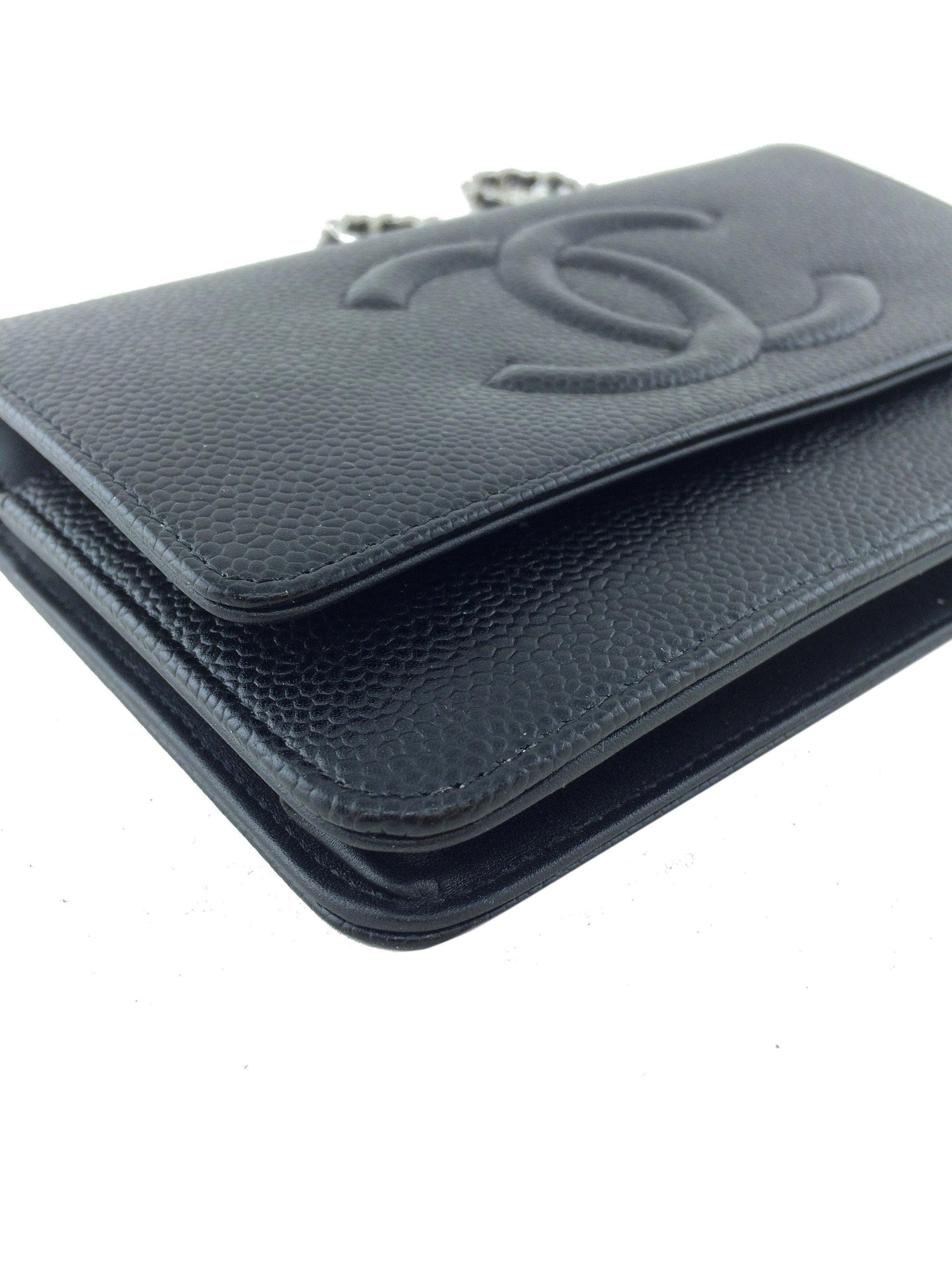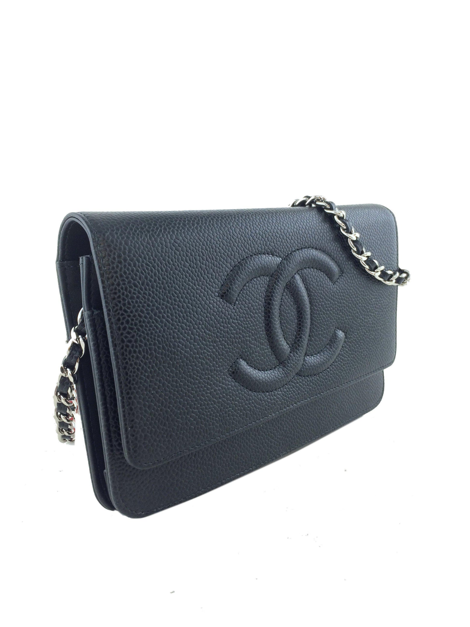 We the ity of this Chanel Caviar Wallet on Chain WOC Timeless Crossbody Bag crafted from Chanel's signature black caviar leather and silver-tone hardware.??This highly sought after bag features?a large tonal stitched CC logo at front with a long chain link and leather shoulder strap that has the option of being neatly tucked away and carried as a clutch. The front flap with snap closure opens to a functional interior of six credit card slots, one zip pocket and two open compartments.