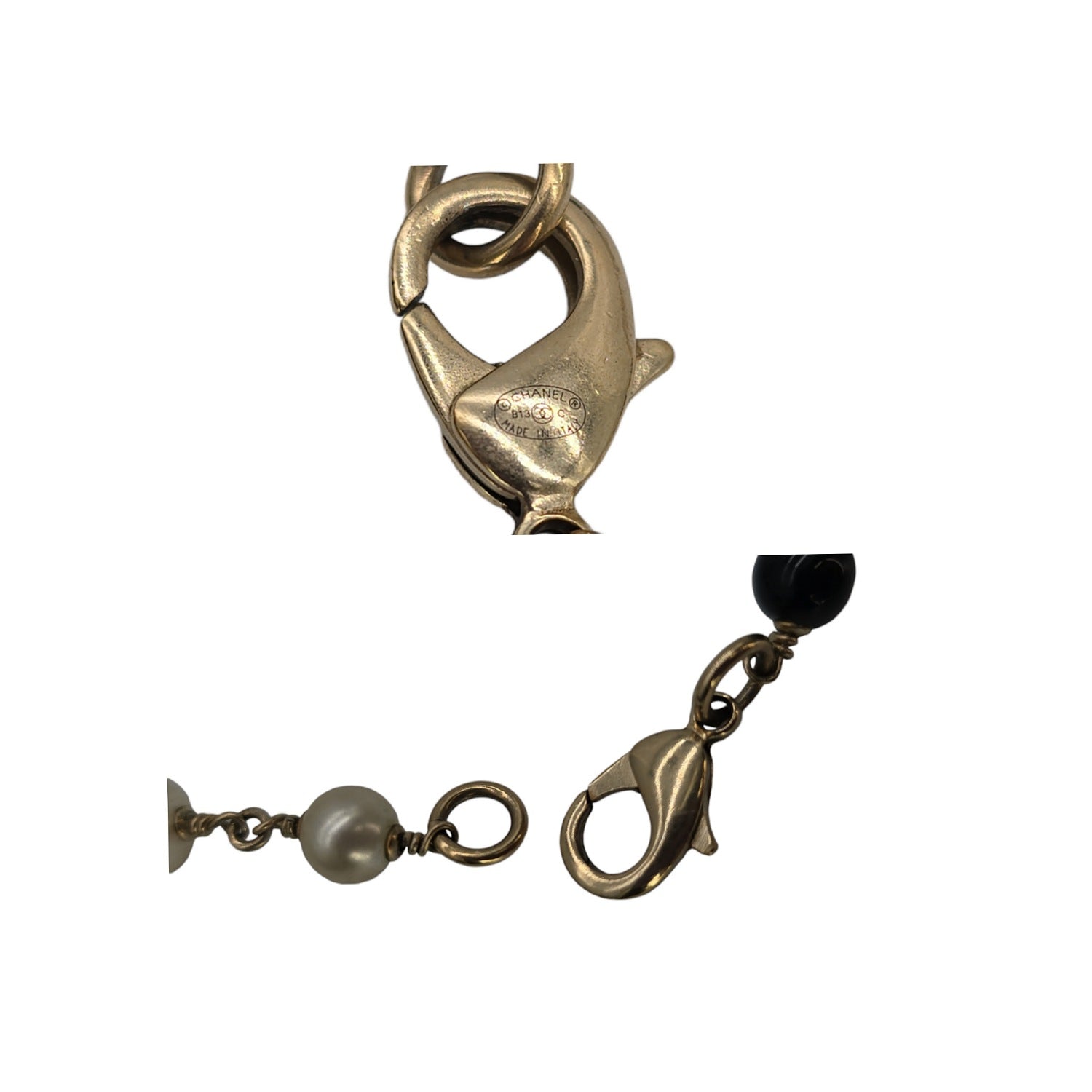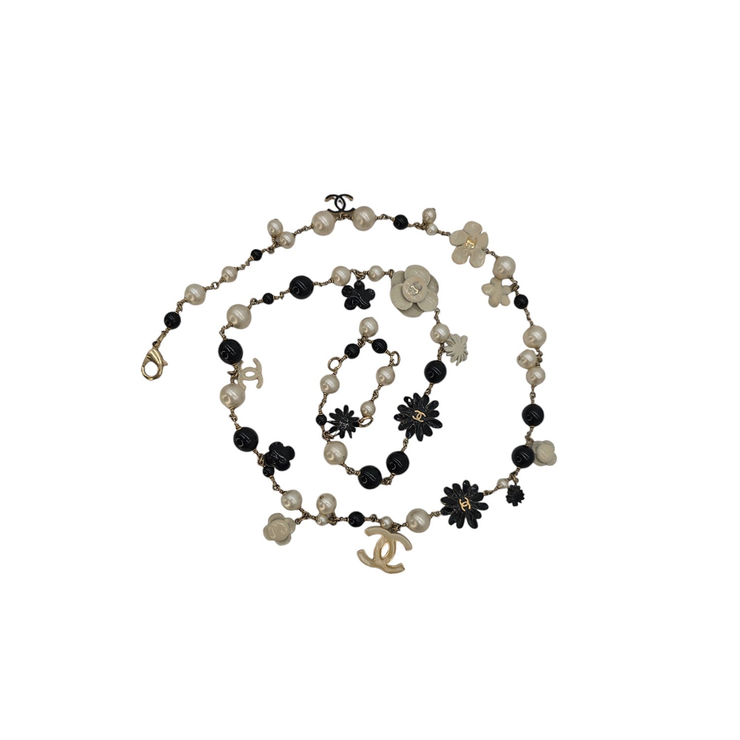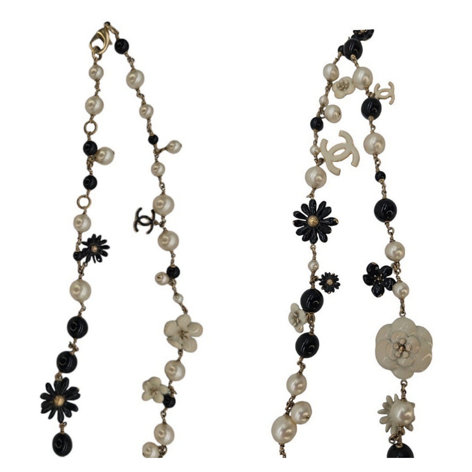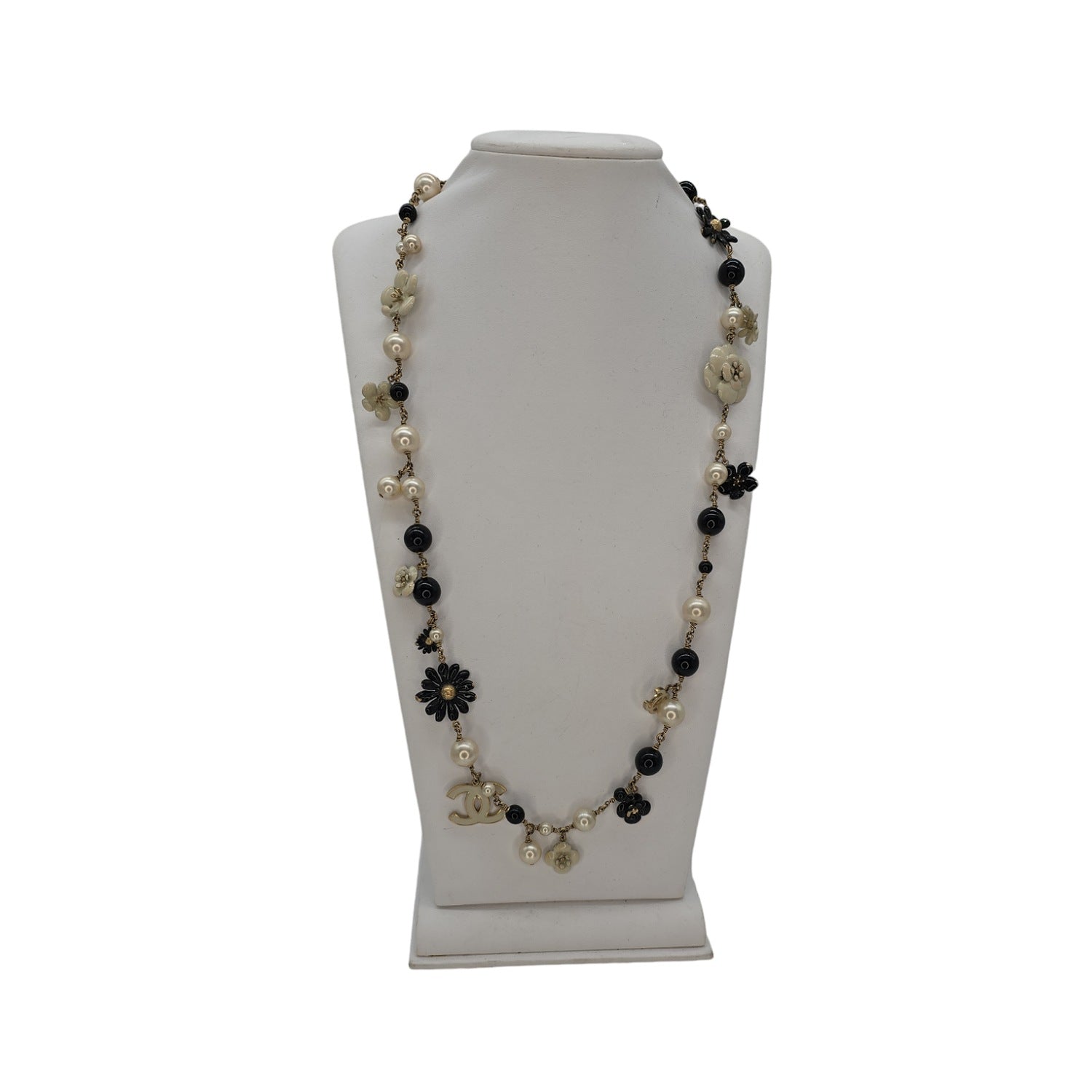 This iconic Chanel necklace features black beads, faux pearls, and aged gold-Tone enamel ted hardware. With the timeless 'CC' logos and flowers, it makes a statement at 36" in length. An excellent addition to your Chanel collection, this necklace exudes elegance and sophistication.