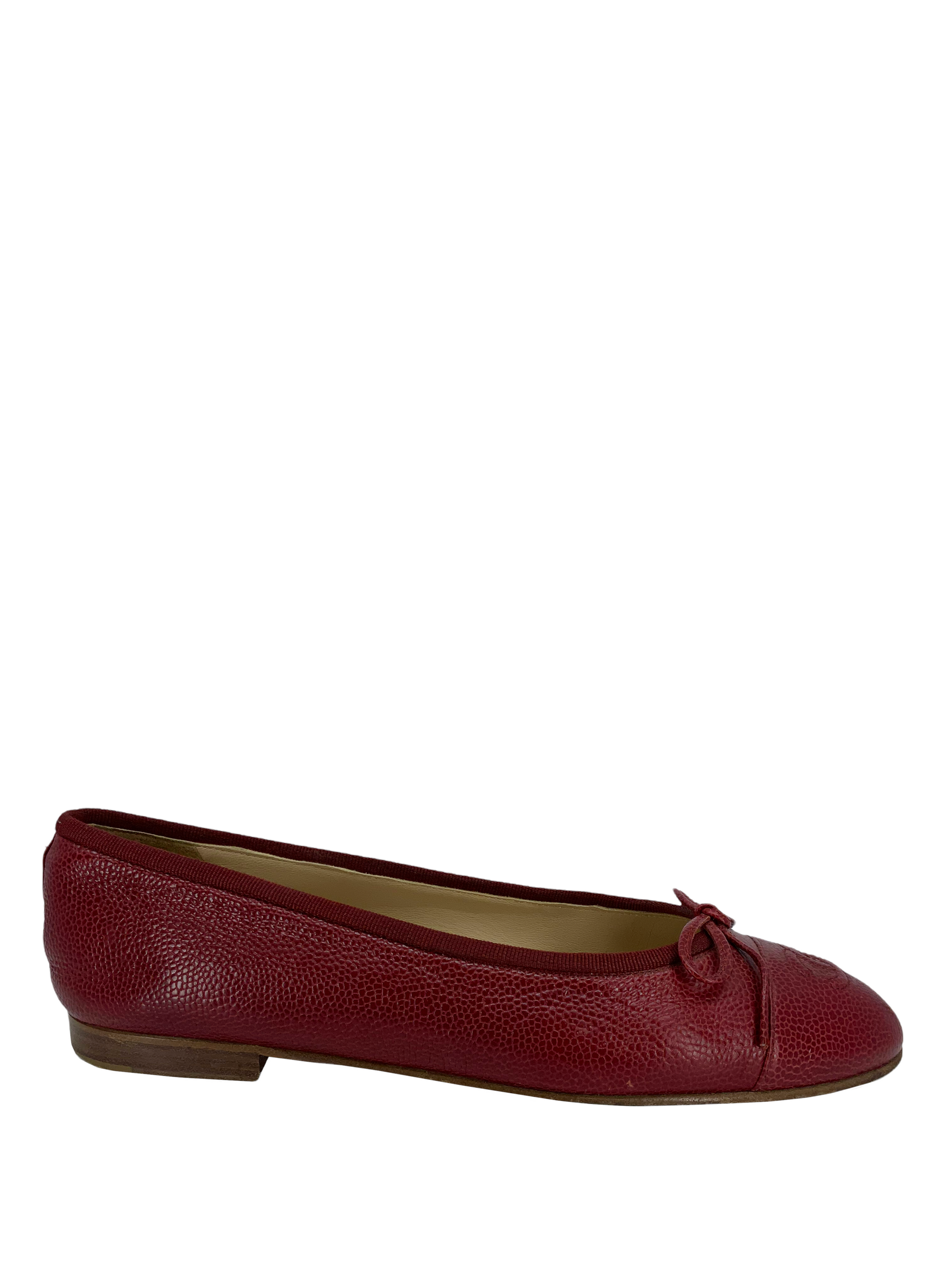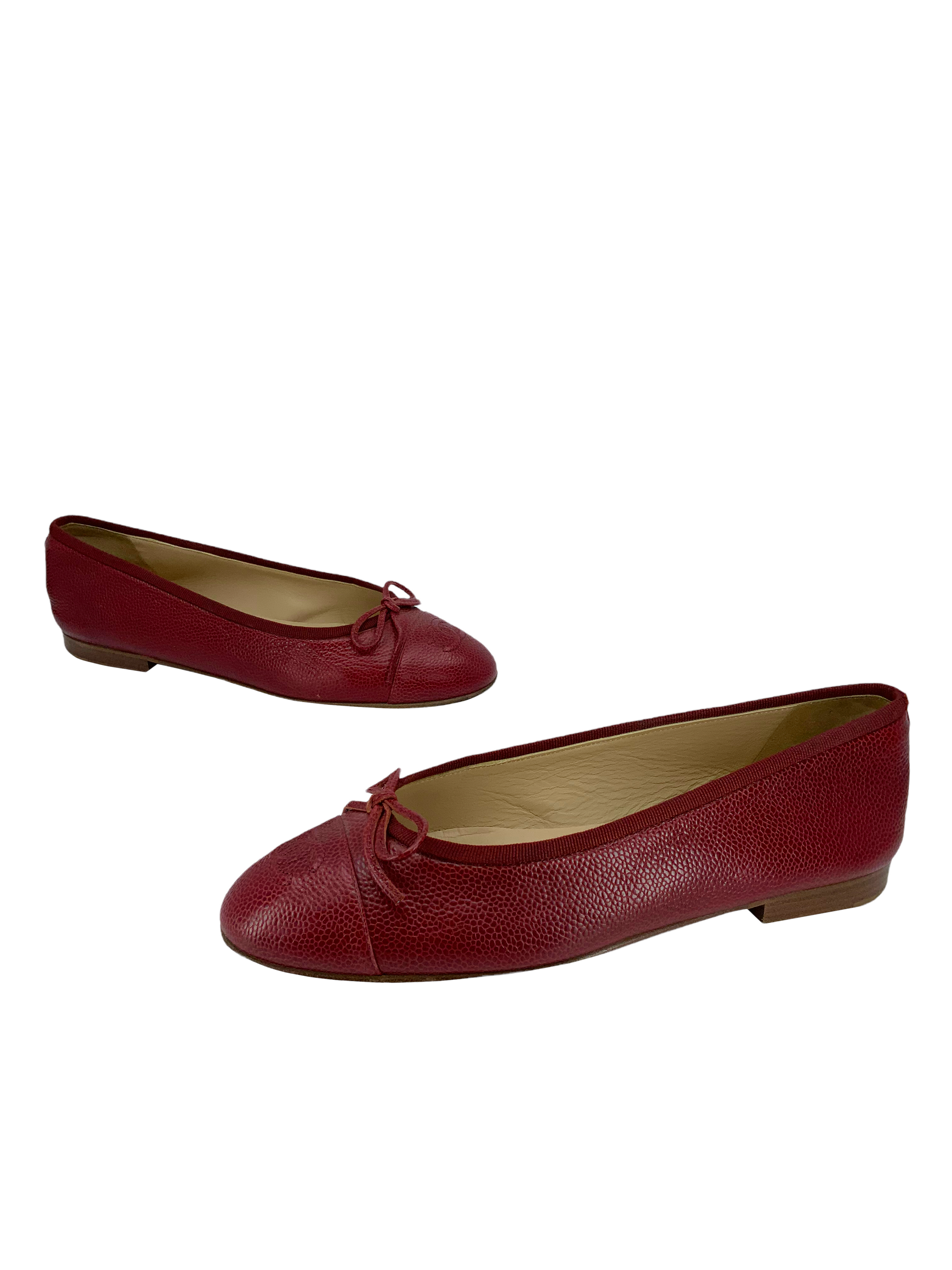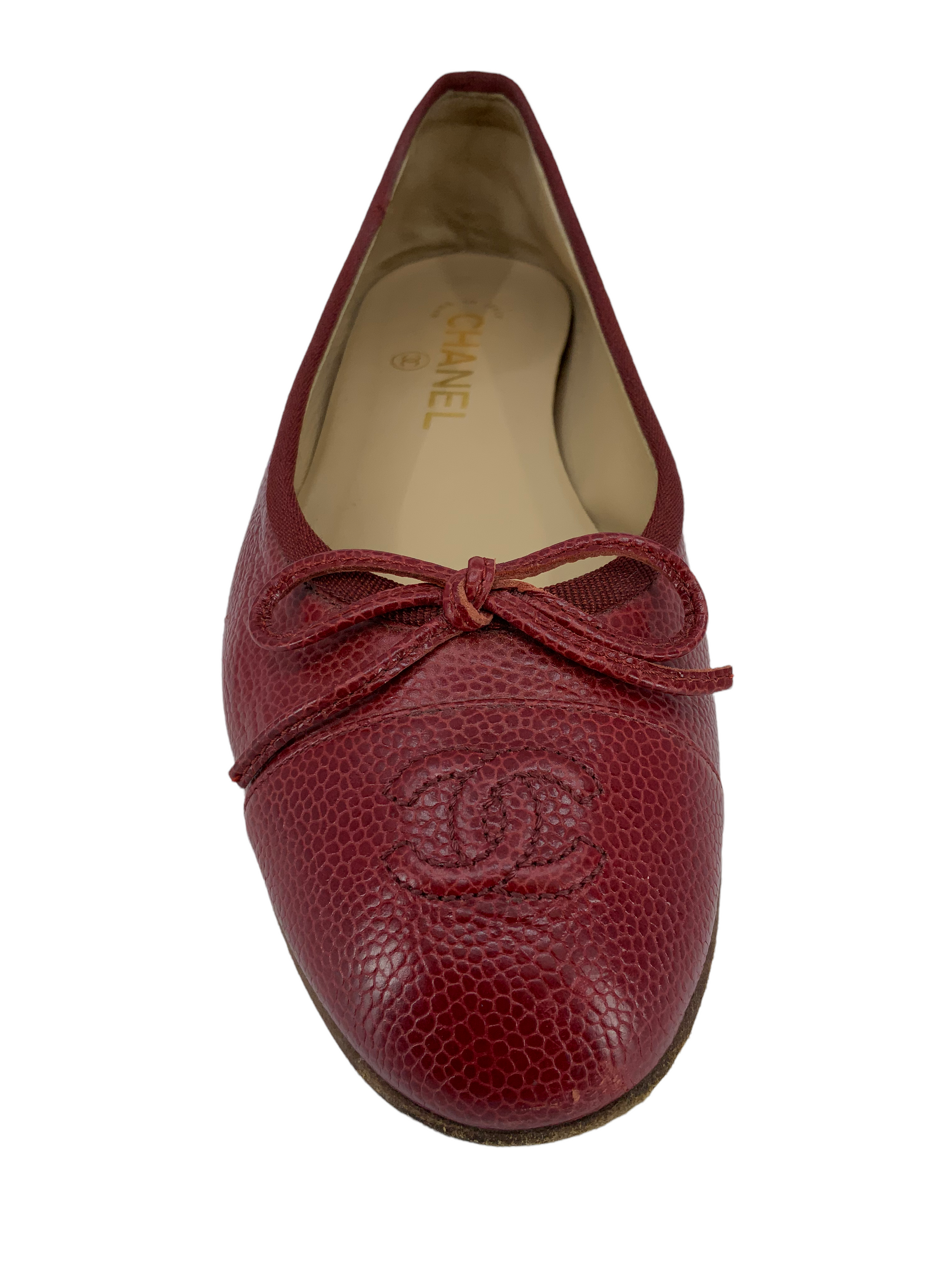 Step out in style with these classic Chanel CC Cap Toe Caviar Leather Ballet Flats Size 7.5?(IT 37.5) crafted from?classic red caviar?leather. Featuring a matching tonal leather 'CC' logo cap-toe?with a bow tie accent?on the vamp.