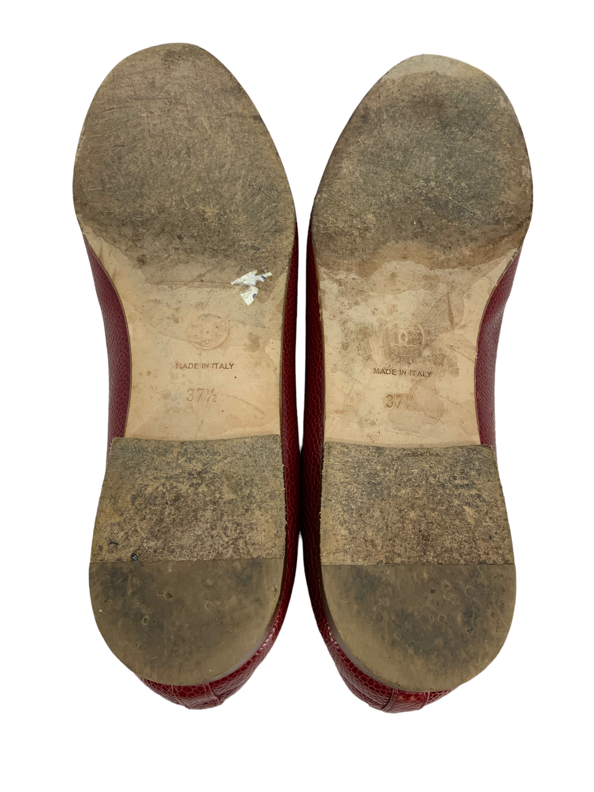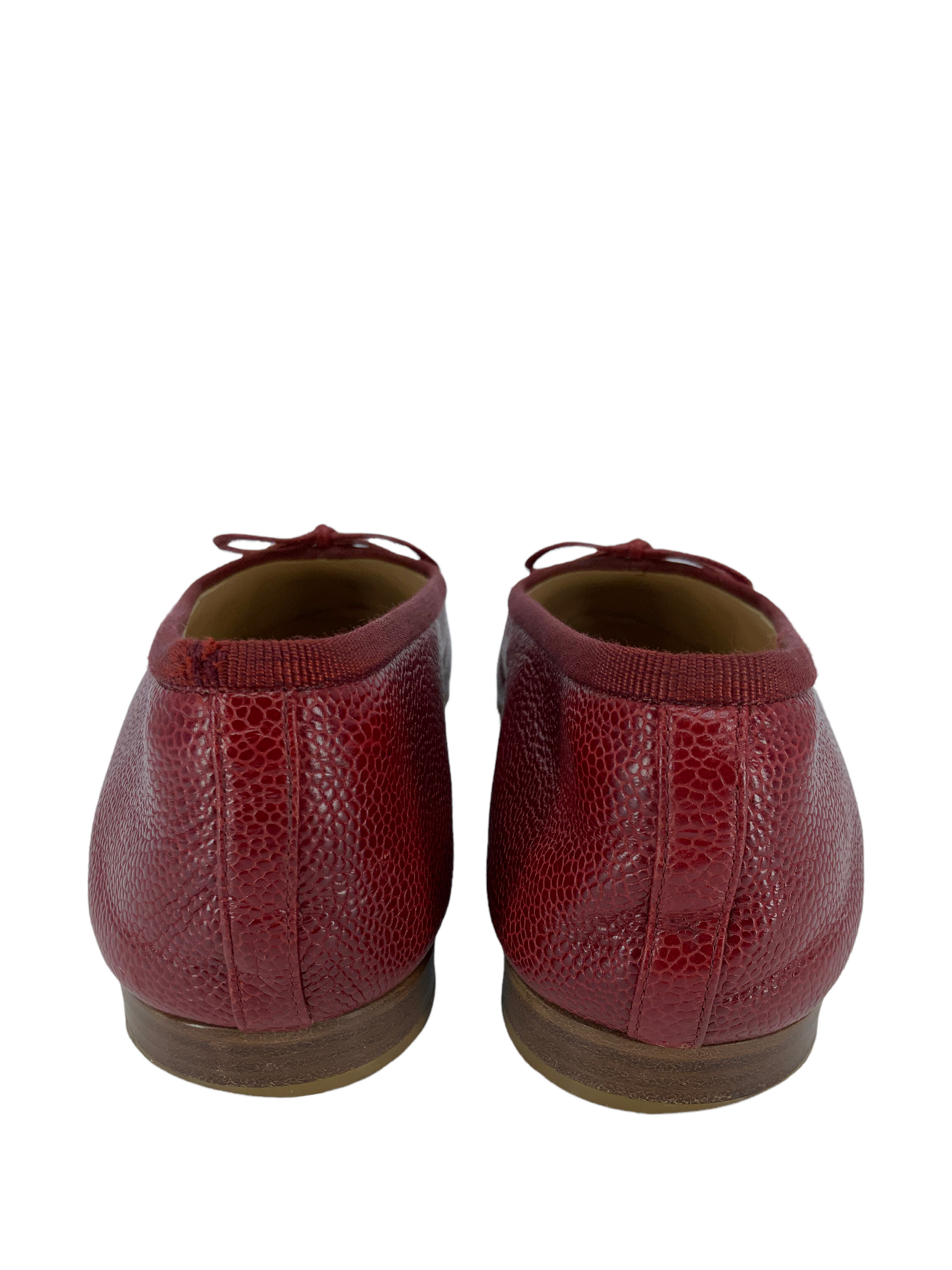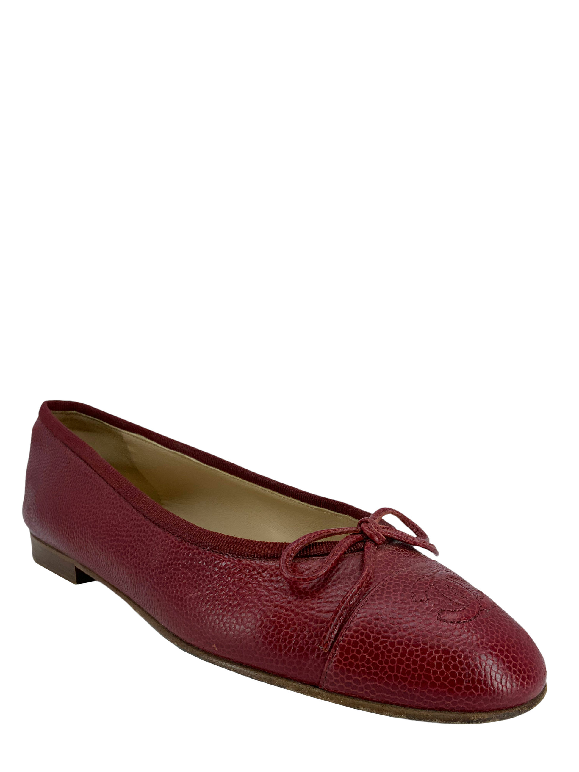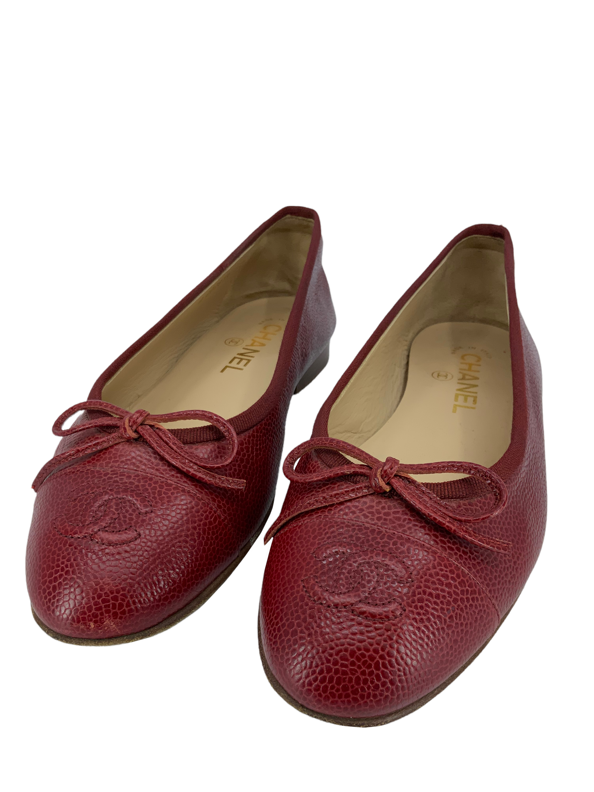 Step out in style with these classic Chanel CC Cap Toe Caviar Leather Ballet Flats Size 7.5?(IT 37.5) crafted from?classic red caviar?leather. Featuring a matching tonal leather 'CC' logo cap-toe?with a bow tie accent?on the vamp.