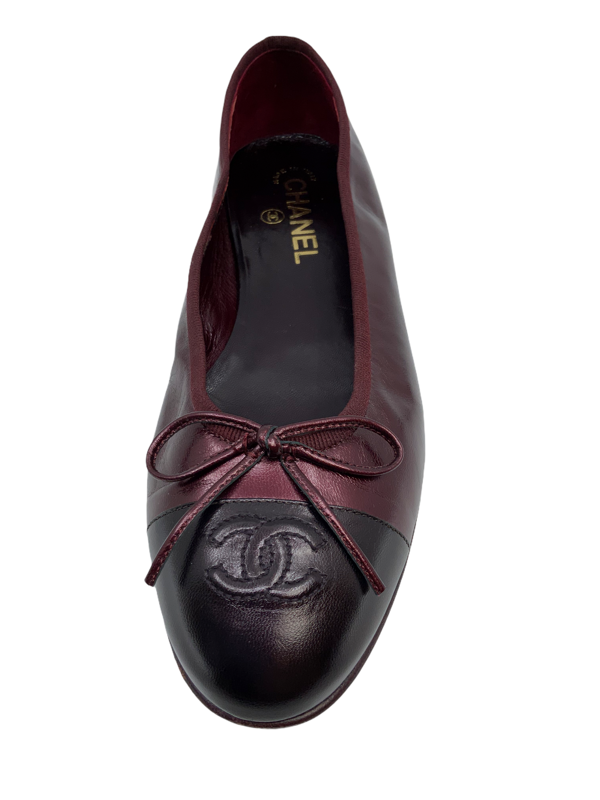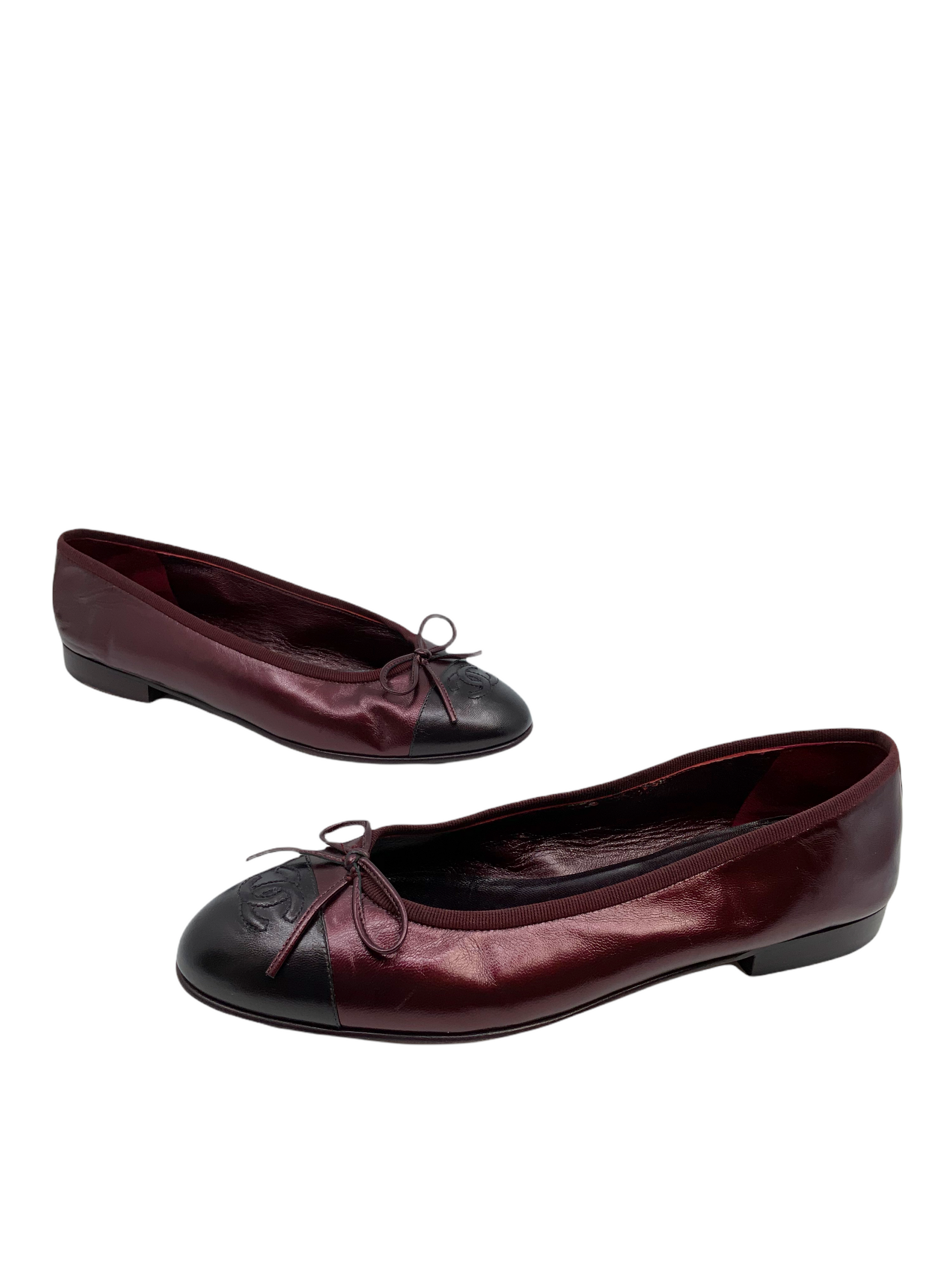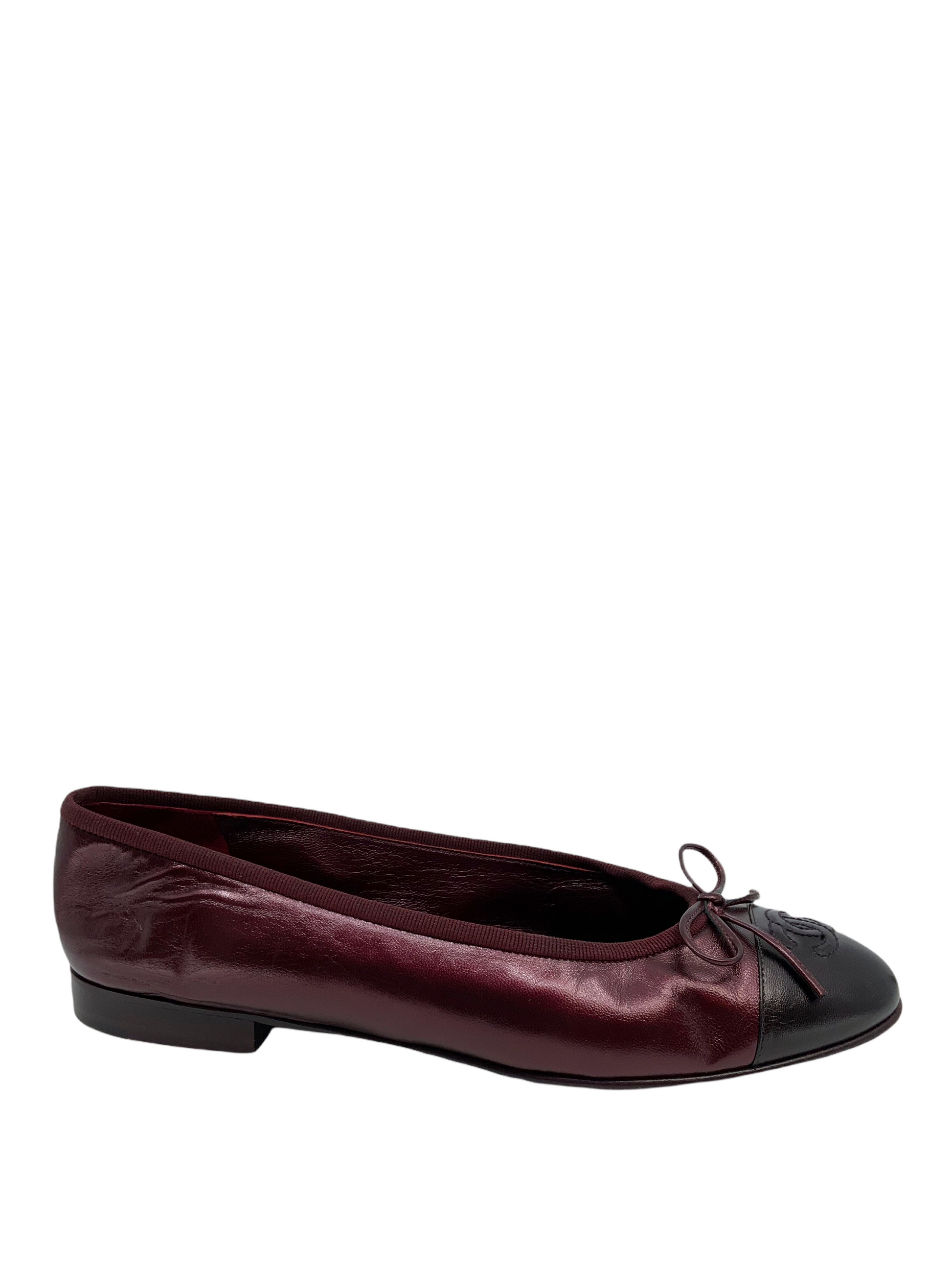 Step out in style with these classic Chanel CC Cap Toe Lambskin Leather Ballet Flats Size 8 (IT 38) crafted from?supple burgundy?lambskin.?Featuring a black?leather CC logo cap-toe?with a bow tie accent?on the vamp.?