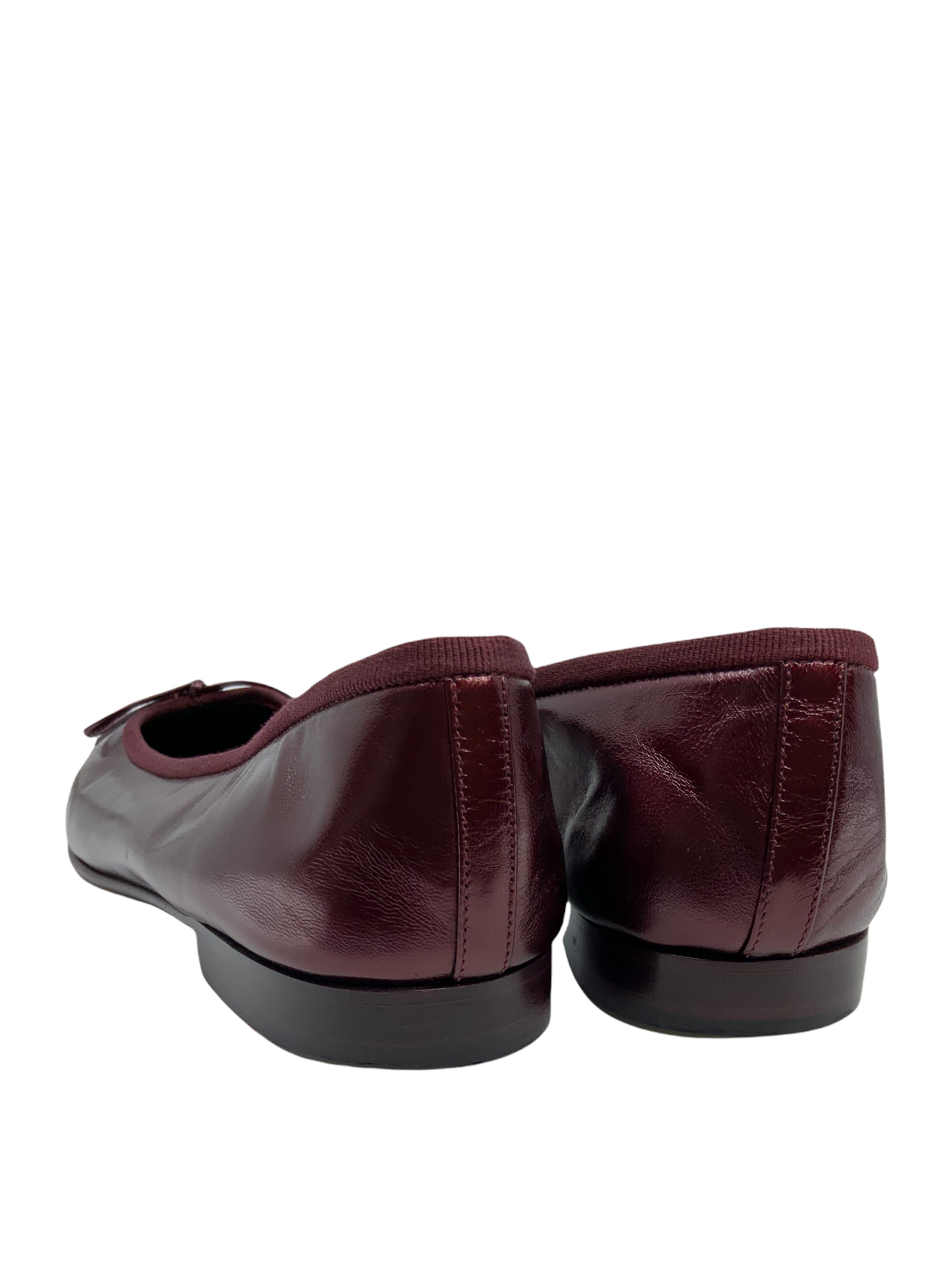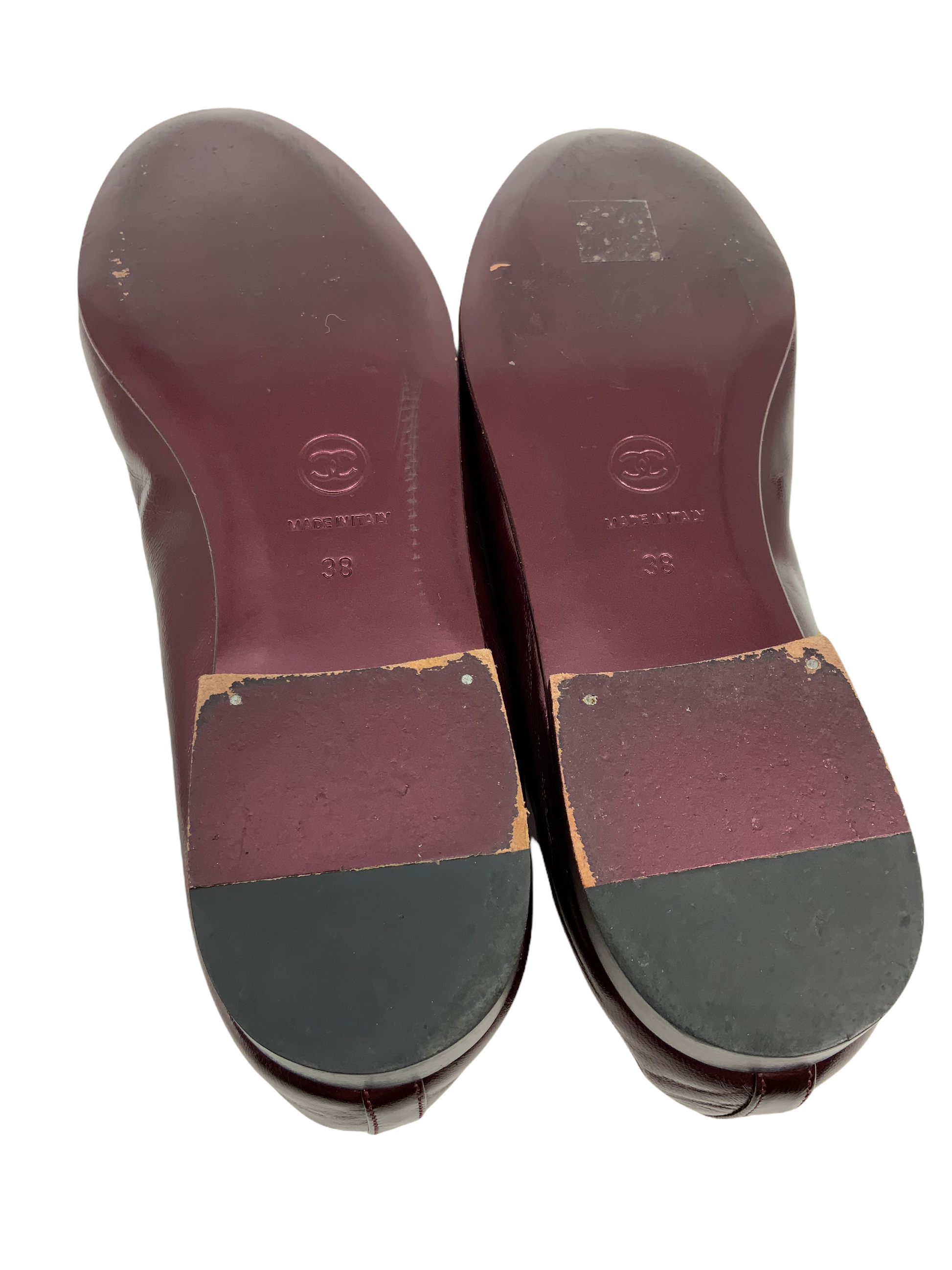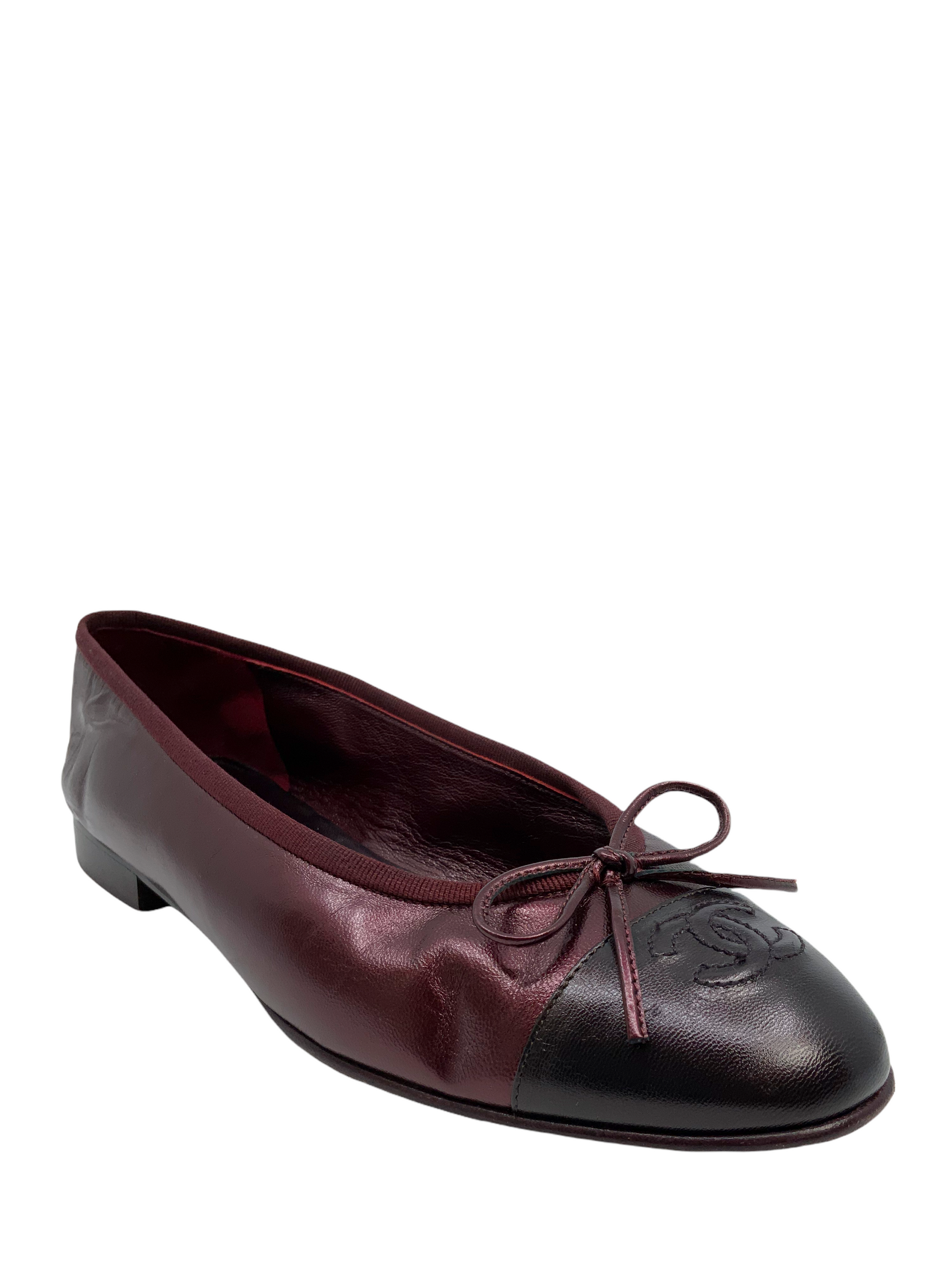 Step out in style with these classic Chanel CC Cap Toe Lambskin Leather Ballet Flats Size 8 (IT 38) crafted from?supple burgundy?lambskin.?Featuring a black?leather CC logo cap-toe?with a bow tie accent?on the vamp.?