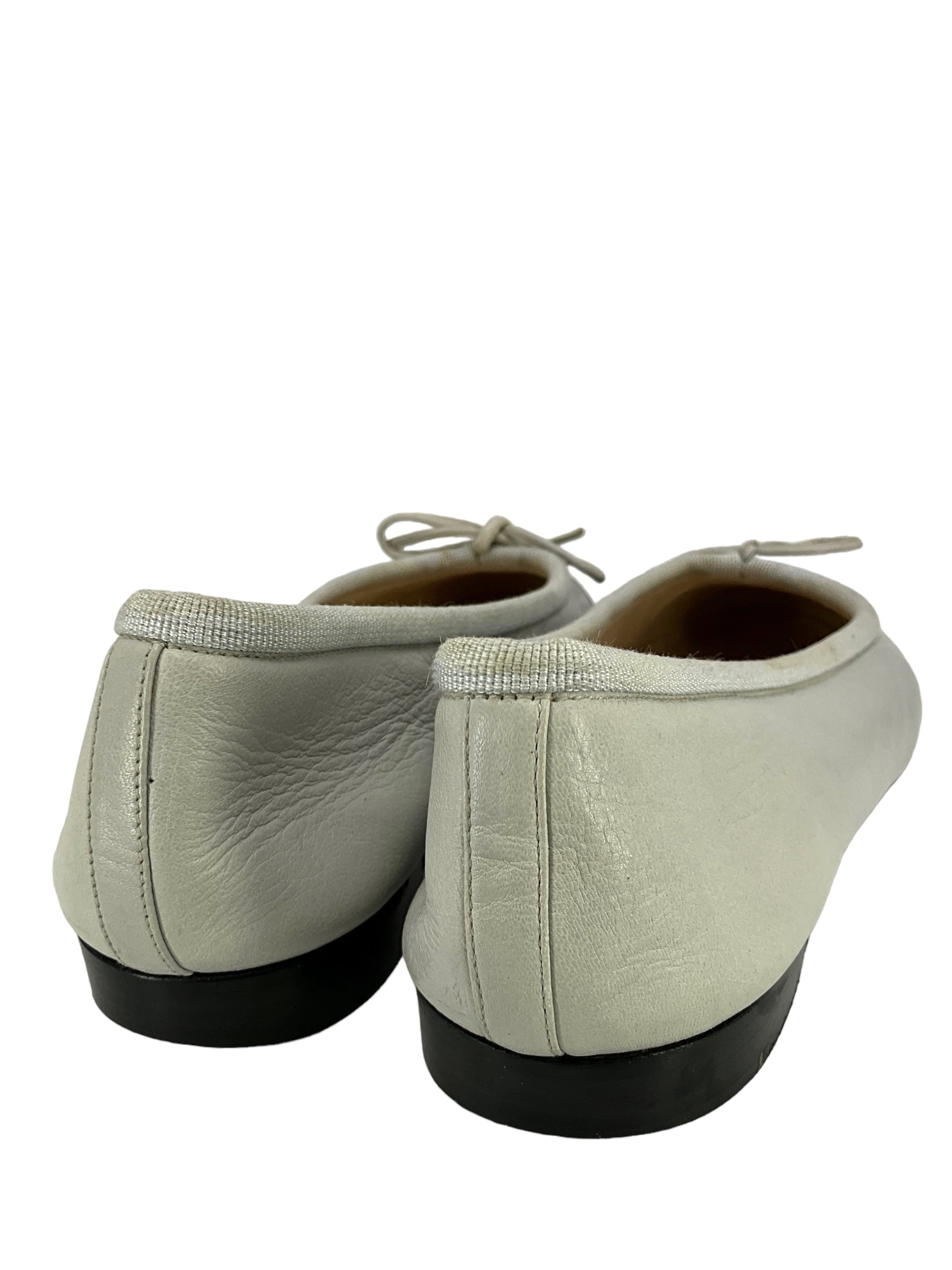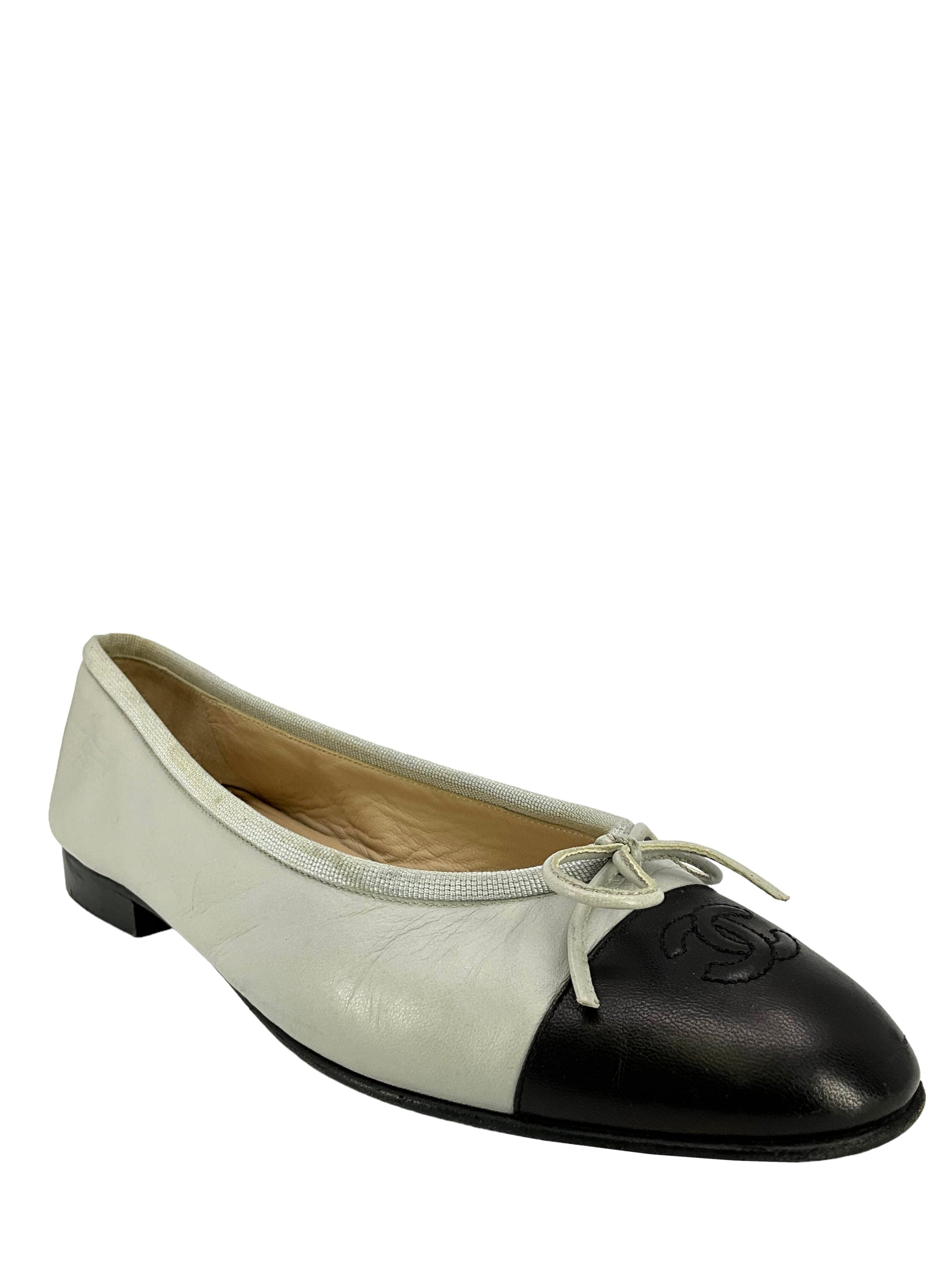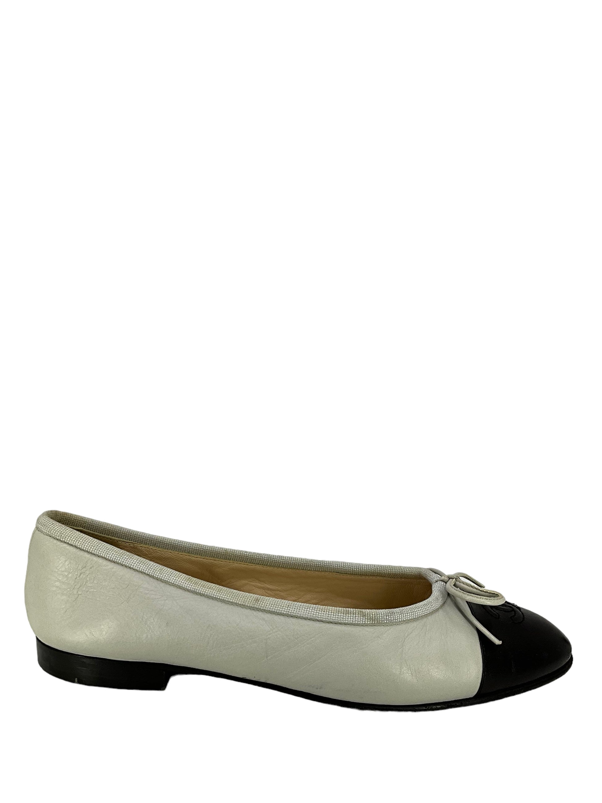 Step out in style with these classic CHANEL CC Cap Toe Lambskin Leather Ballet Flats Size 8 (IT 38 crafted from supple light gray lambskin. Featuring a black patent leather cap-toe with a signature CC logo bow tie accent on the vamp.