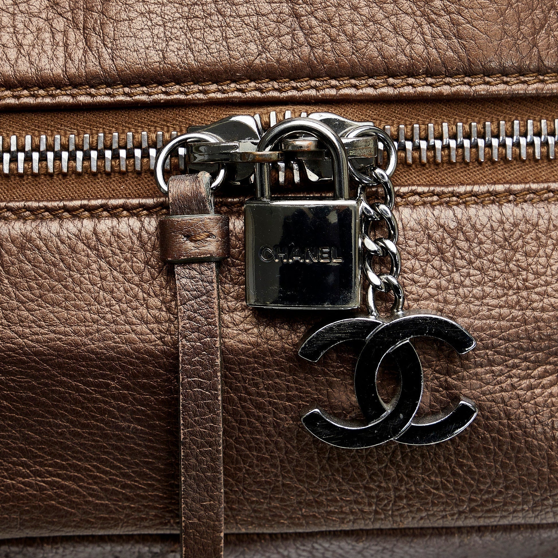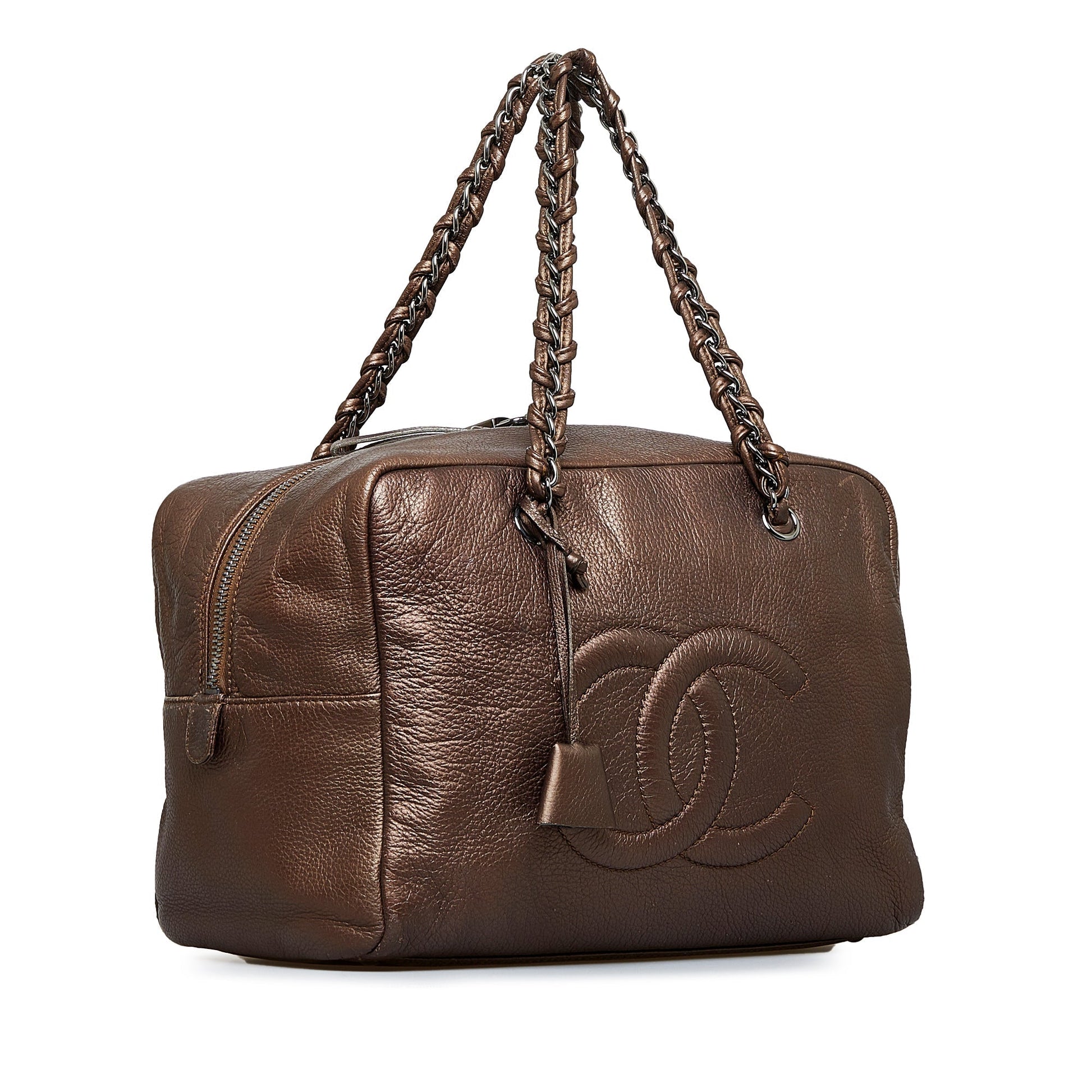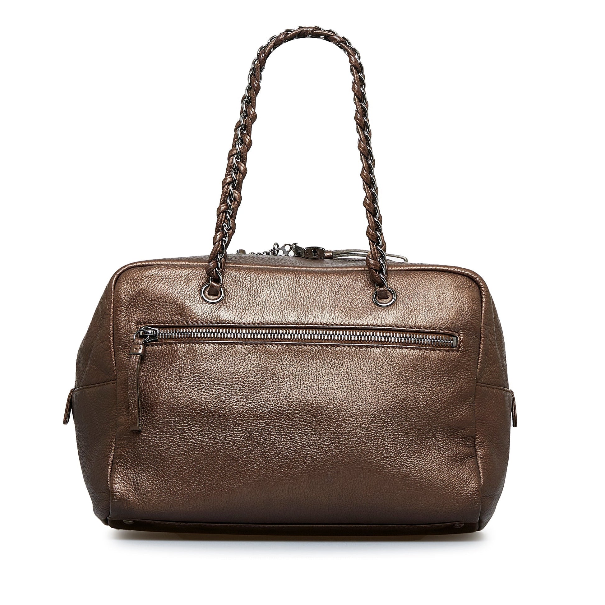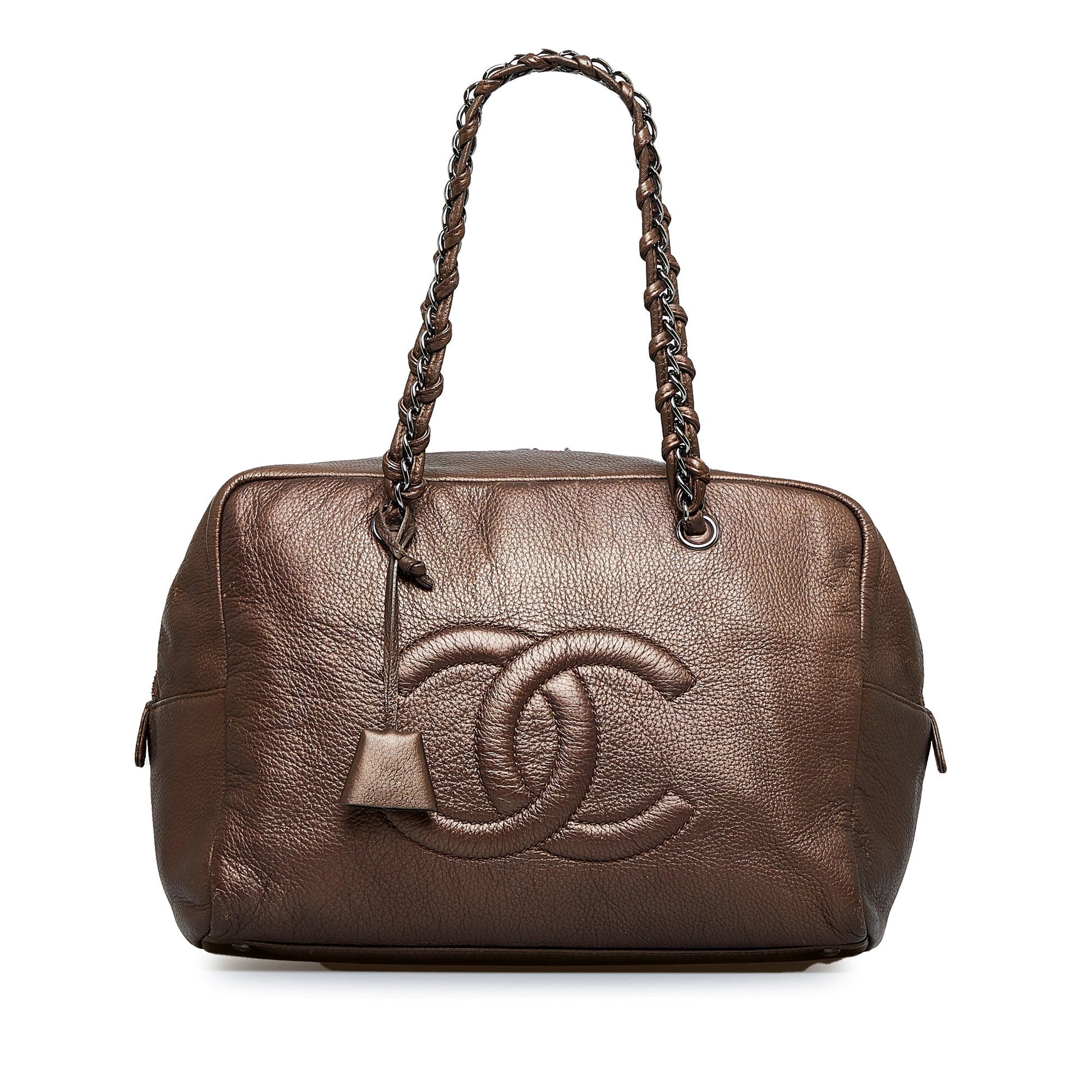 This Chanel CC Chain Tote Bag features a brown lambskin leather body with braided leather chain straps with silver-tone details, an exterior zippered compartment, a top zipper closure, and an interior zippered compartment. The Bag is best worn over the shoulder.