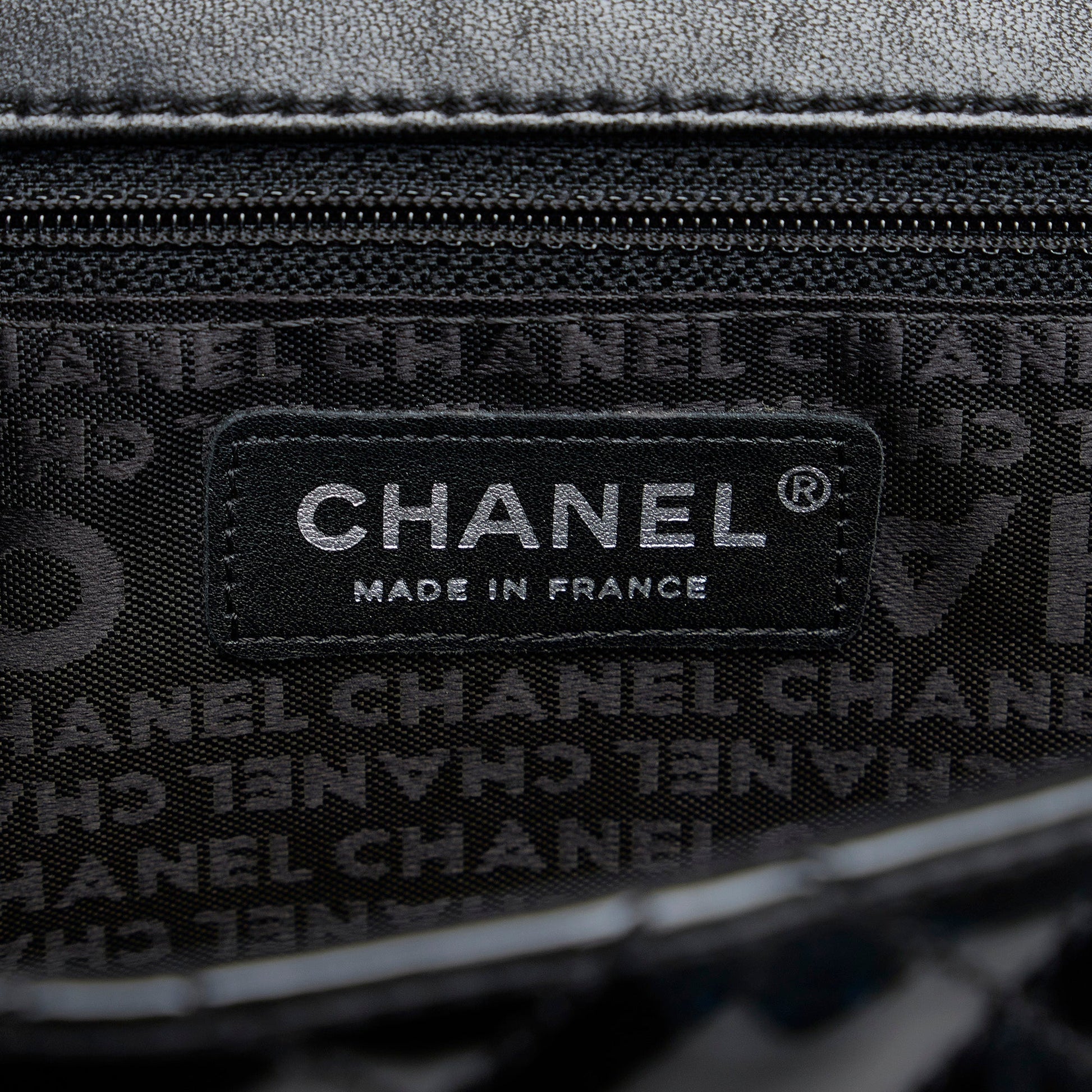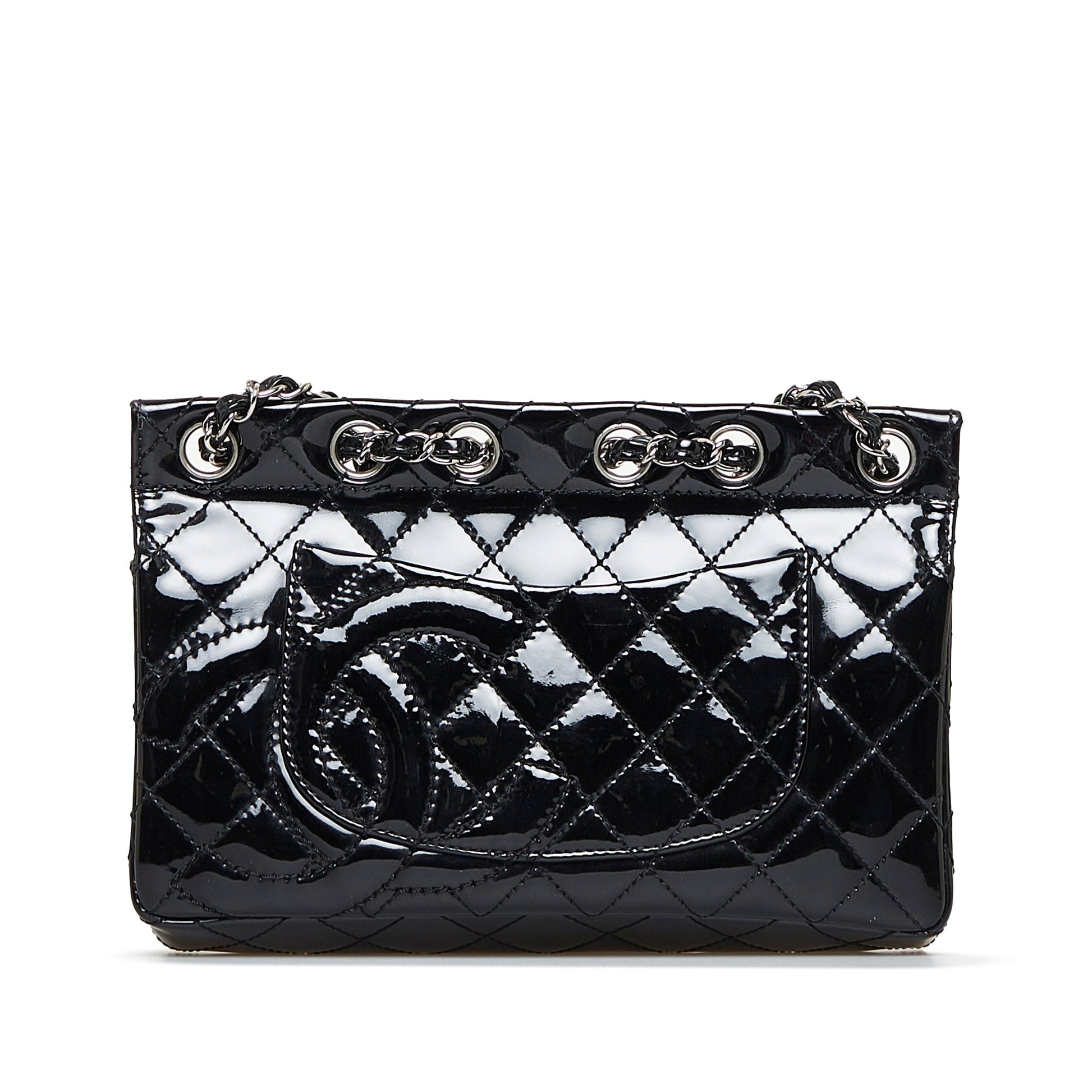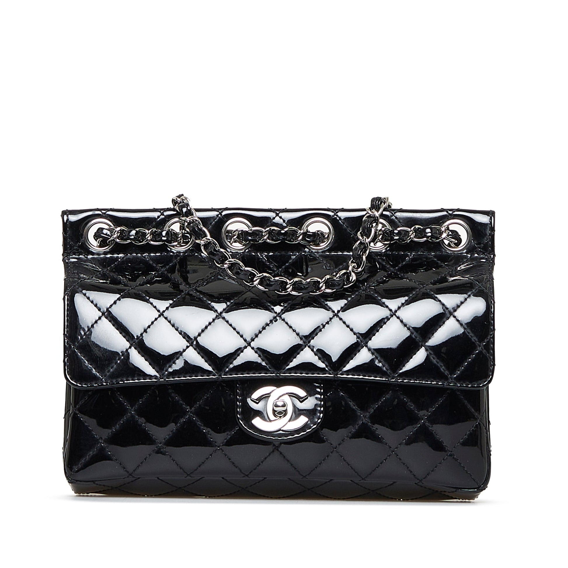 Chanel CC Chain-Through Flap Bag Medium Black Patent Leather Silver