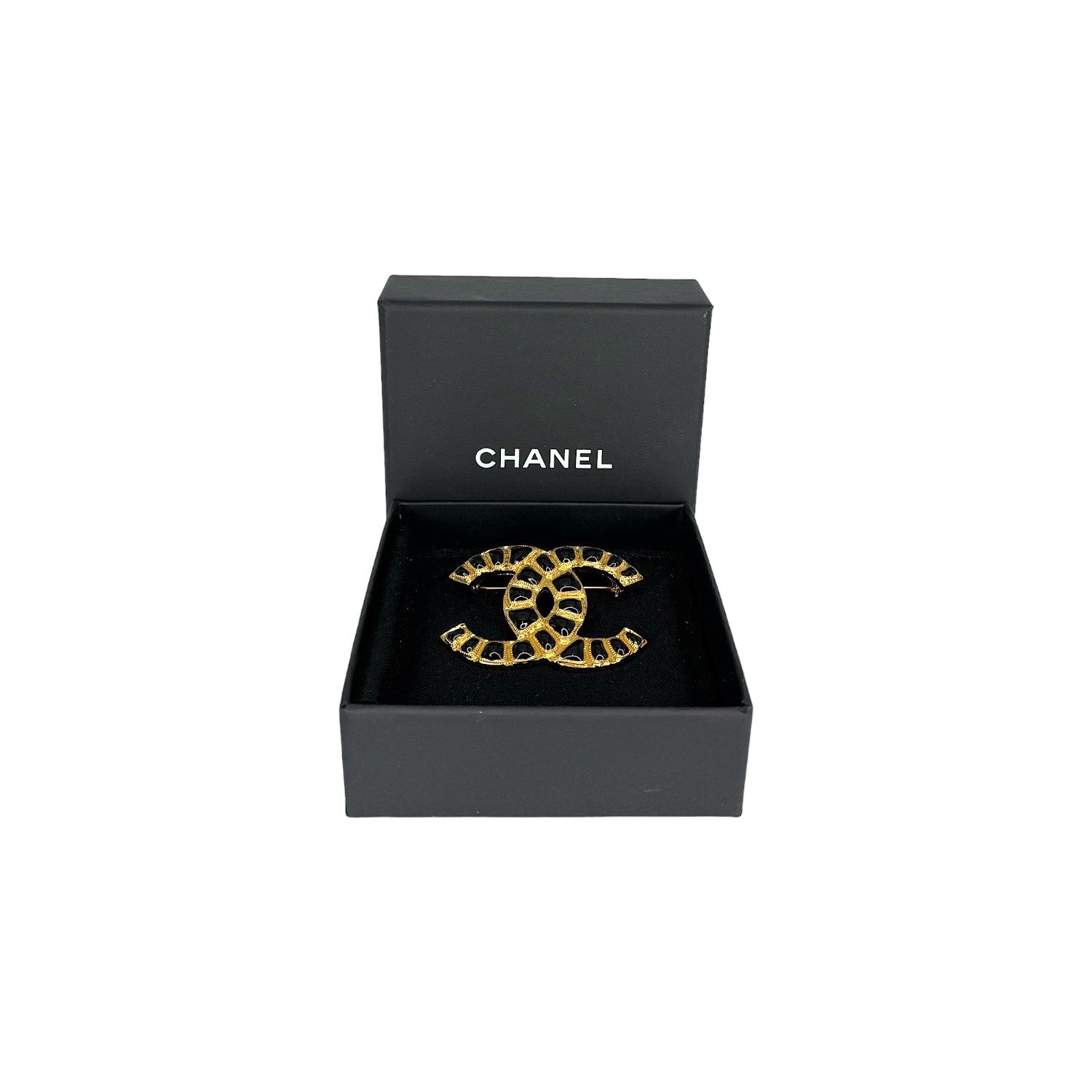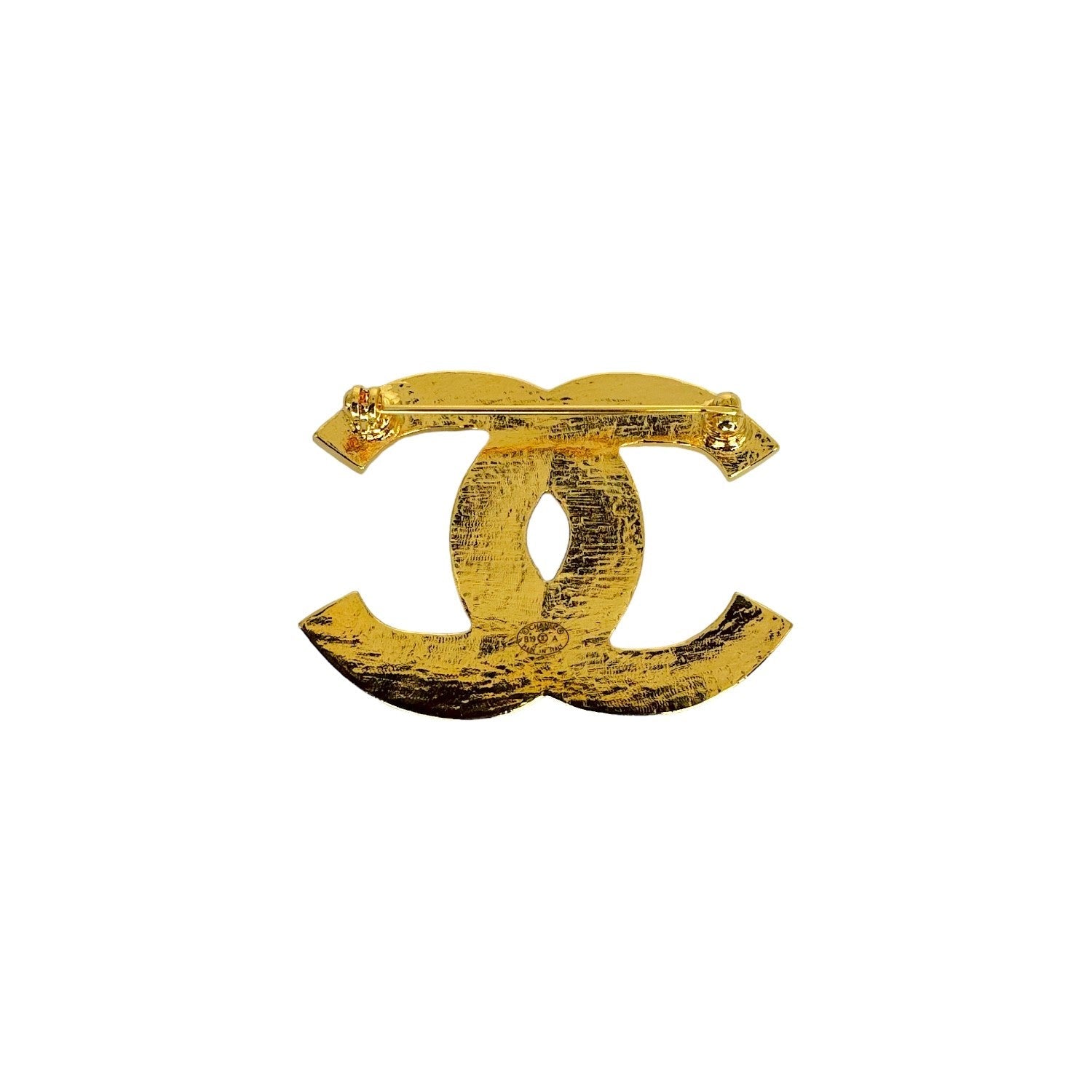 This Chanel brooch pin is finely crafted of Gold-Plated Hardware with Black Enamel gemstones in the classic Chanel CC design. It has a safety catch closure to secure the pin. With its sleek appearance, it is the perfect brooch pin to add to your fine jewelry collection!