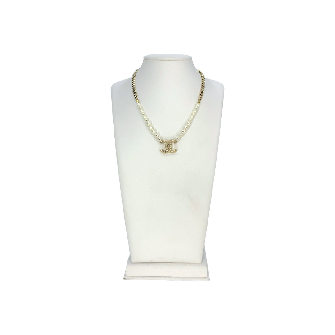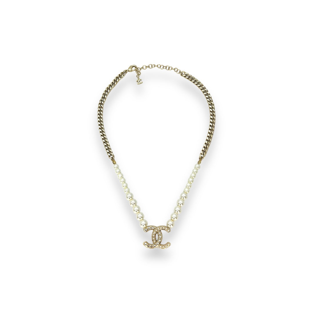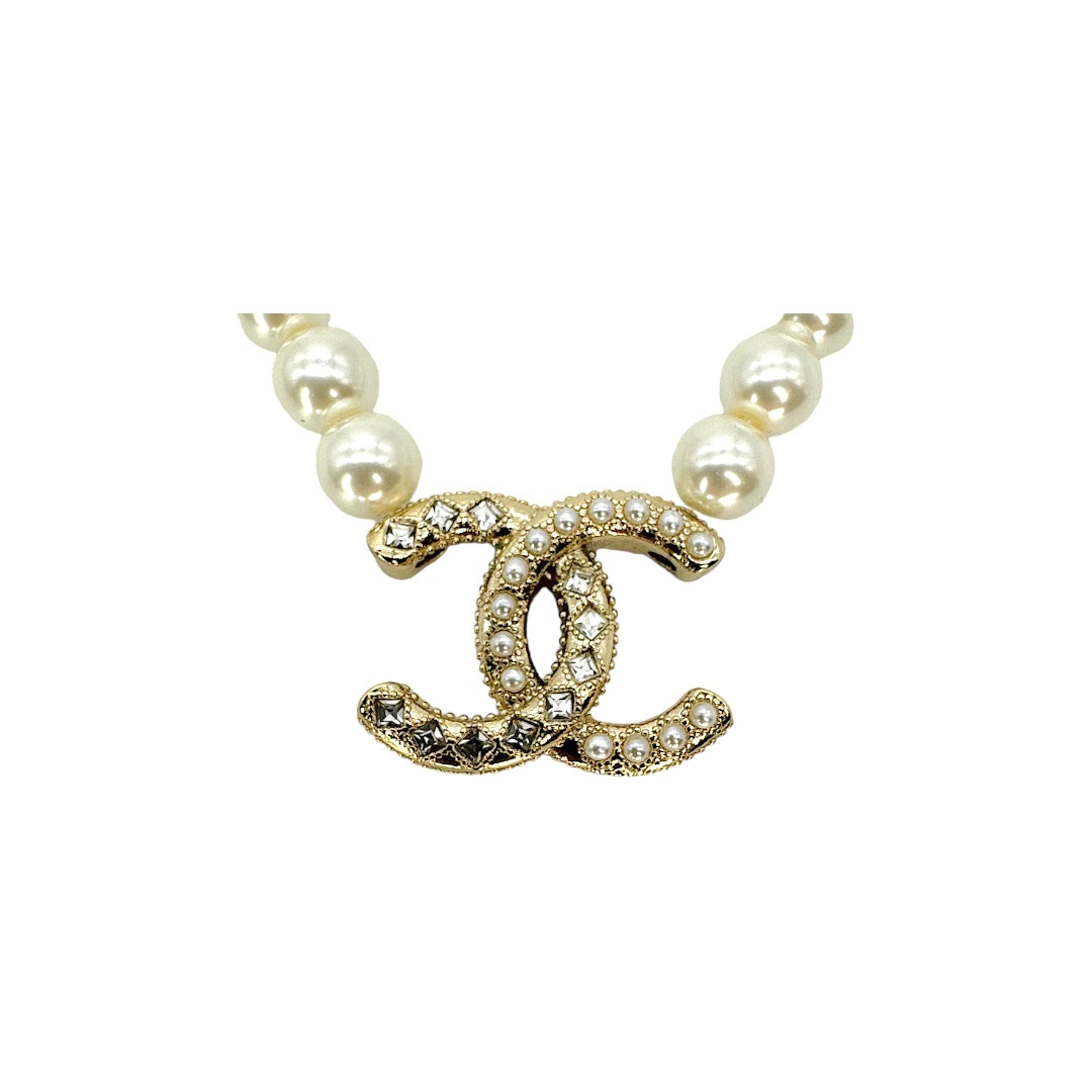 This Chanel necklace is finely crafted of Gold-Tone Hardware & Faux Pearl links and it features the iconic Chanel 'CC' logo in Gold-Tone Hardware with small Faux Pearl & Crystal embellishments. It has a lobster clasp closure and it measures 20.5" in length. This necklace would be an excellent addition to your Chanel jewelry collection!