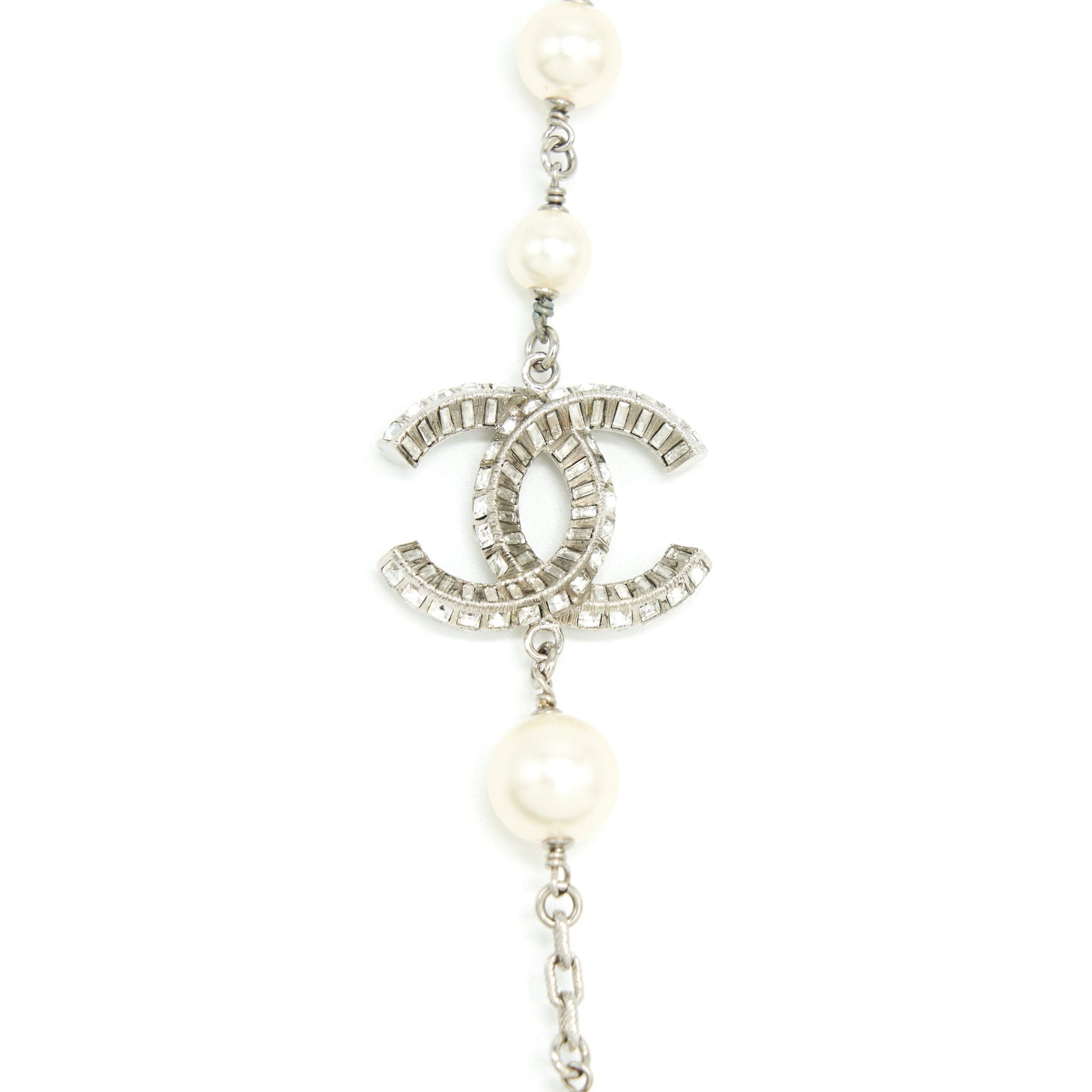 Chanel CC Logo And Pearl Long Necklace Silver Tone