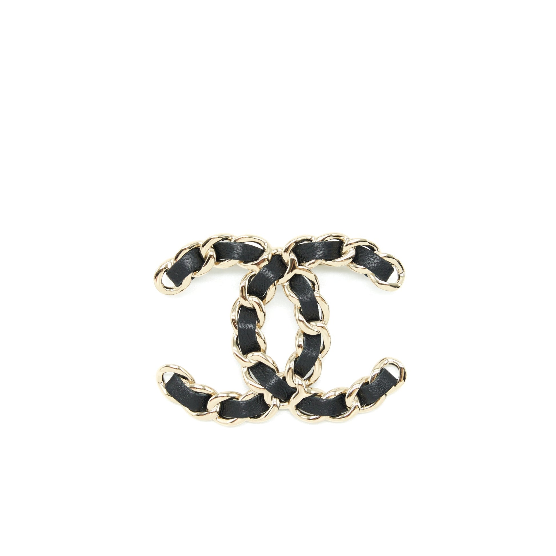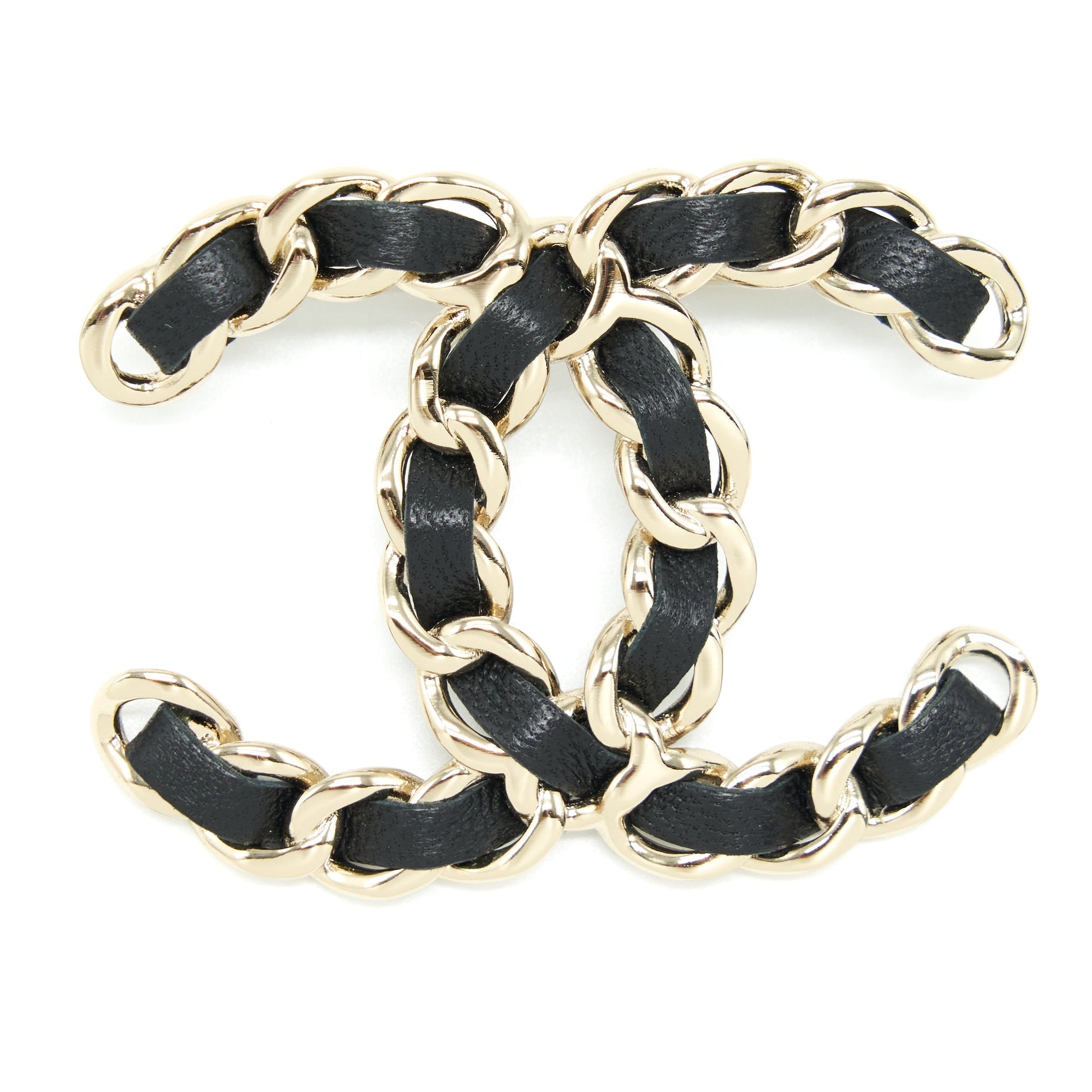 Chanel CC Logo Leather Chain Brooch Light Gold Tone