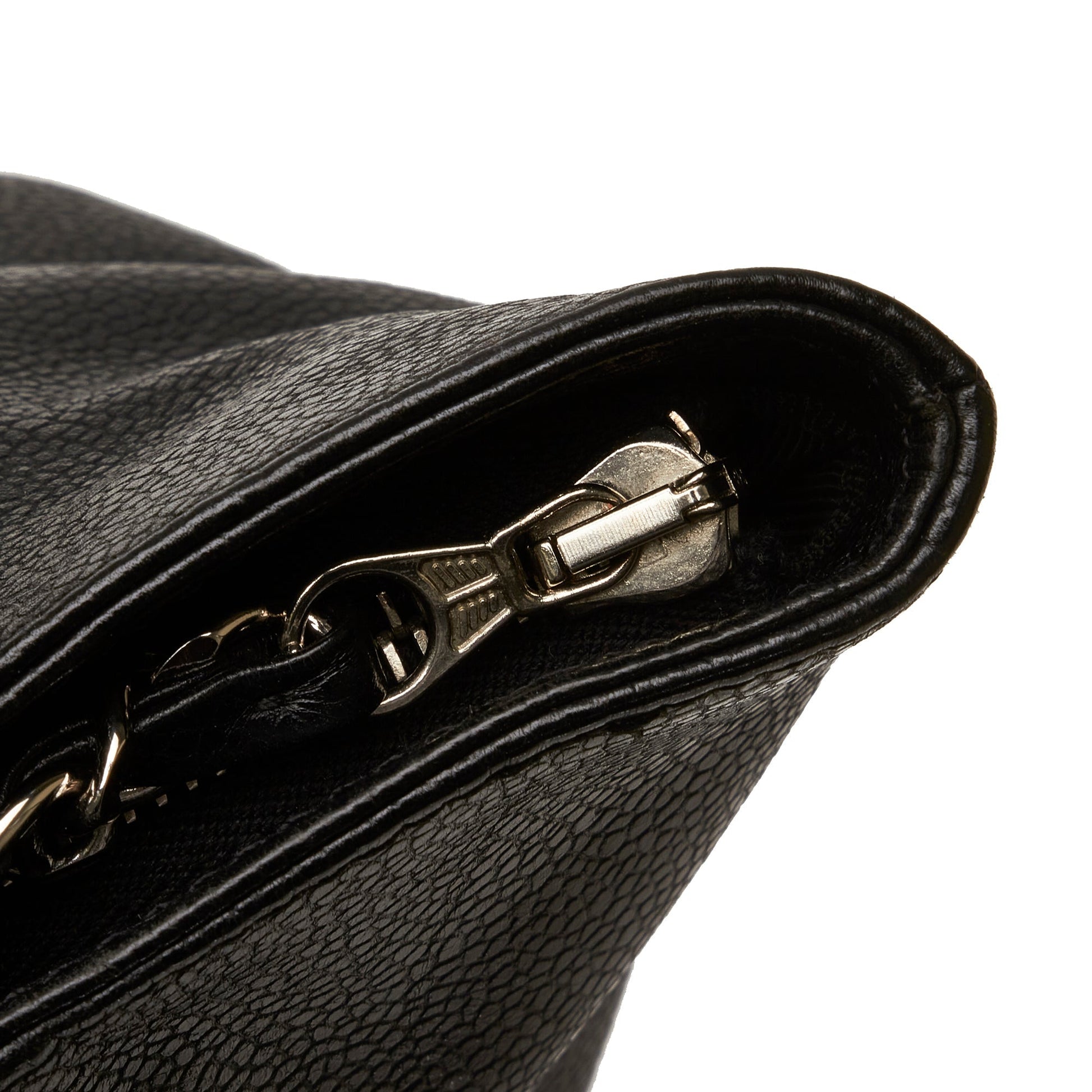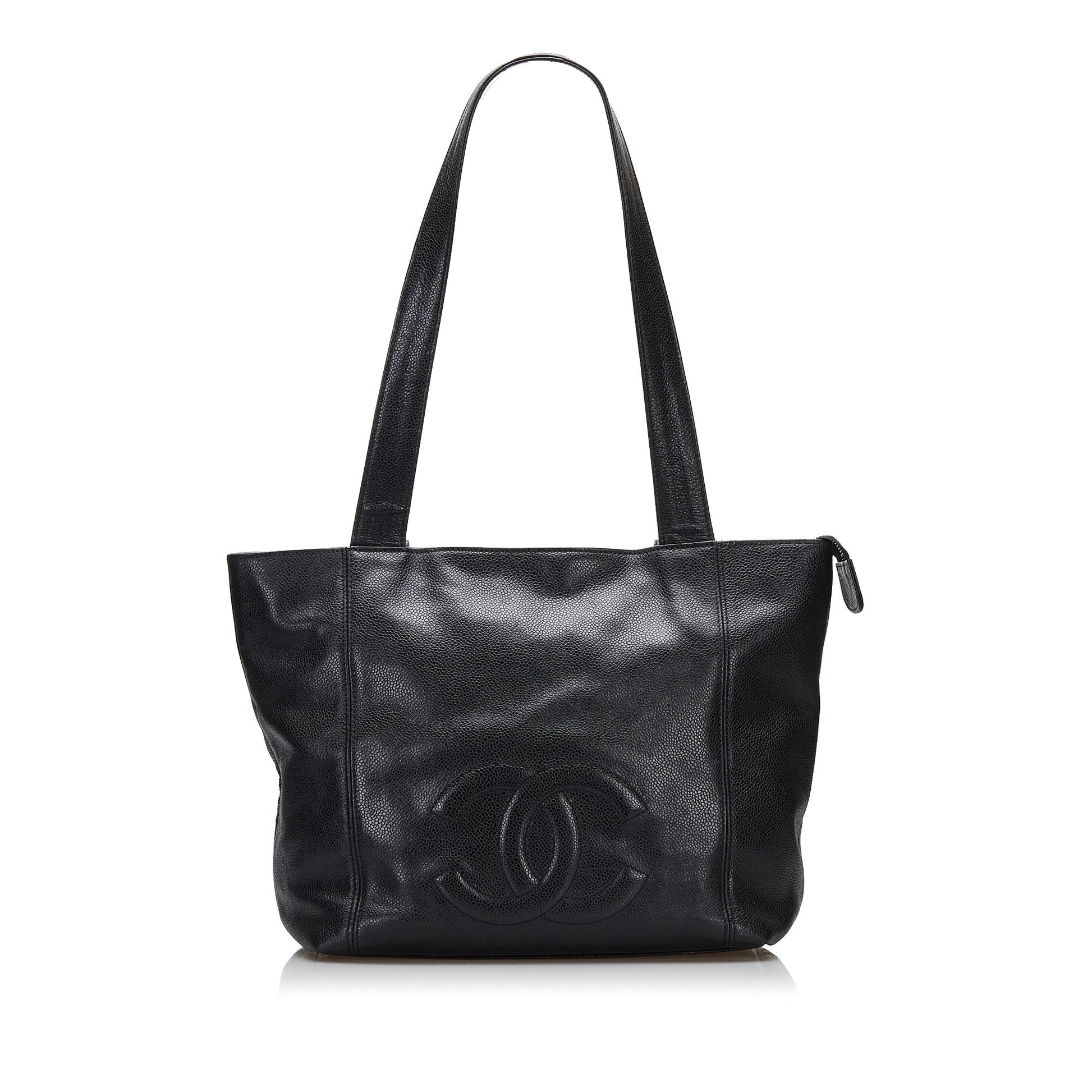 This Chanel CC shoulder bag was made from black Caviar leather. The Bag features CC logo quilting on the front, flat leather shoulder straps, a zipper closure at the top opening, and a zippered compartment inside. The Bag is best worn loosely over the shoulder.