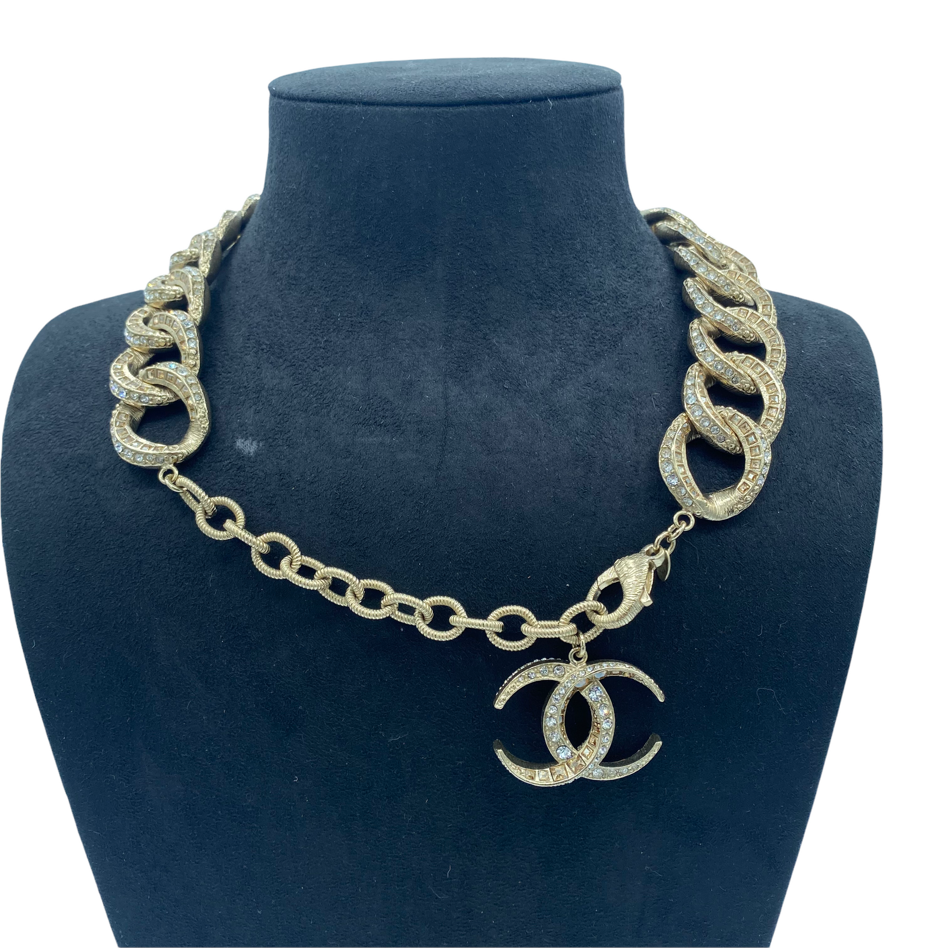 DESCRIPTION: Chanel chain choker necklace, embellished with round and square crystals and a strassed CC logo. Sold in original Chanel box
