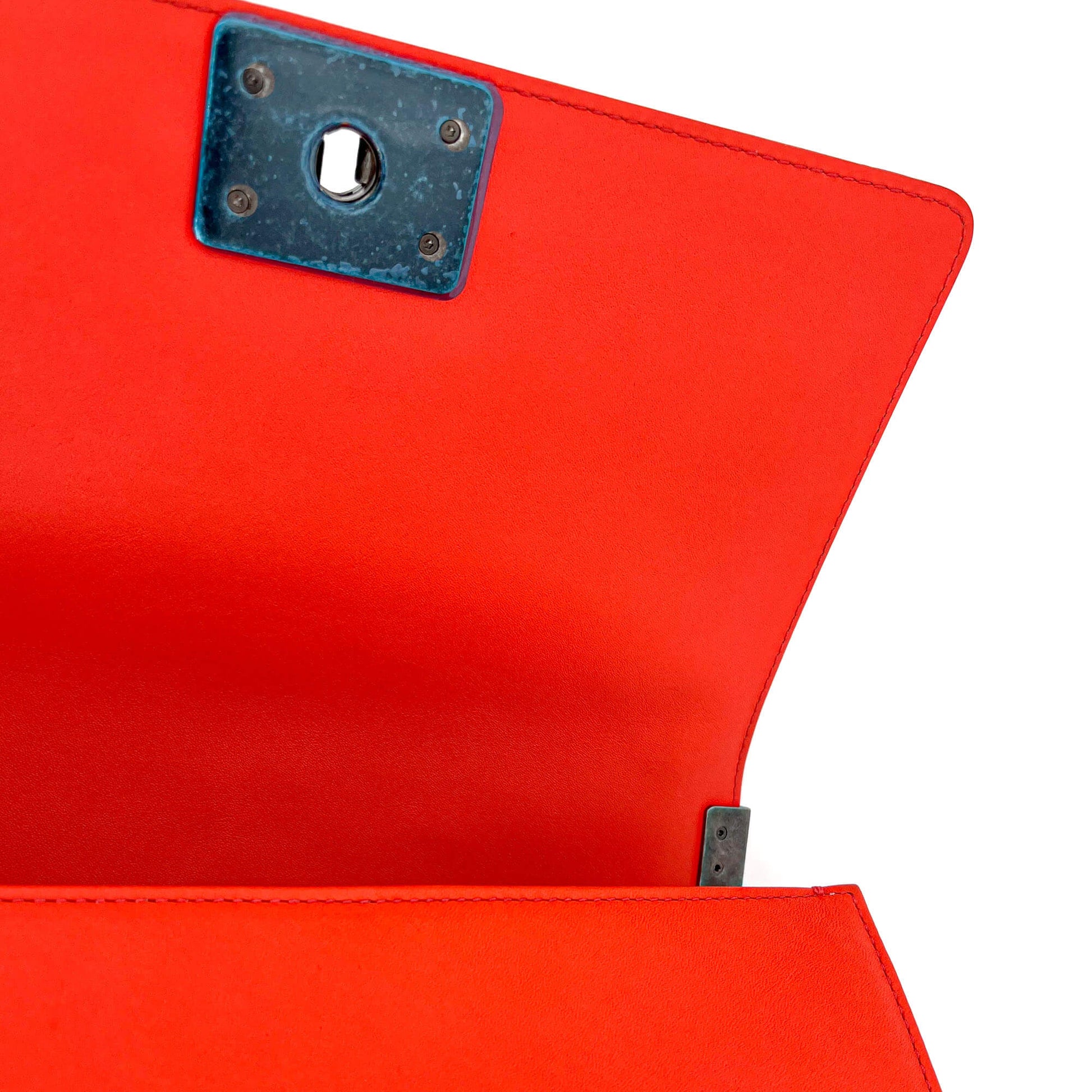 Beautiful Chanel Boy in a red orange nuance with chevron embossed leather. In excellent condition.