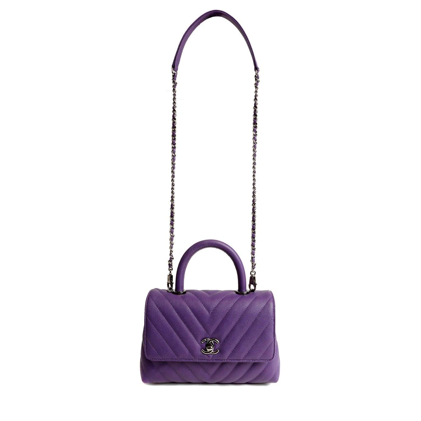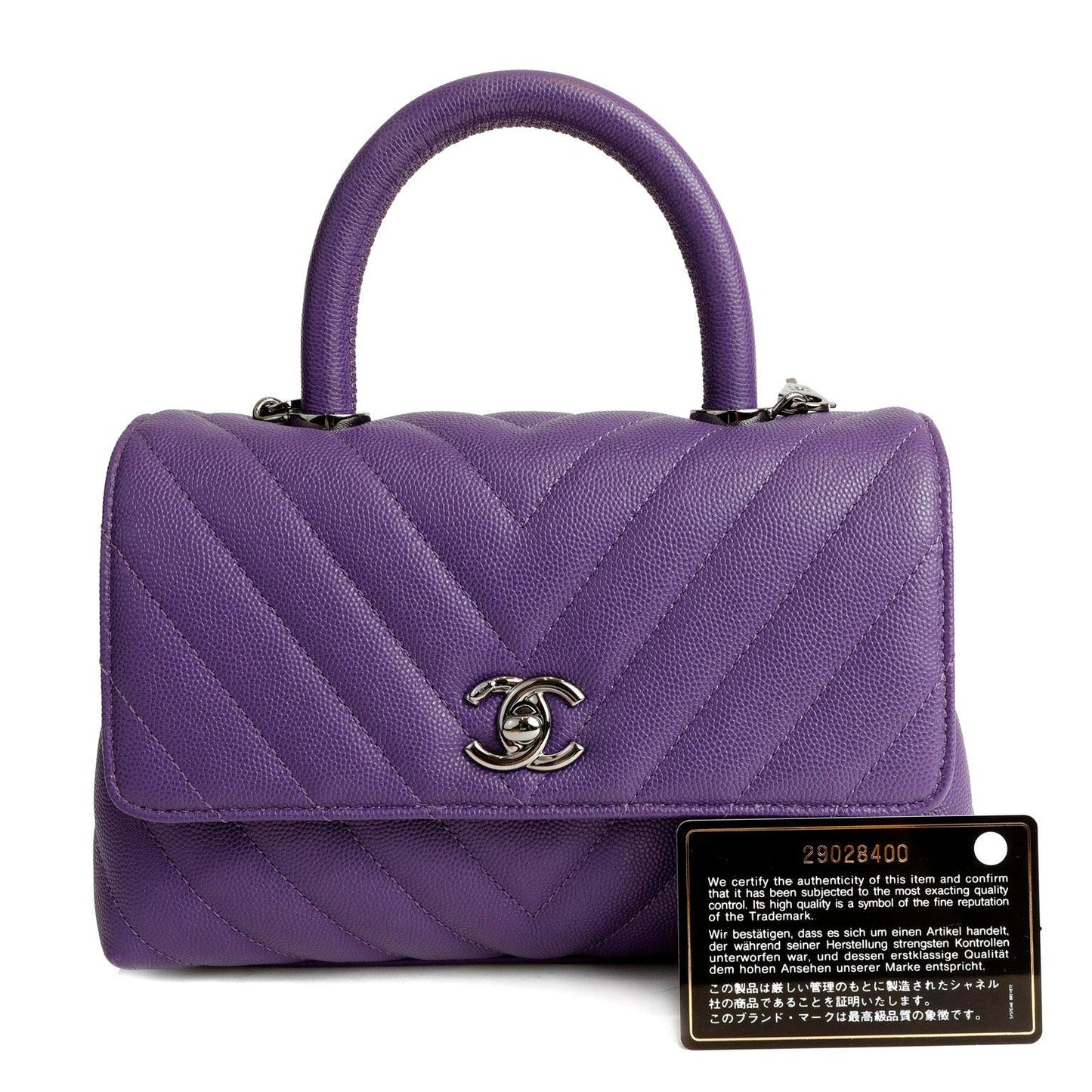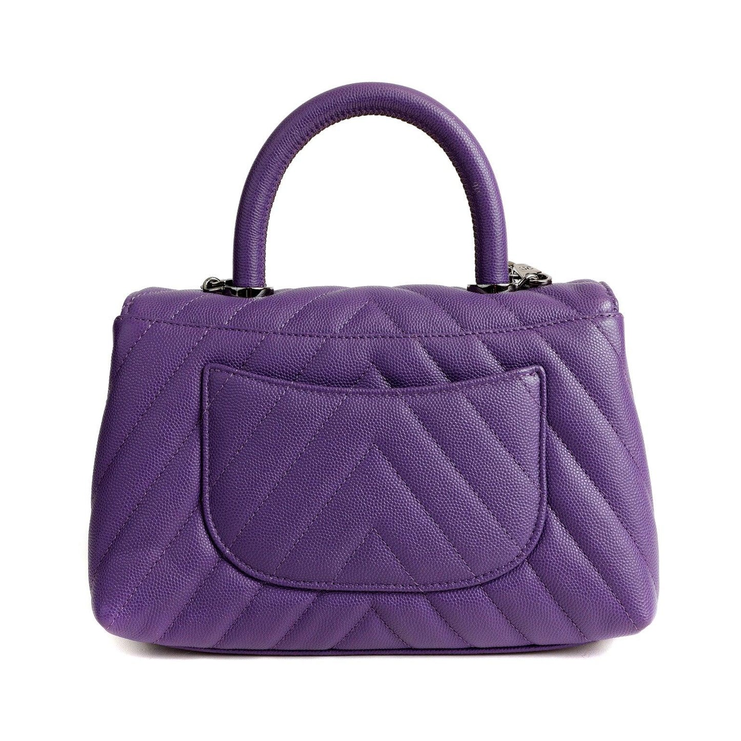 This Chanel Purple Caviar Chevron Mini Coco Handle Bag is in pristine condition. The Coco Handle is a distinctively different flap bag silhouette; a must have addition to any collection.
