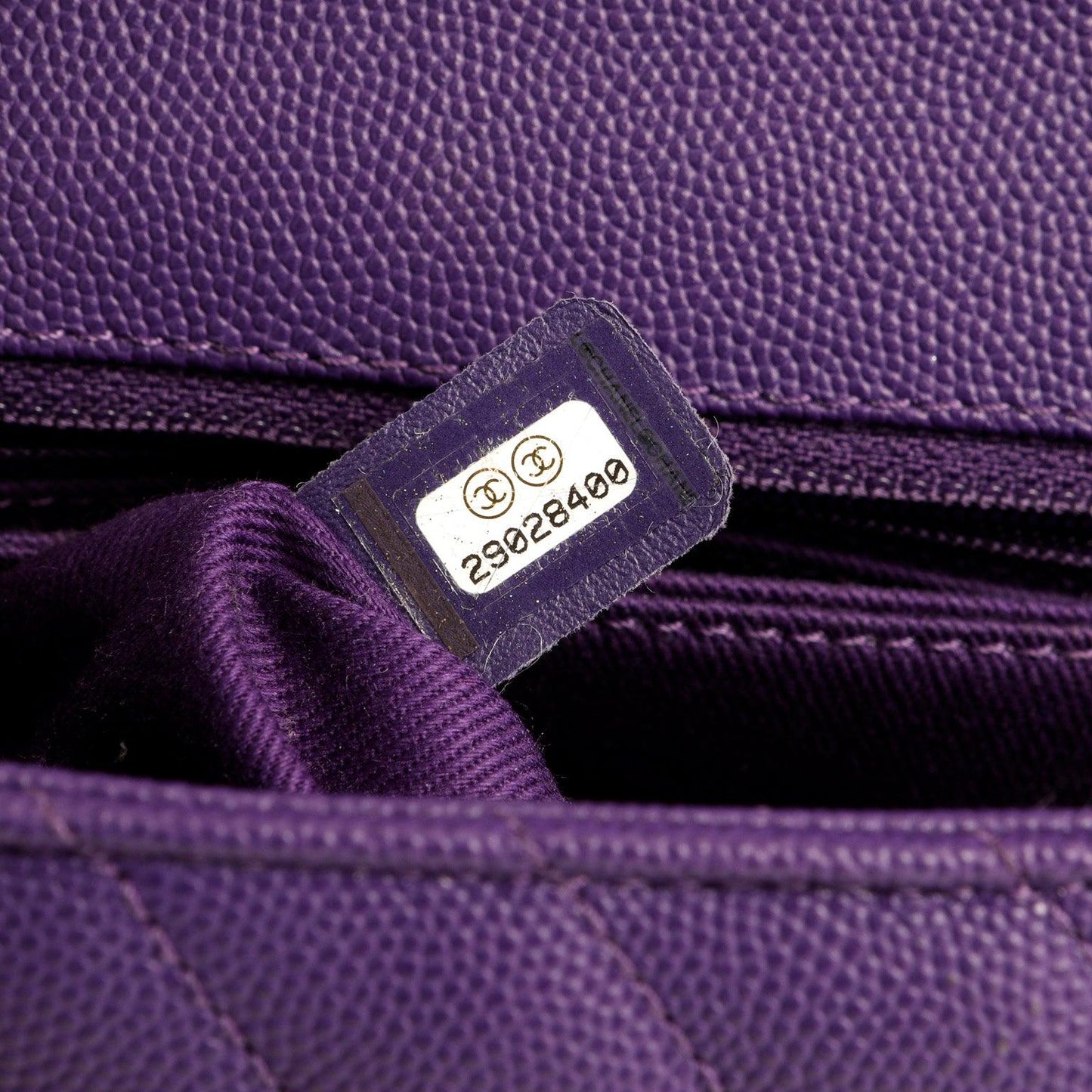 Exquisite purple caviar leather is textured and durable. Chevron quilted pattern with silver interlocking CC twist lock closure. Carried by the upright top handle or by the leather and chain entwined shoulder strap. Chanel , intact hologram and dust bag included.
