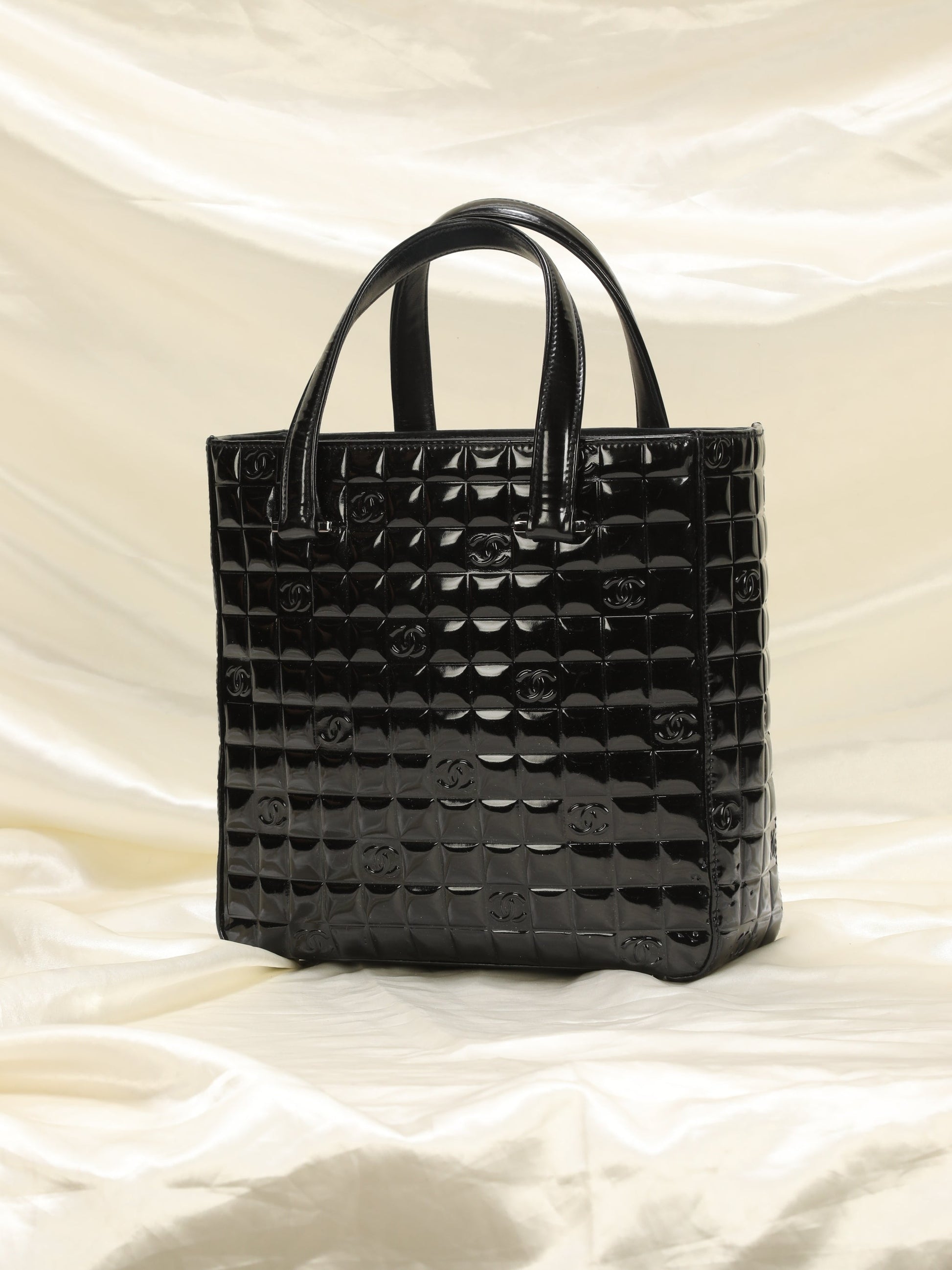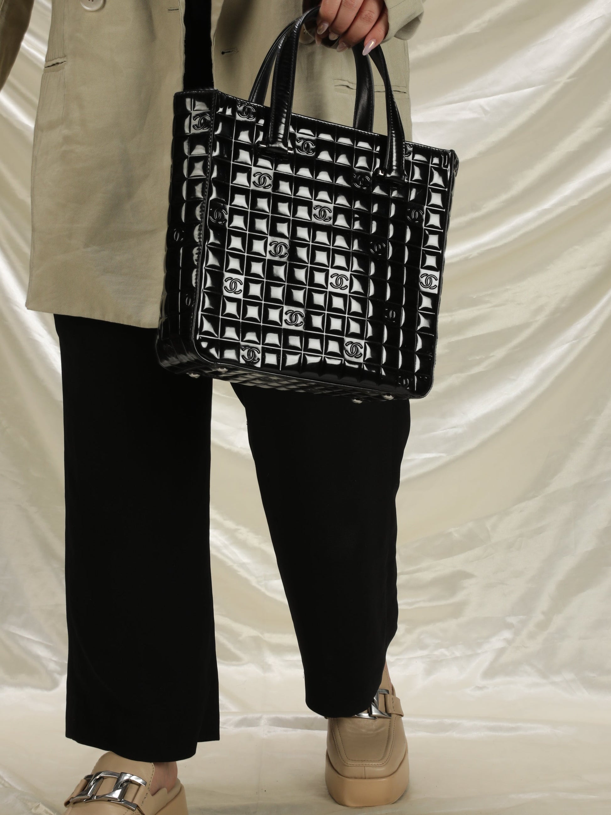 A rare vintage Chanel patent chocolate bar handle bag!?Tiny CC logos adorn this tote. Lightweight and spacious enough to fill all your everyday essentials. A timeless piece that will be for years to come.?