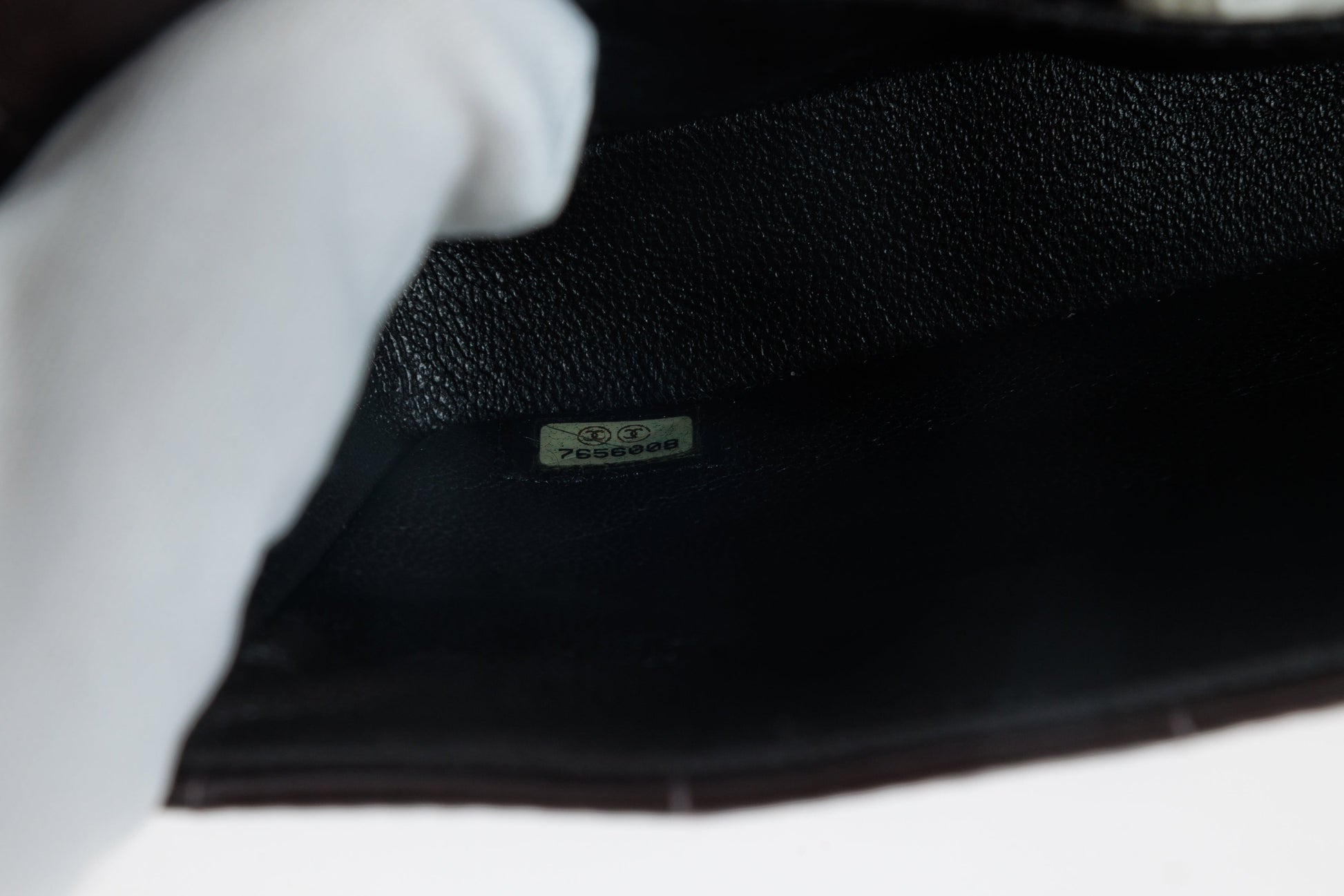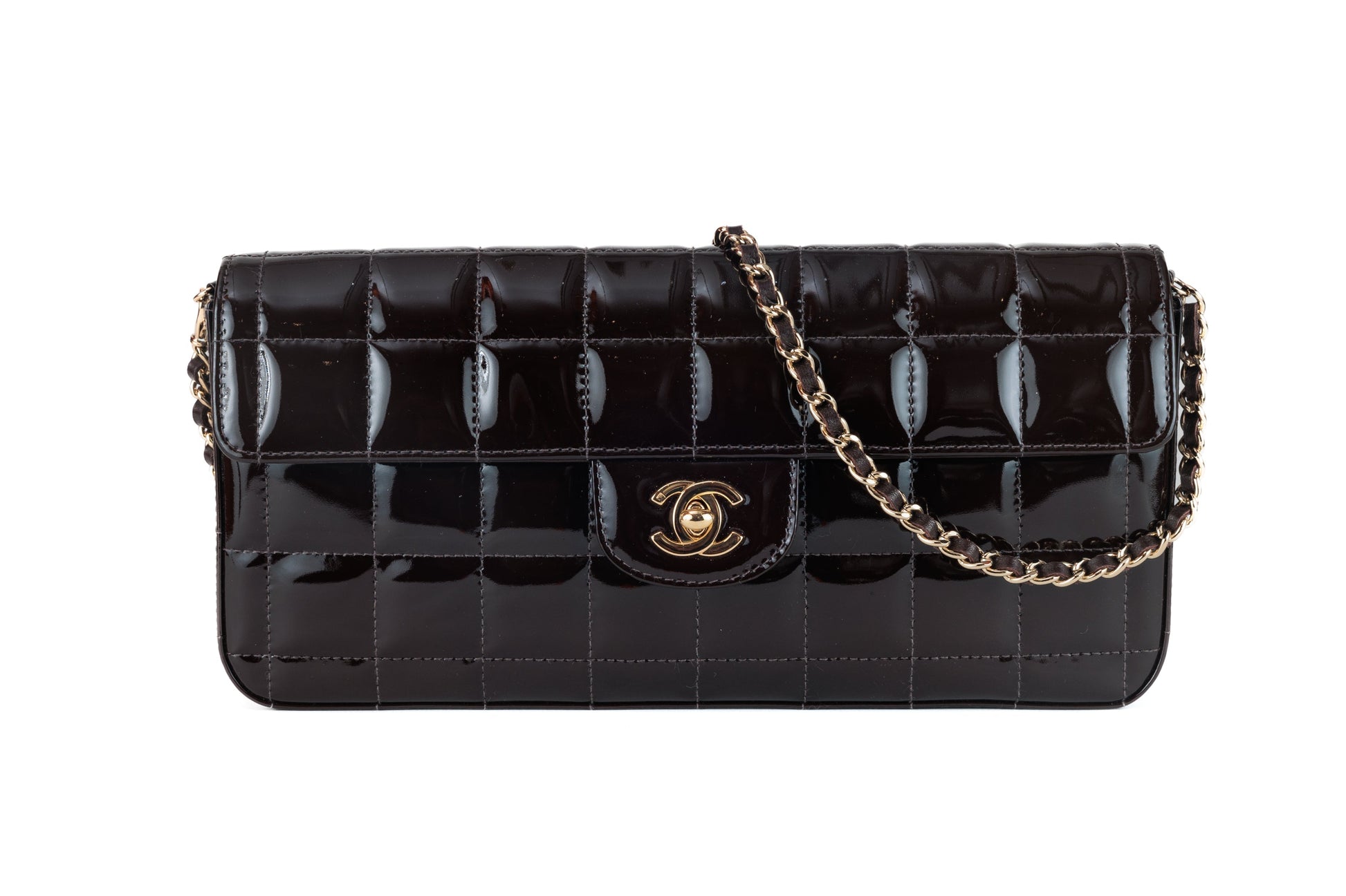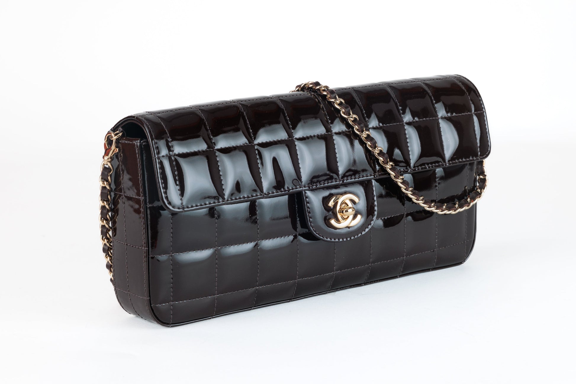 This ChanelBrown Patent Leather Chocolate Bar Stitched East West Flap Bag is in excellent condition from the early 2000s. Deep brown patent leather is quilted in square pattern with gold tone interlocking CC twist lock closure. East west configuration with detachable single strap. May be carried by the strap or as a clutch. Dust bag included.