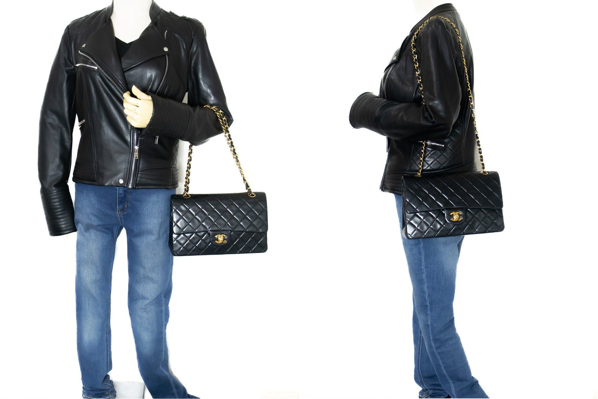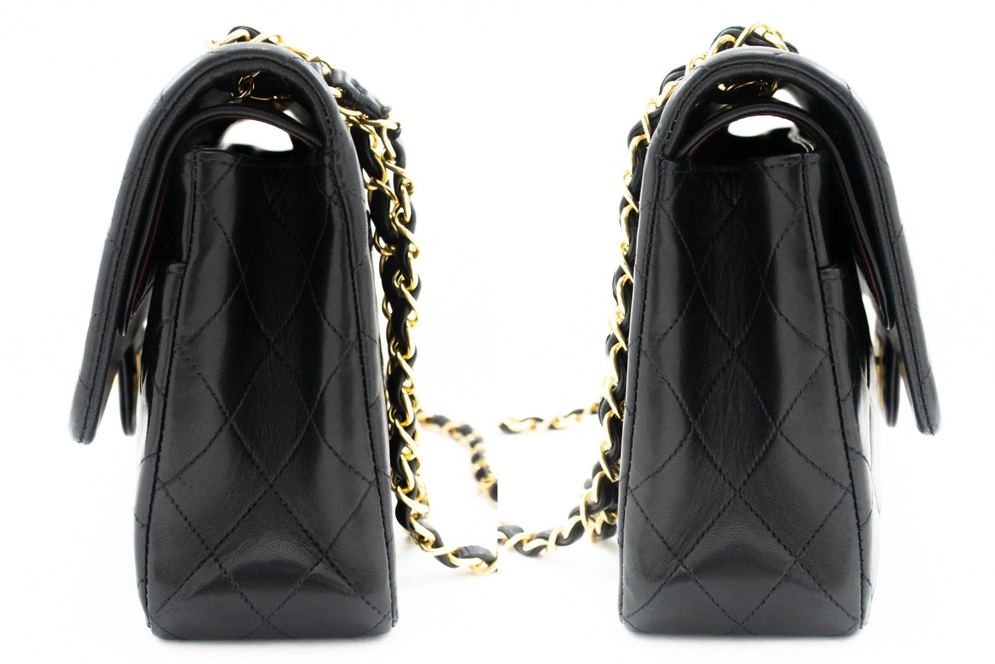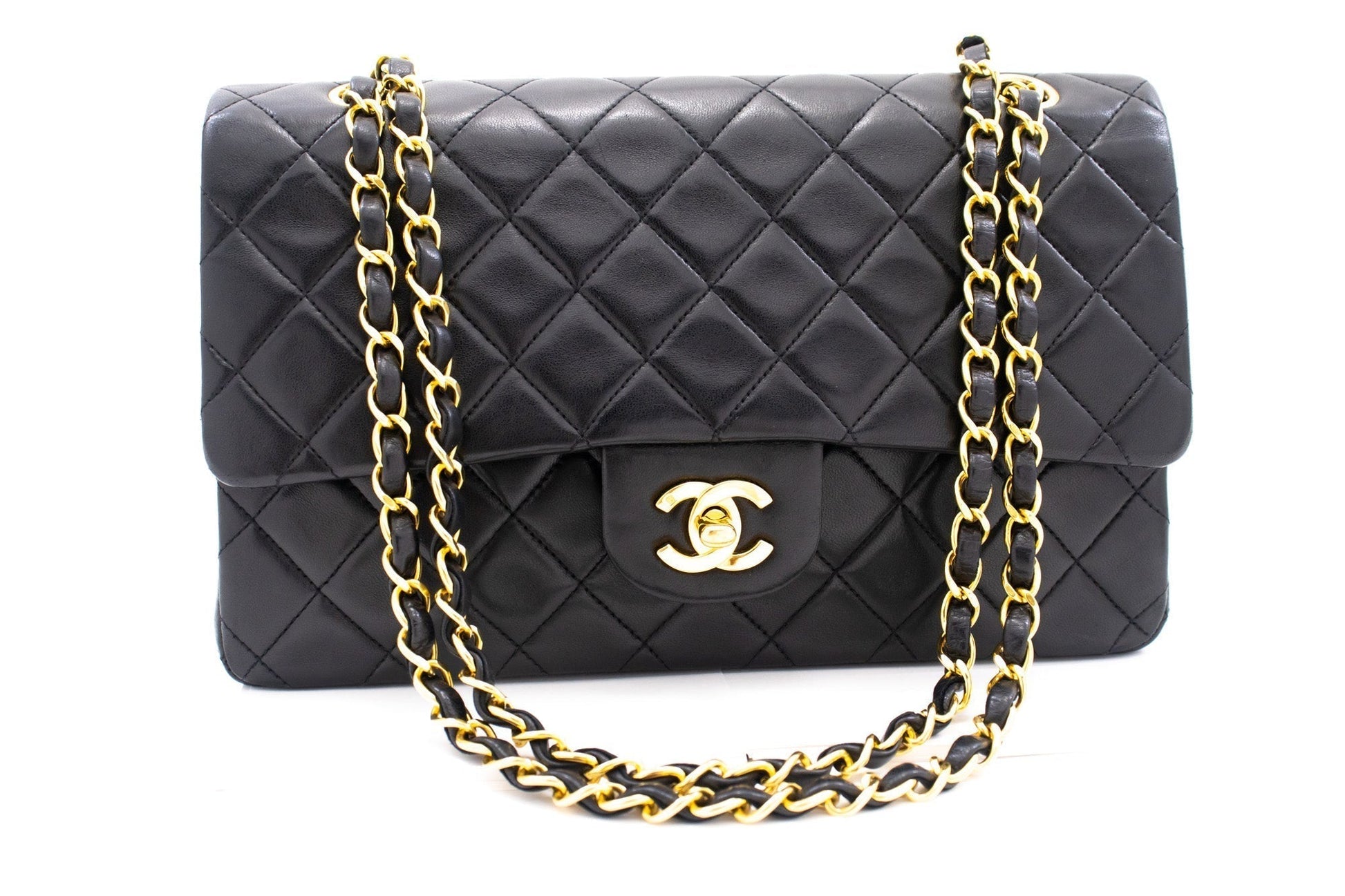 CHANEL Classic Double Flap 10" Chain Shoulder Bag Black Lambskin k76