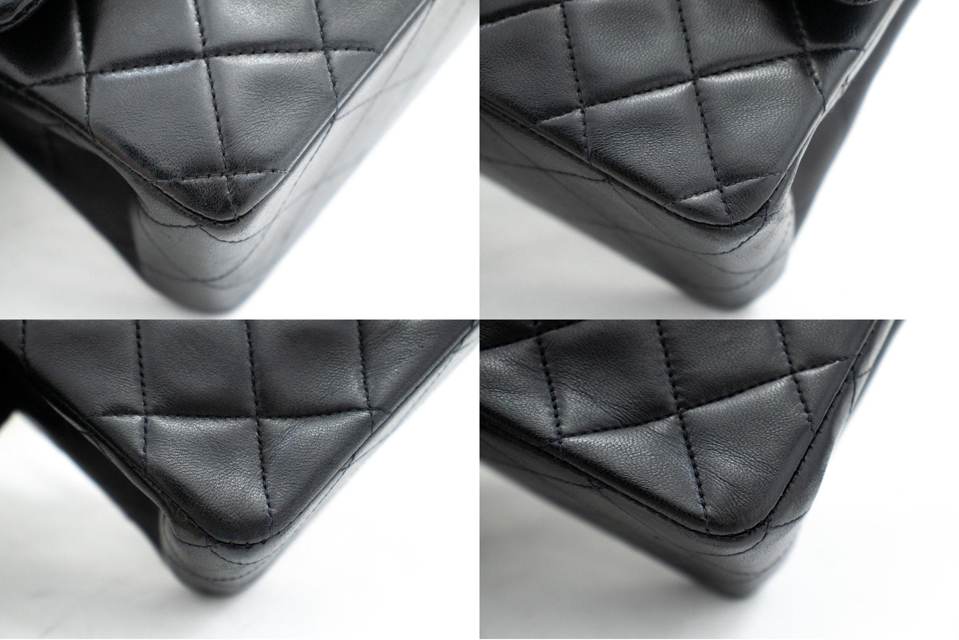 Overall: 8 of 10 - The outside is in excellent condition with minimal signs of use only. Very slight scratches. The inside is also excellent and very clean with slight scratches on the inner flap. No stickiness or peeling. All chains and hardware are shiny and excellent. The dust bag and box are also great. Highly recommended!