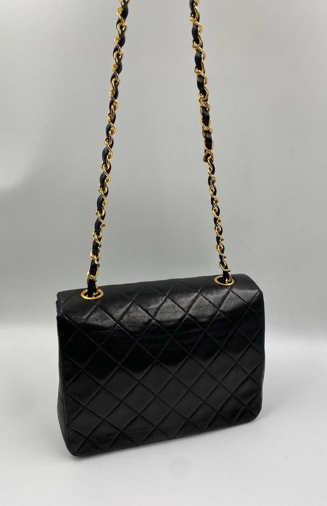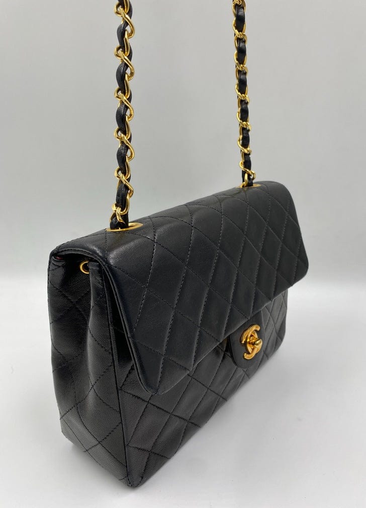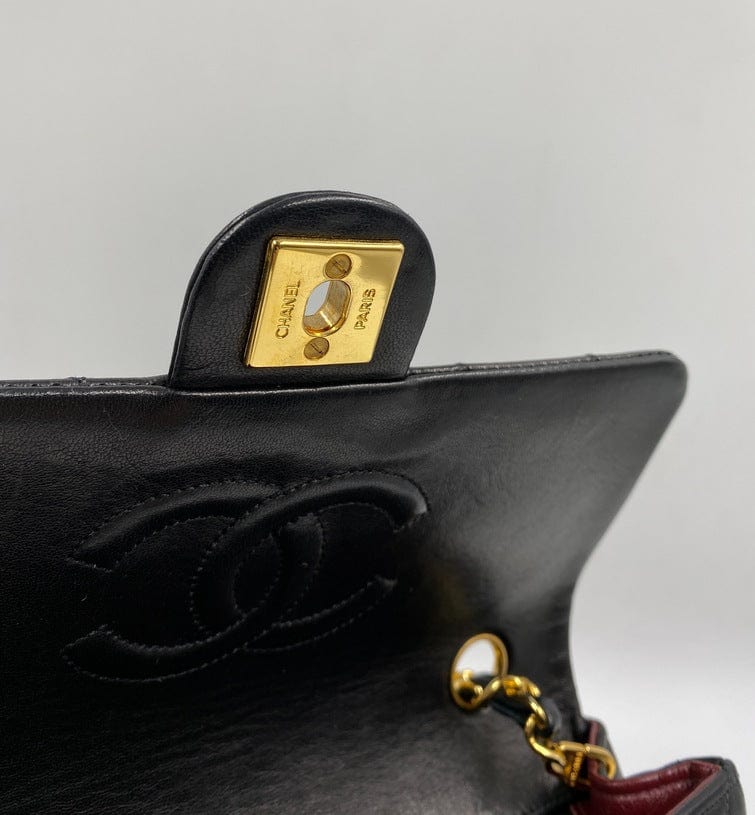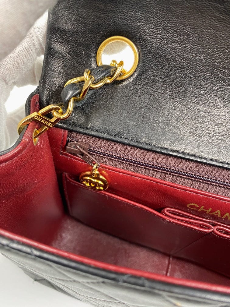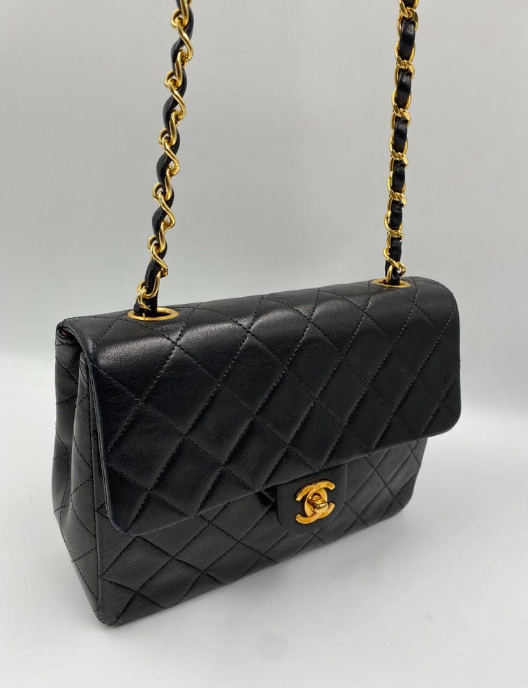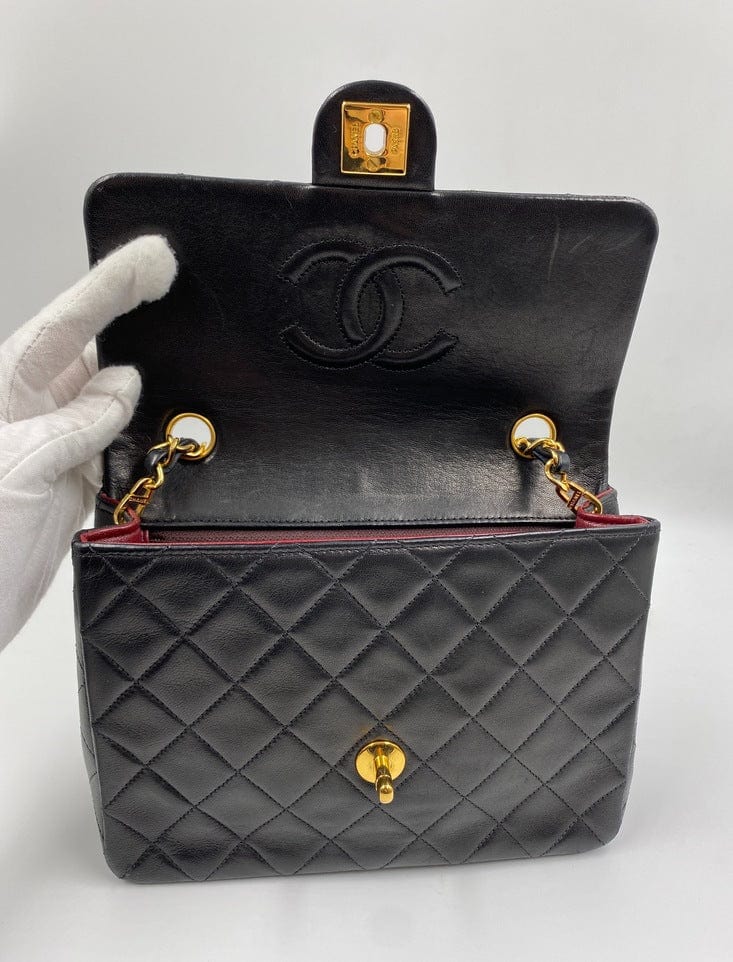 This vintage Classic Chanel Small Square Flap bag is crafted with diamond quilted black lambskin leather with 24k gold-plated hardware and a single leather-trimmed chain-link shoulder strap. There are two interior compartments and an inner zipped pocket. Inside the bag is lined with maroon leather. The chain drop for this bag is 52cm. so can be worn on the shoulder or across the body.