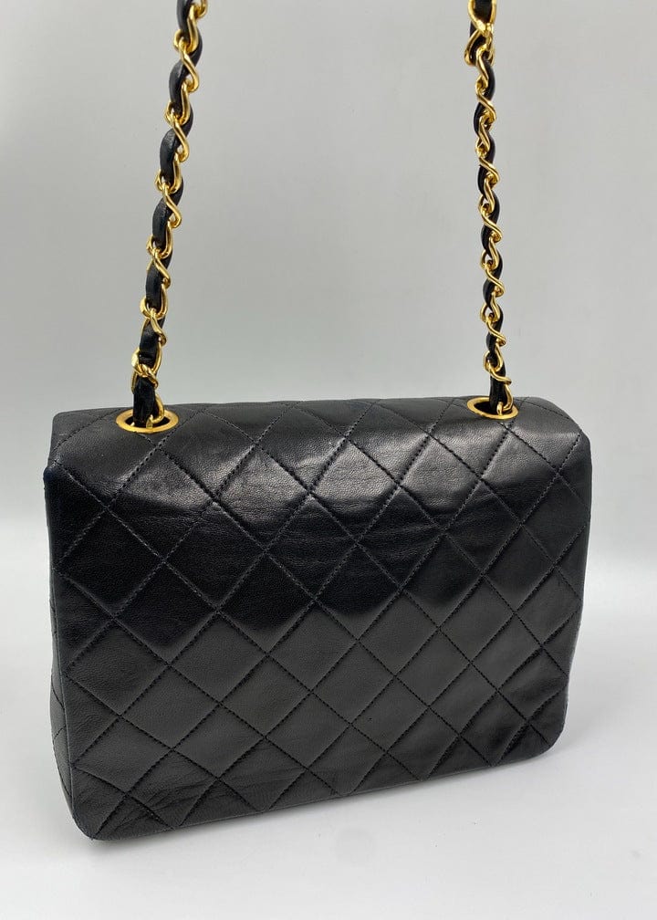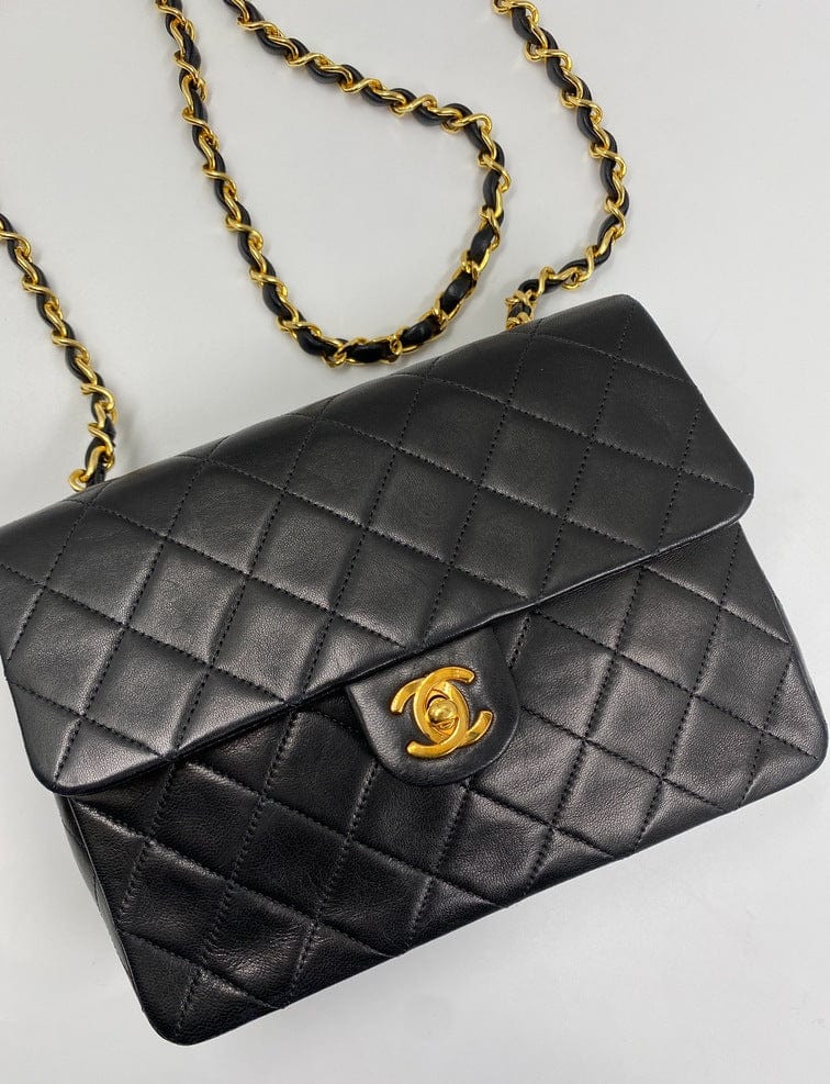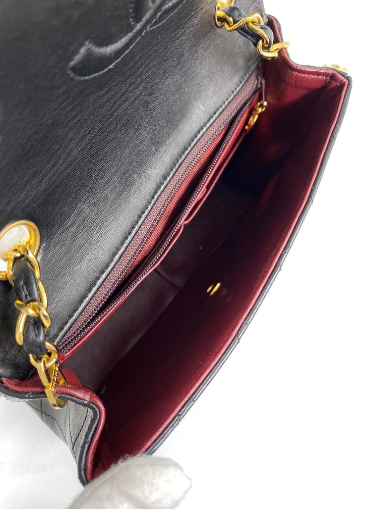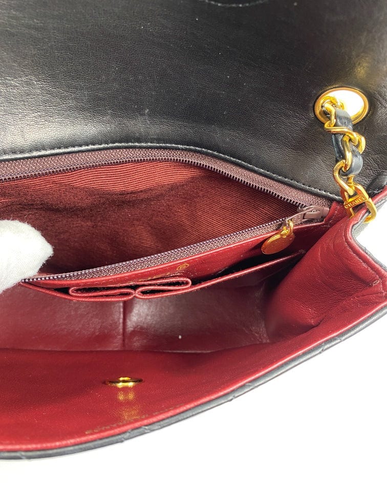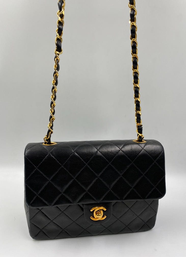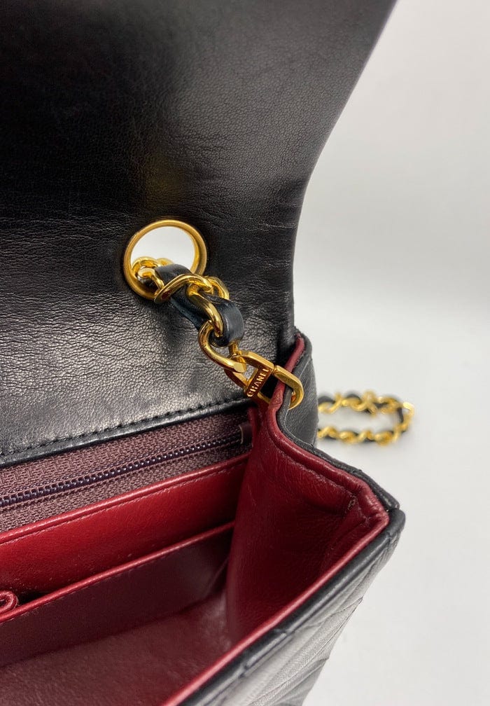 This vintage Classic Chanel Small Square Flap bag is crafted with diamond quilted black lambskin leather with 24k gold-plated hardware and a single leather-trimmed chain-link shoulder strap. There are two interior compartments and an inner zipped pocket. Inside the bag is lined with maroon leather. The chain drop for this bag is 52cm. so can be worn on the shoulder or across the body.