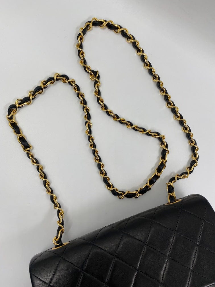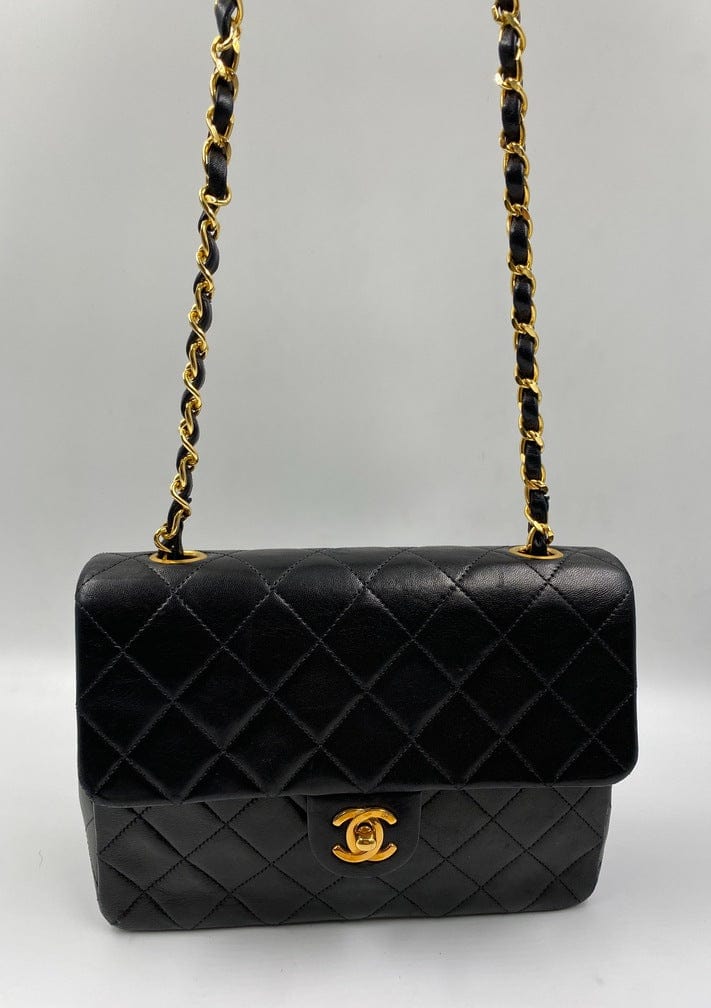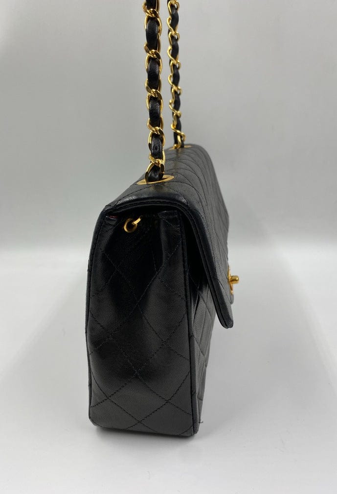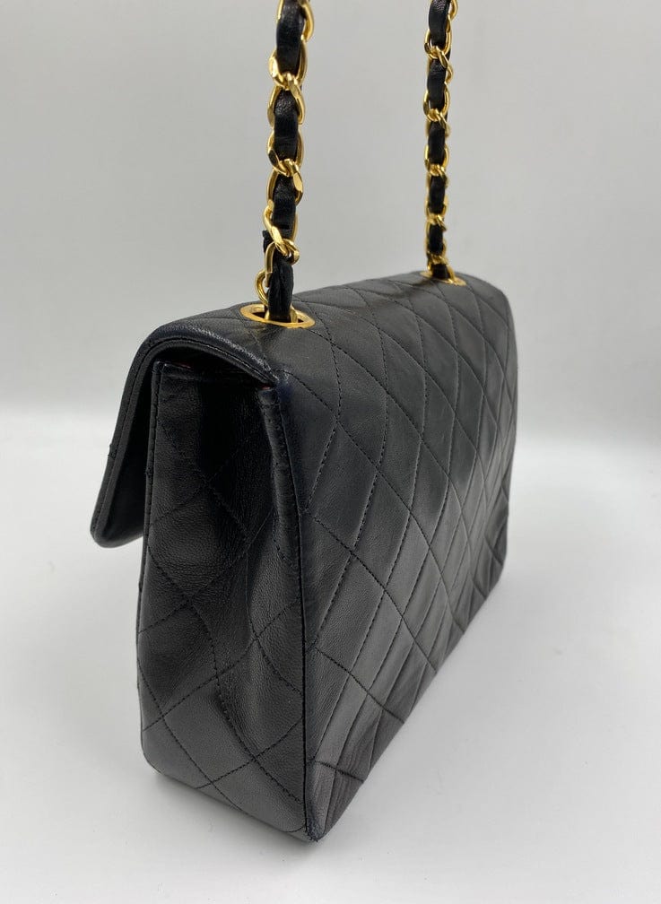 This bag is in very New vintage condition with some minor signs of use. The hallmark on the CC turn lock confirms the gold hardware is plated in 24K gold, a real collectors item. Before 2008, Chanel Classic Flaps with gold coloured hardware (chains, clasps, grommets, and CC turn locks) were all plated in real 24K gold. There are some minor creases to the leather. Please view all photos before buying. The hardware is in New condition with minor signs of wear. This bag comes with its . The serial number on the tells us this bag was made between 1989-1991.