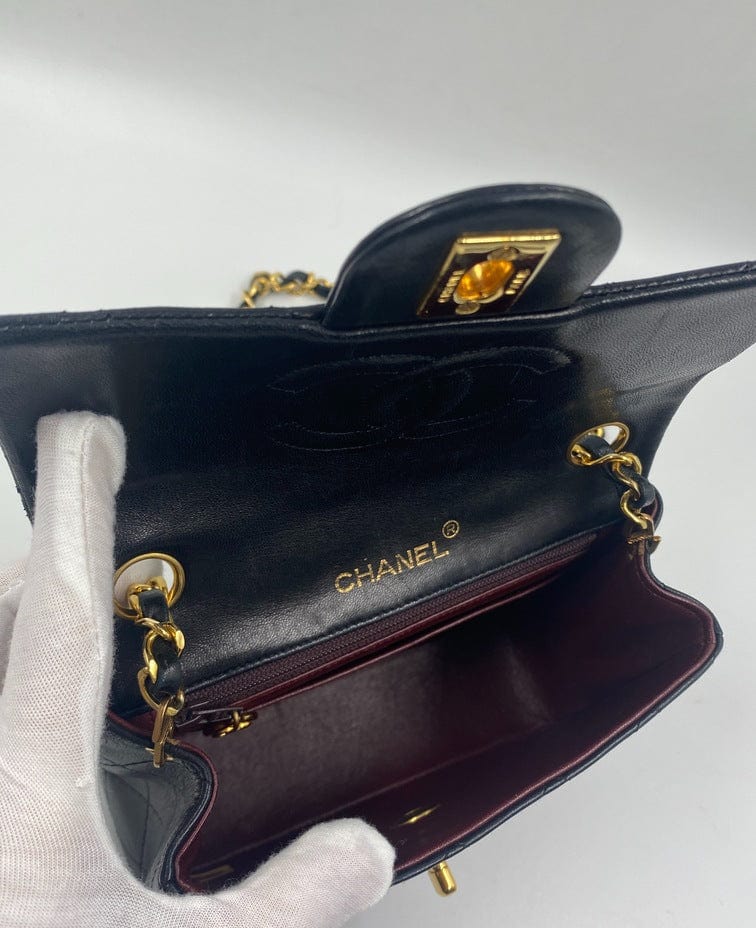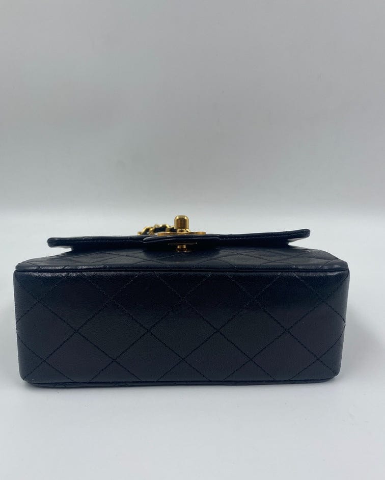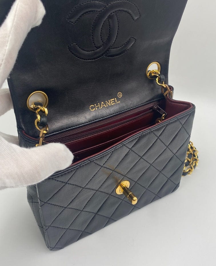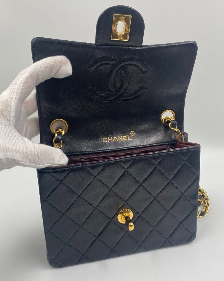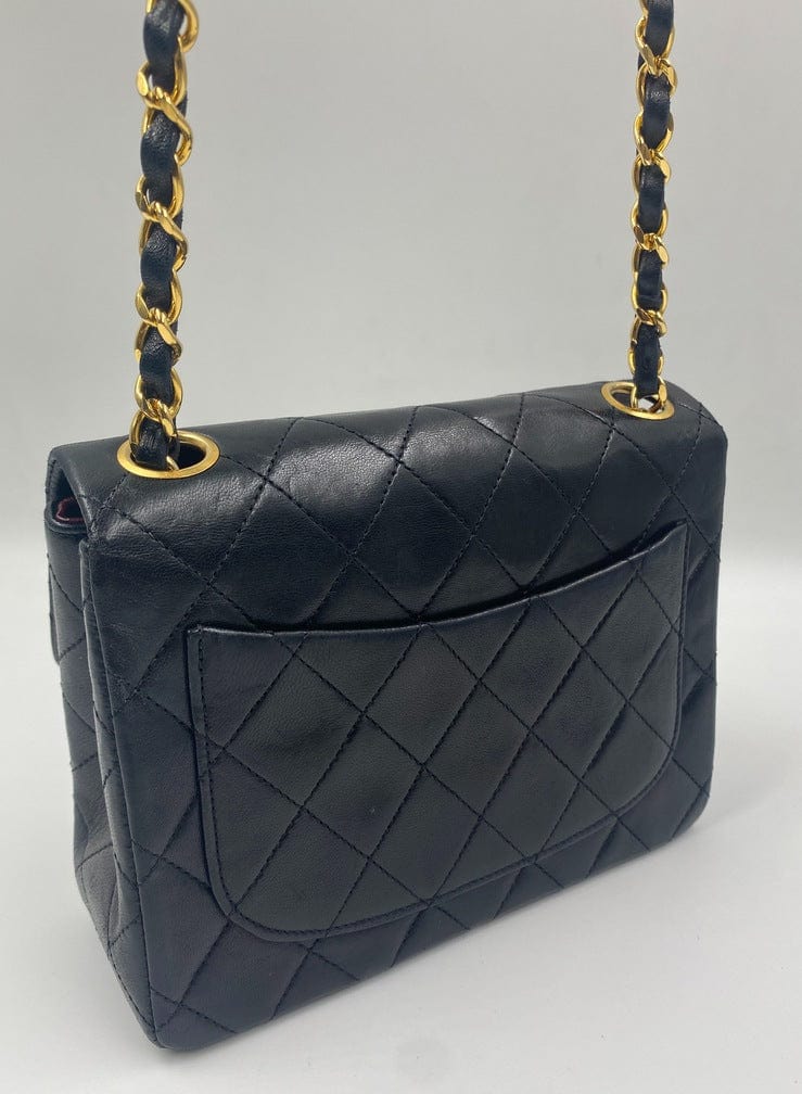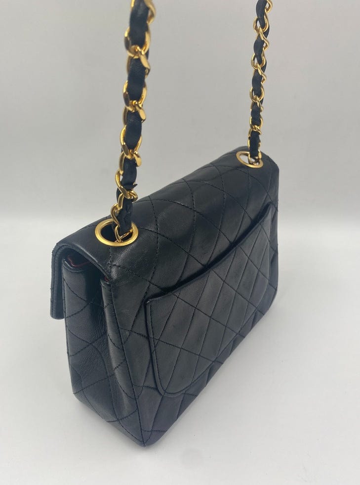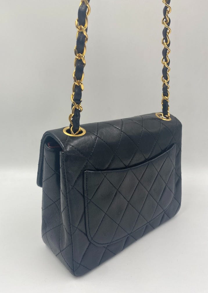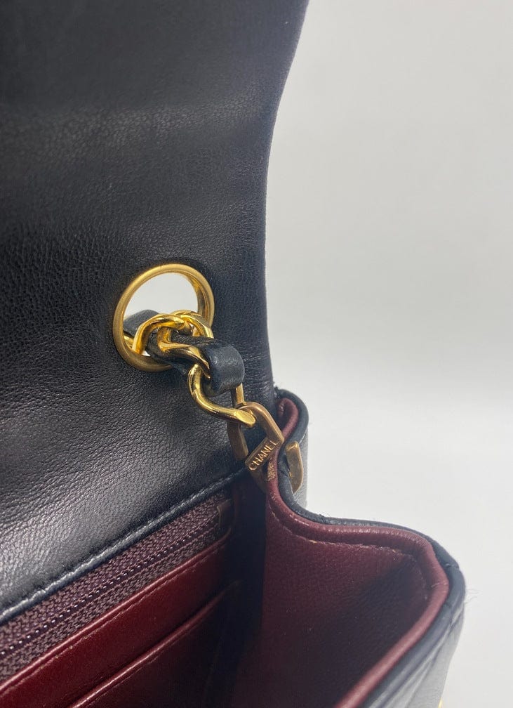 This vintage Classic Chanel Small Square Flap bag is crafted with diamond quilted black lambskin leather with 24k gold-plated hardware and a single leather-trimmed chain-link shoulder strap. There are two interior compartments and an inner zipped pocket. Inside the bag is lined with maroon leather. The chain drop for this bag is 52cm. so can be worn on the shoulder or across the body.