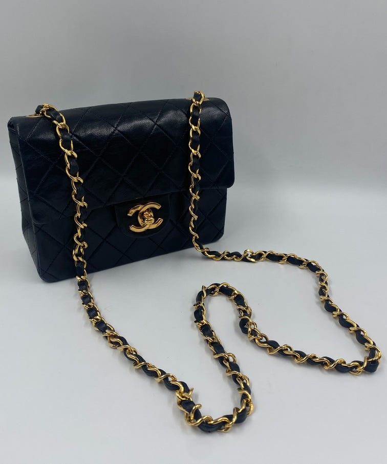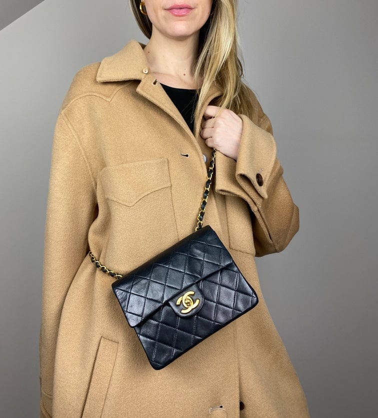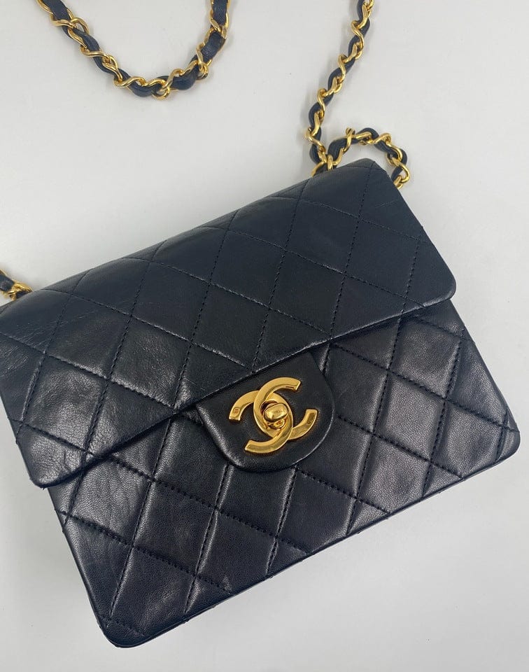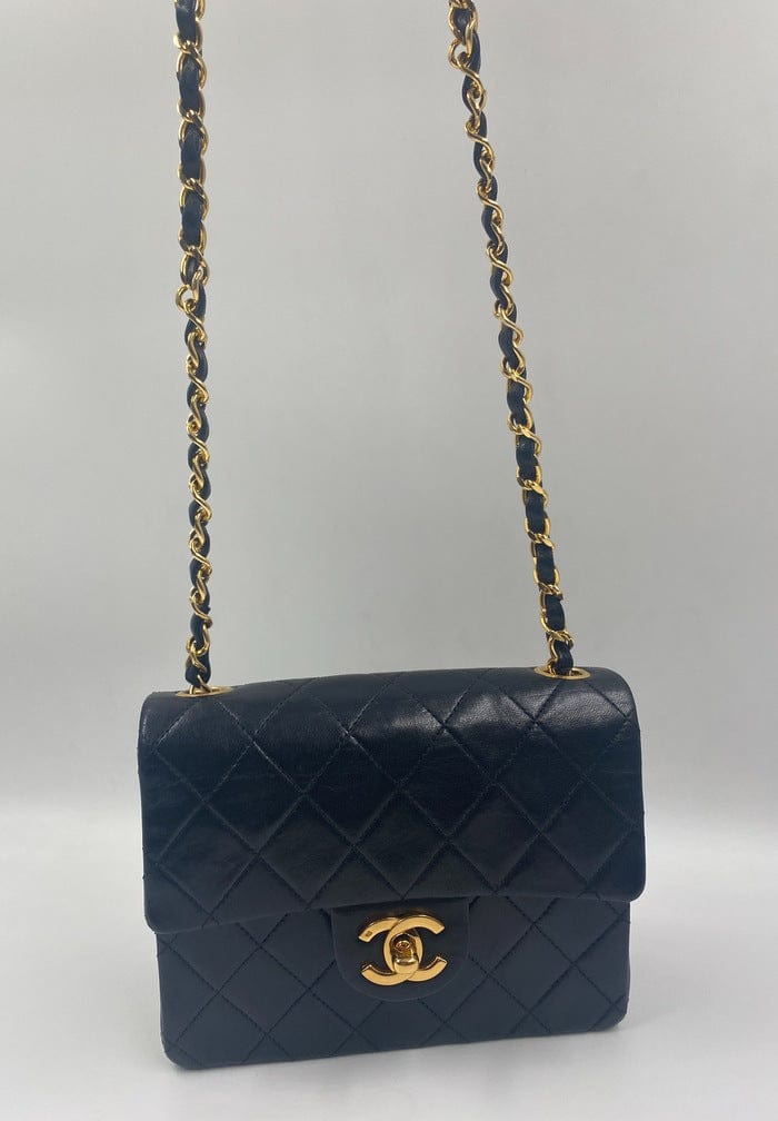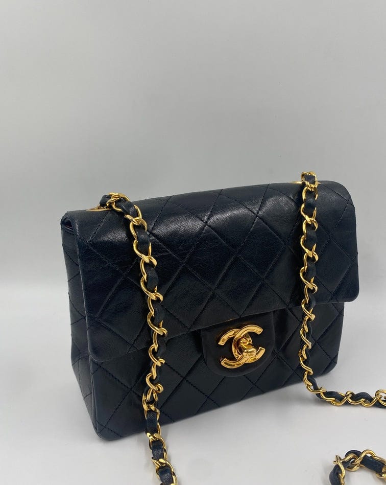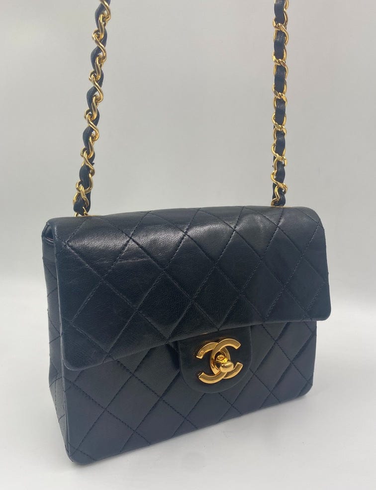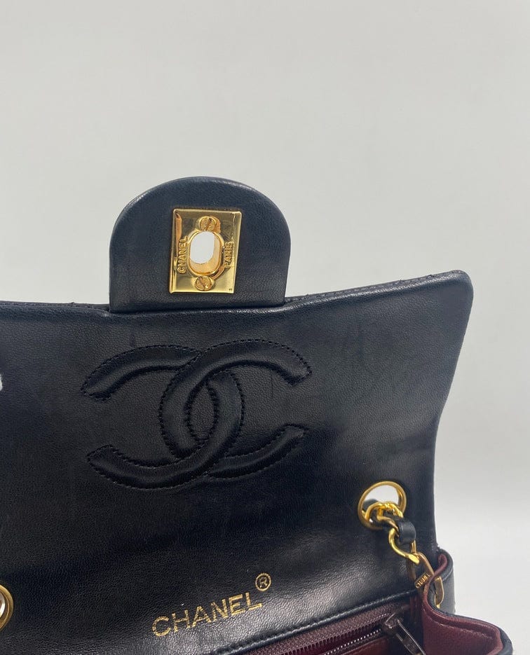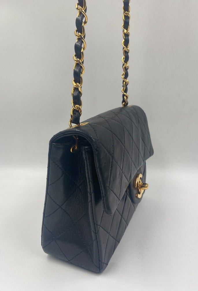 This vintage Classic Chanel Small Square Flap bag is crafted with diamond quilted black lambskin leather with 24k gold-plated hardware and a single leather-trimmed chain-link shoulder strap. There are two interior compartments and an inner zipped pocket. Inside the bag is lined with maroon leather. The chain drop for this bag is 52cm. so can be worn on the shoulder or across the body.