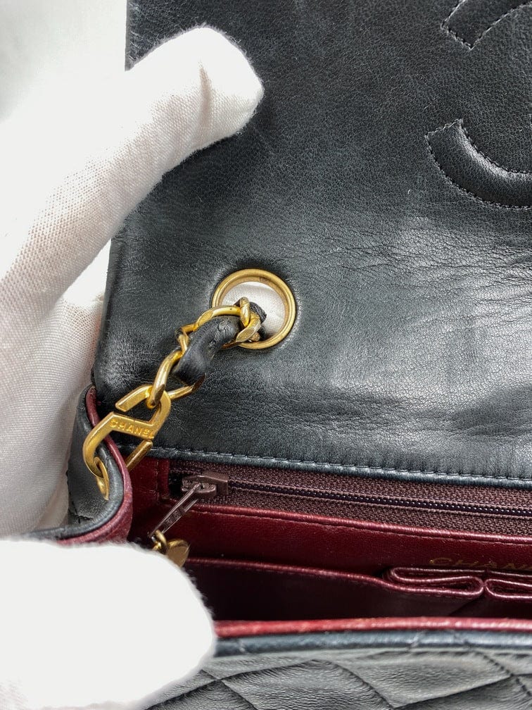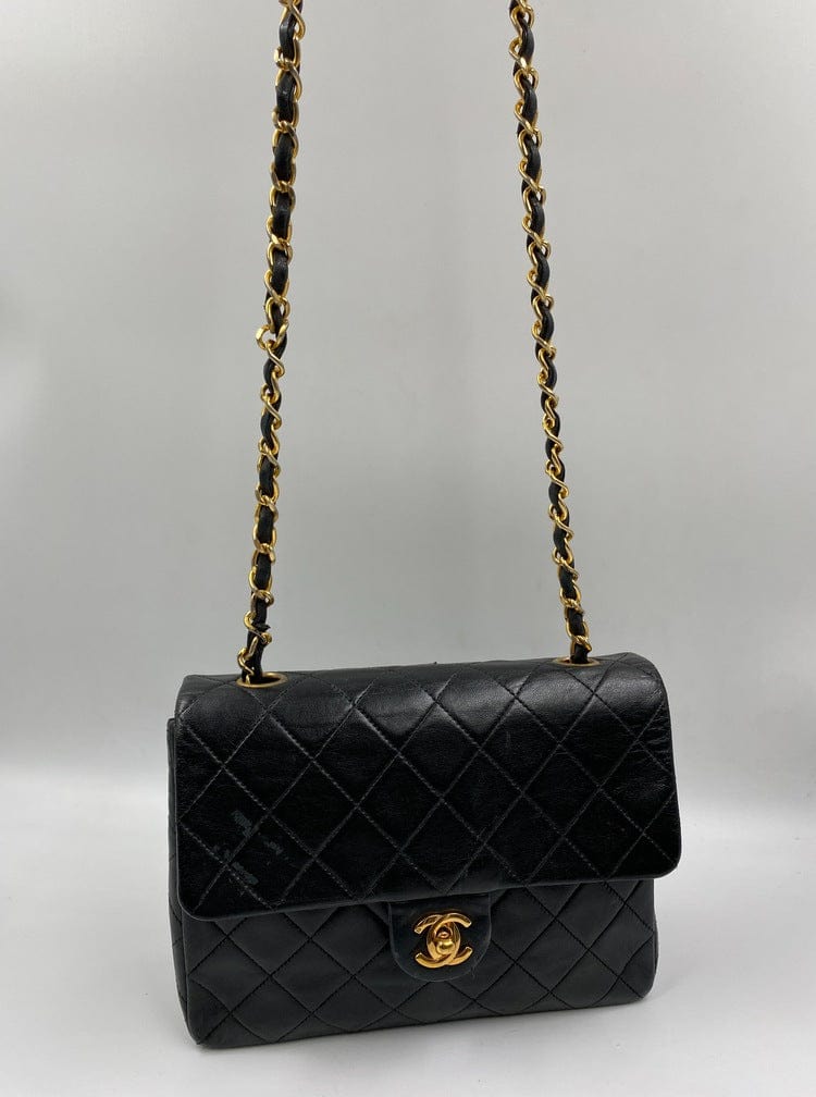 This vintage Classic Chanel Small Square Flap bag is crafted with diamond quilted black lambskin leather with 24k gold-plated hardware and a single leather-trimmed chain-link shoulder strap. There are two interior compartments and an inner zipped pocket. Inside the bag is lined with maroon leather. The chain drop for this bag is 52cm. so can be worn on the shoulder or across the body.