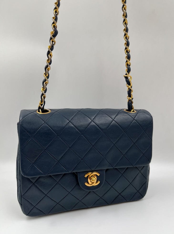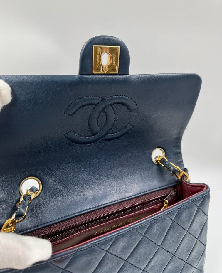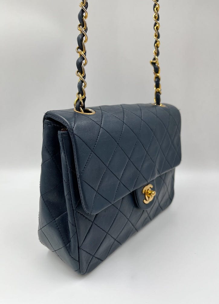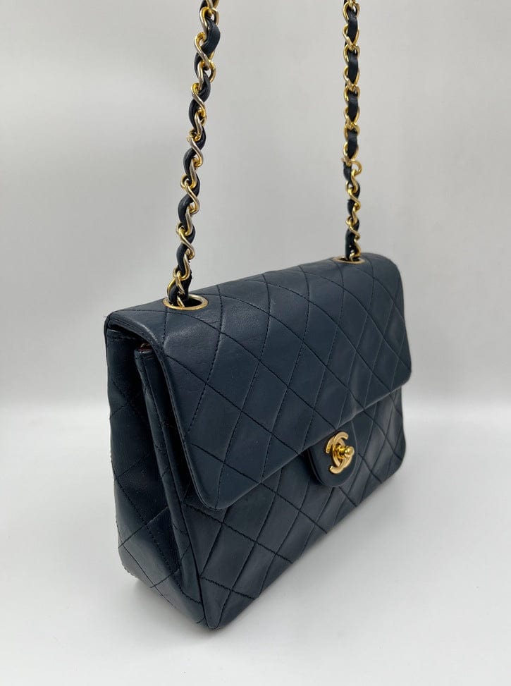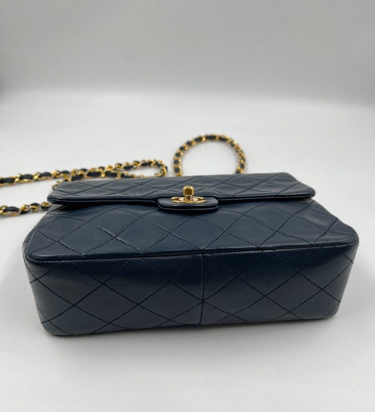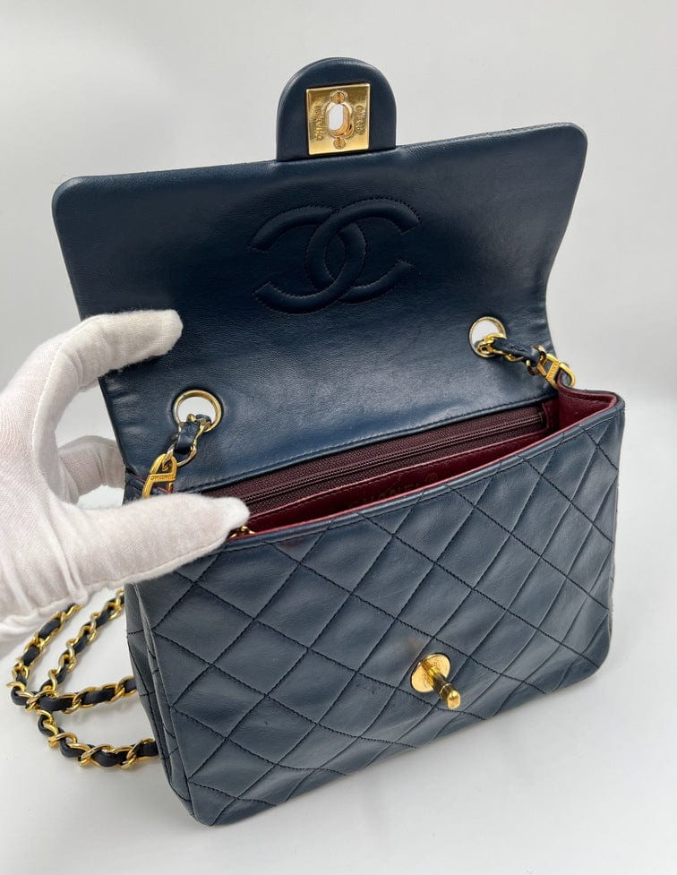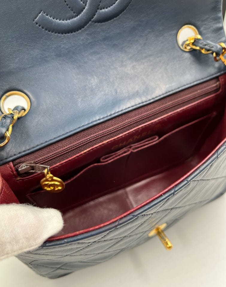 This vintage Classic Chanel Small Square Flap bag is crafted with diamond quilted navy lambskin leather with 24k gold-plated hardware and a single leather-trimmed chain-link shoulder strap. There are two interior compartments and an inner zipped pocket. Inside the bag is lined with maroon leather. The chain drop for this bag is 52cm. so can be worn on the shoulder or across the body.