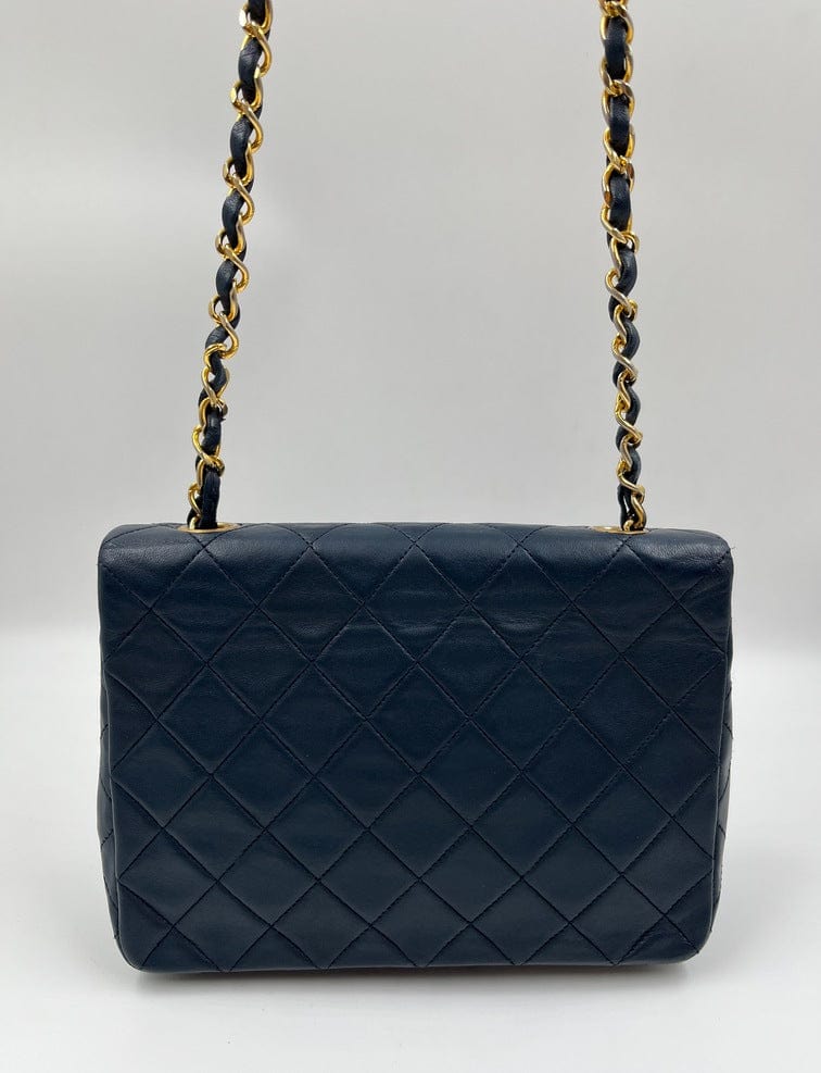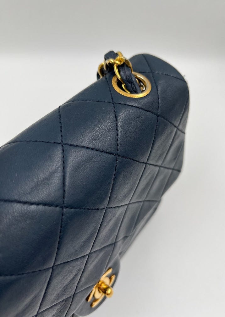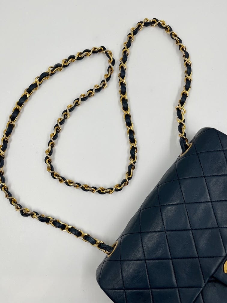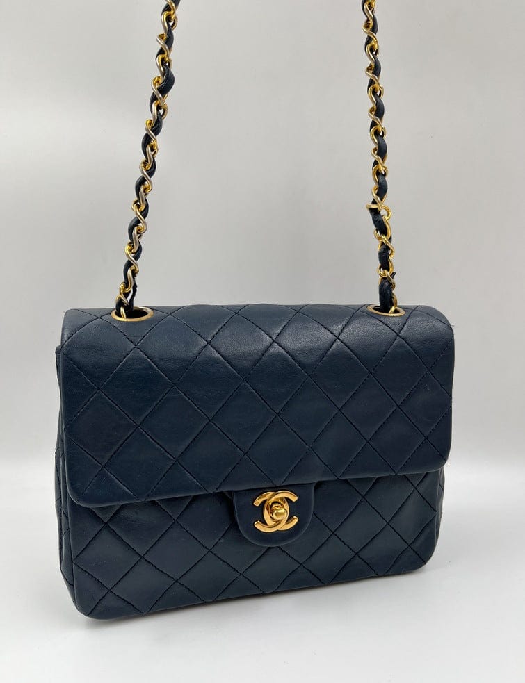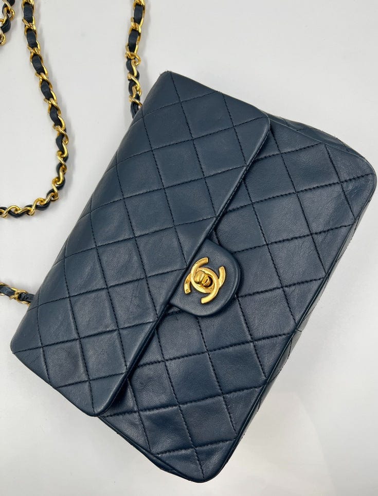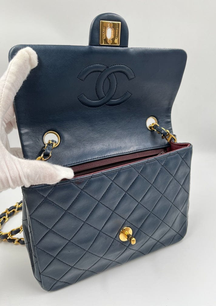 This vintage Classic Chanel Small Square Flap bag is crafted with diamond quilted navy lambskin leather with 24k gold-plated hardware and a single leather-trimmed chain-link shoulder strap. There are two interior compartments and an inner zipped pocket. Inside the bag is lined with maroon leather. The chain drop for this bag is 52cm. so can be worn on the shoulder or across the body.