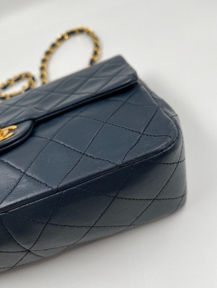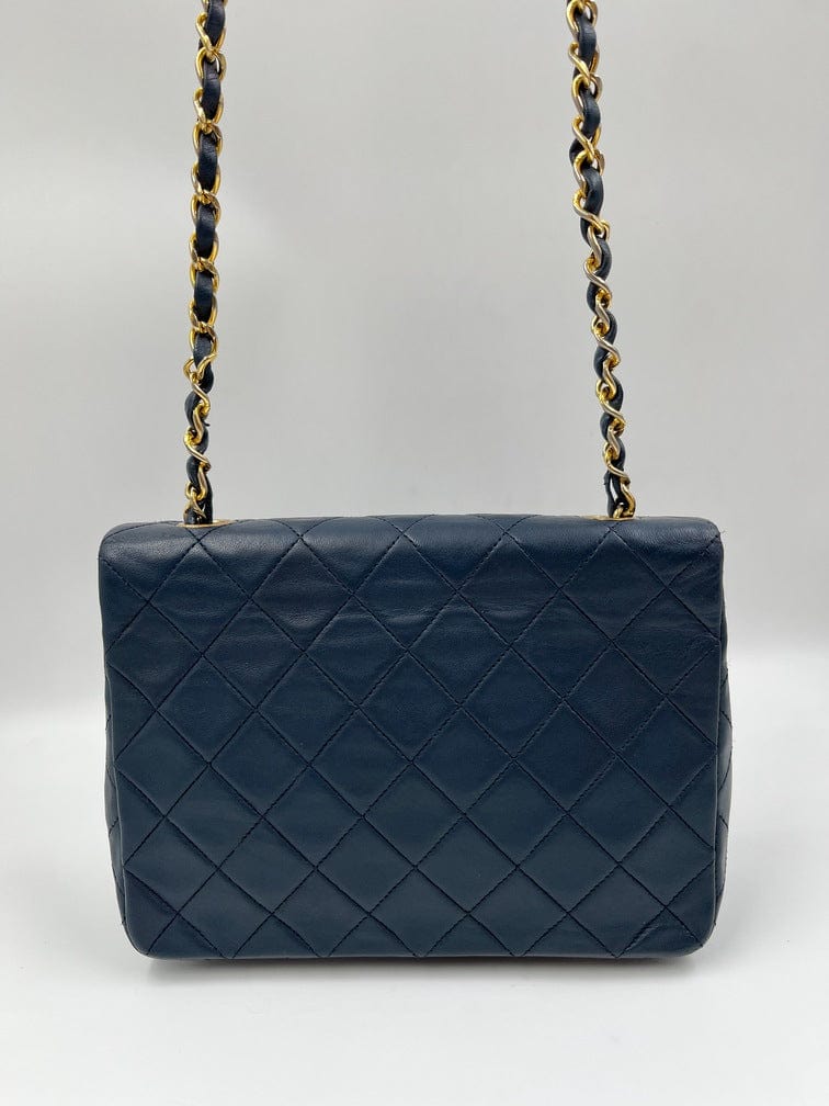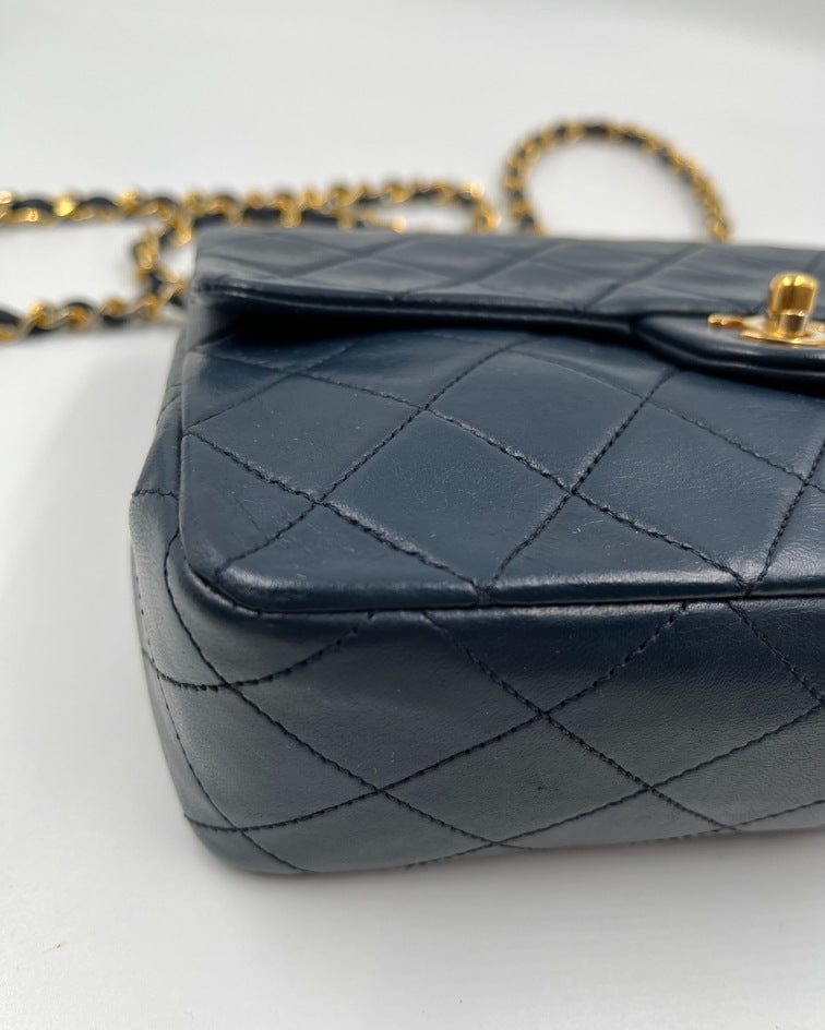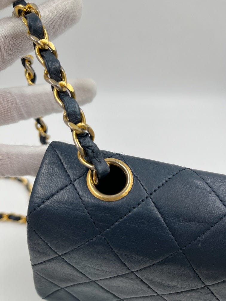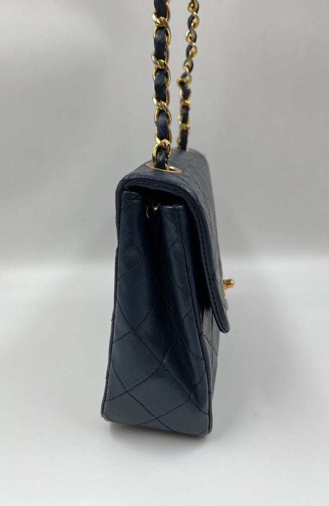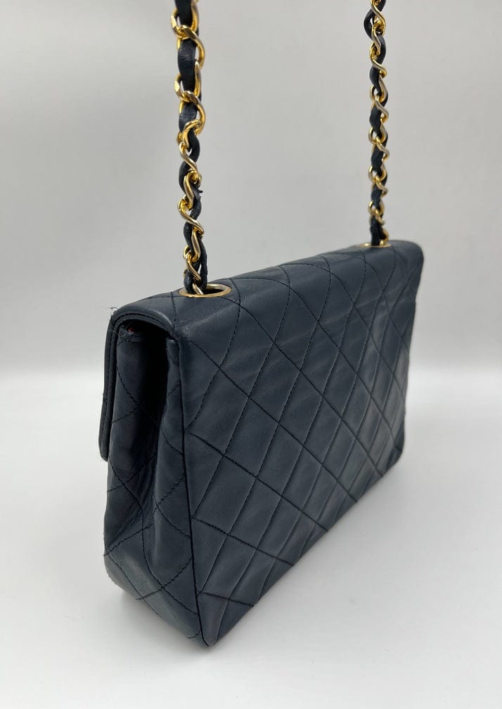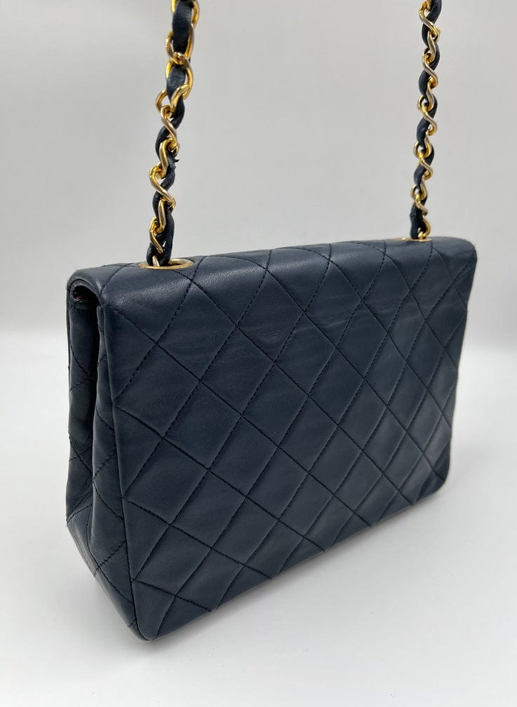 This vintage Classic Chanel Small Square Flap bag is crafted with diamond quilted navy lambskin leather with 24k gold-plated hardware and a single leather-trimmed chain-link shoulder strap. There are two interior compartments and an inner zipped pocket. Inside the bag is lined with maroon leather. The chain drop for this bag is 52cm. so can be worn on the shoulder or across the body.