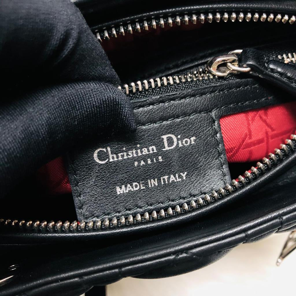 This Christian Dior Lambskin Cannage Medium Lady Dior in black is aquintessential classic bag from the house of Dior.This bag features a black lambskin leather exterior paired witha red Dior monogram jacquard interior fabric. This classic Lady Dior Bag is an ideal day to day accessory.