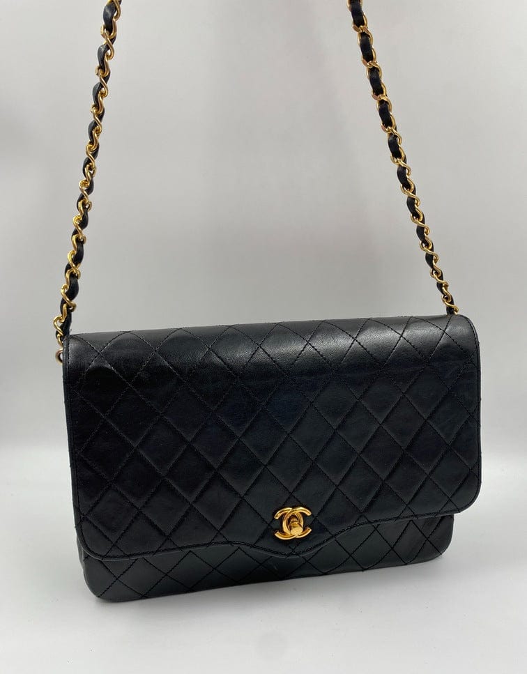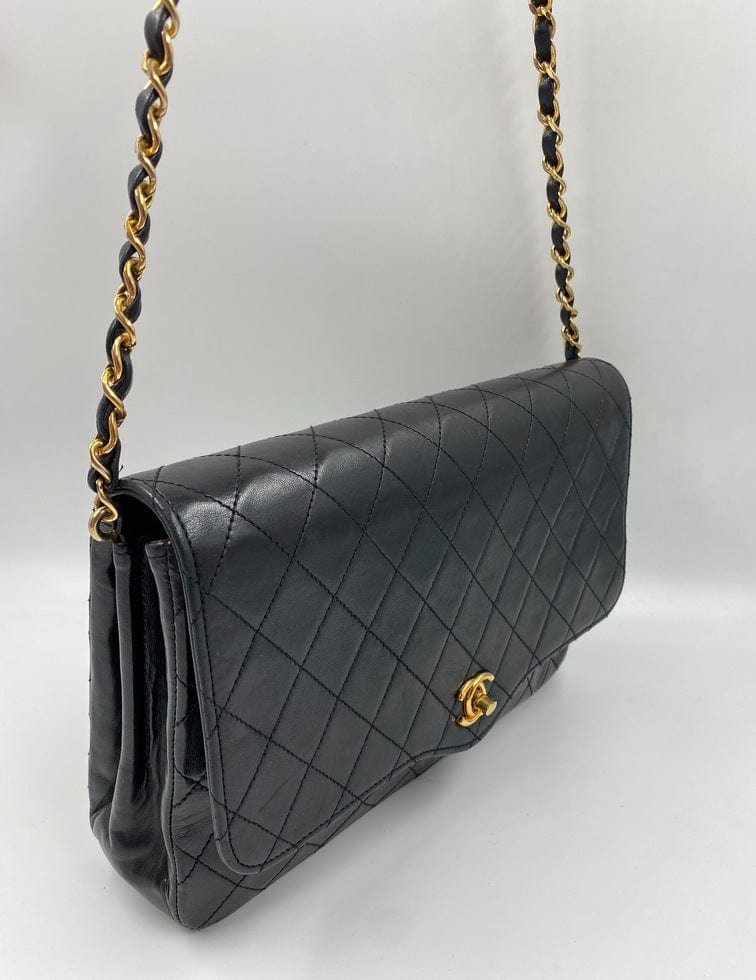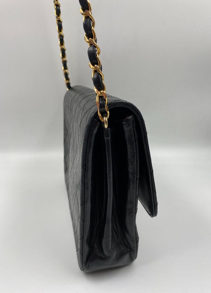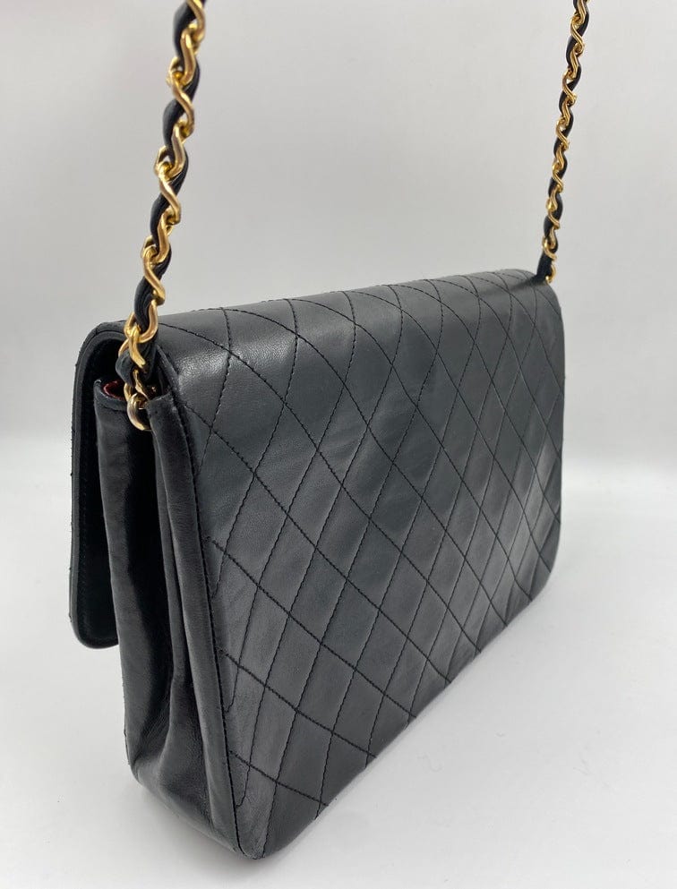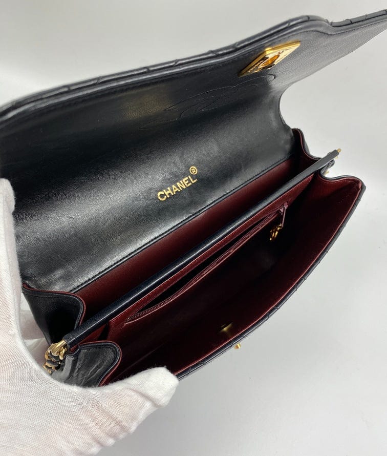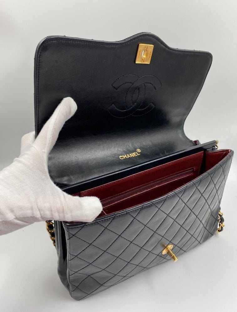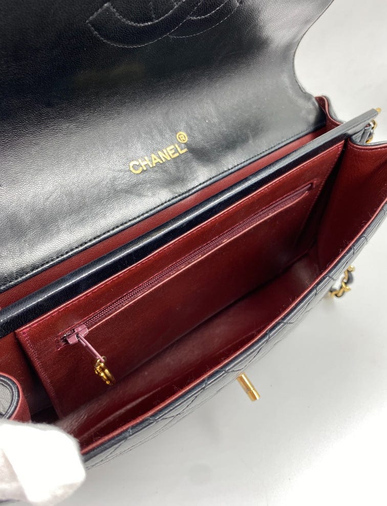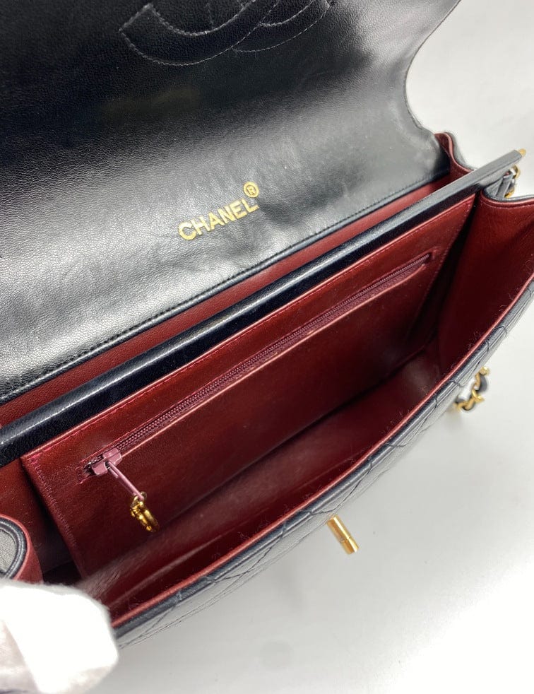 This vintage Classic Chanel Flap bag is crafted with diamond quilted lambskin leather with gold-plated hardware and a leather-trimmed chain-link shoulder strap. There are two main inner compartments separated by a reinforced partition, there is also a zipped interior pocket for your valuables. Inside the bag is lined with maroon leather.