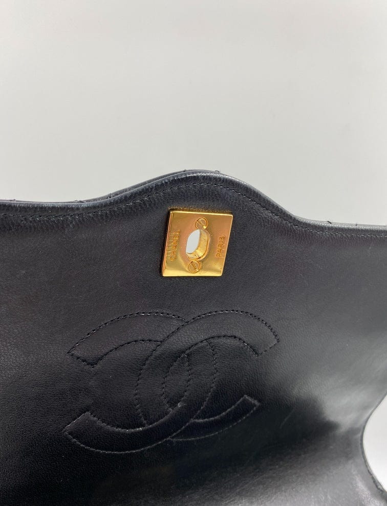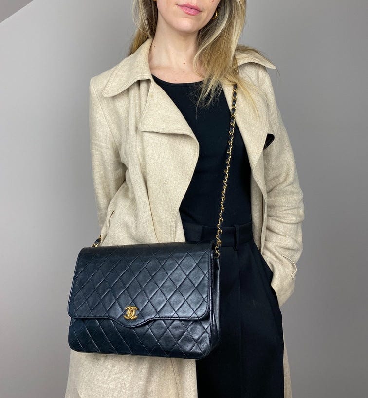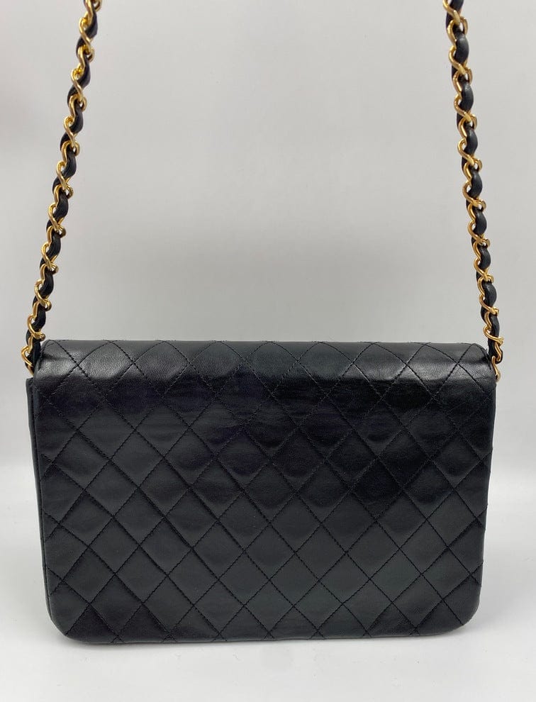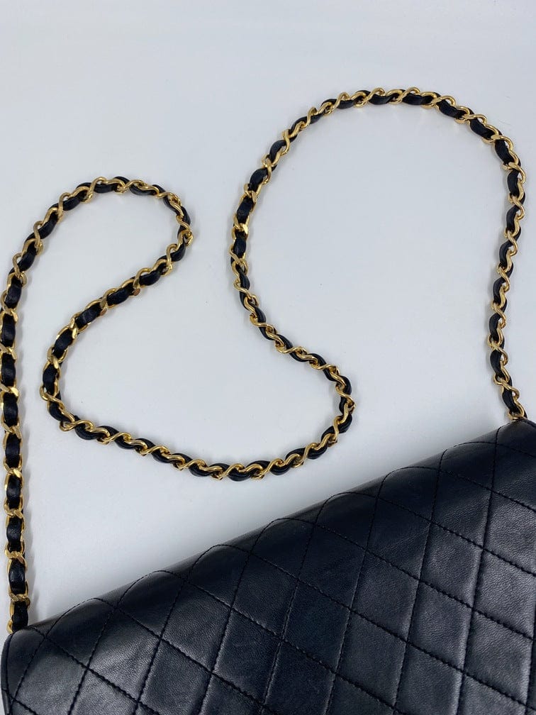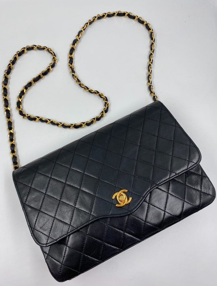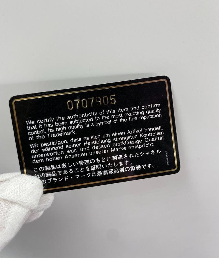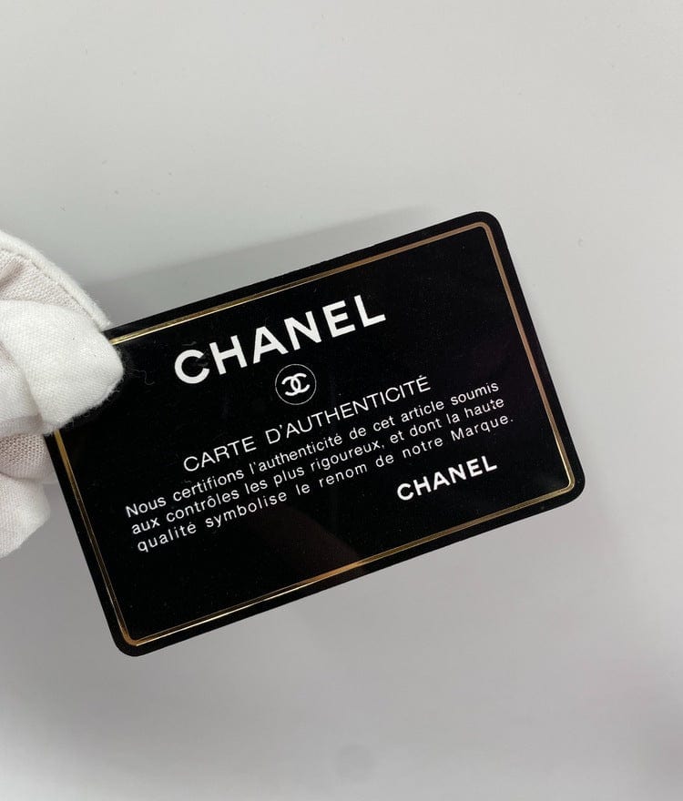 The serial number on the card tells us the bag was made between 1986 and 1988. This bag is in New vintage condition with some minor signs of use. The hallmark on the CC turn lock confirms the gold hardware is plated in 24K gold, a real collectors item. Before 2008, Chanel Classic Flaps with gold coloured hardware (chains, clasps, grommets, and CC turn locks) were all plated in real 24K gold. There are some minor scratches and creasing to the leather. Inside the leather lining is in New condition.