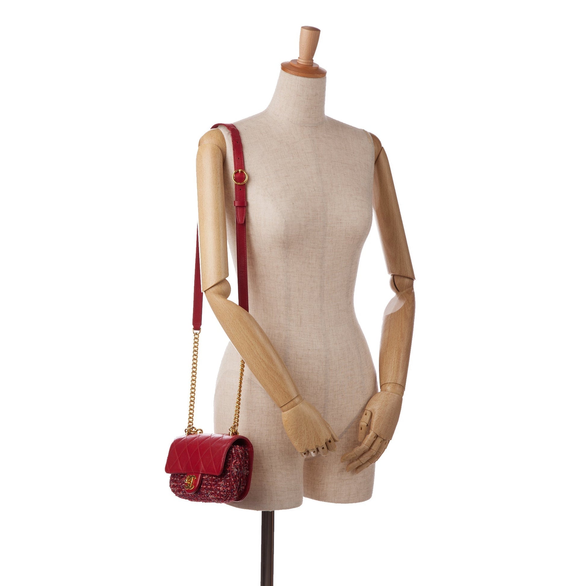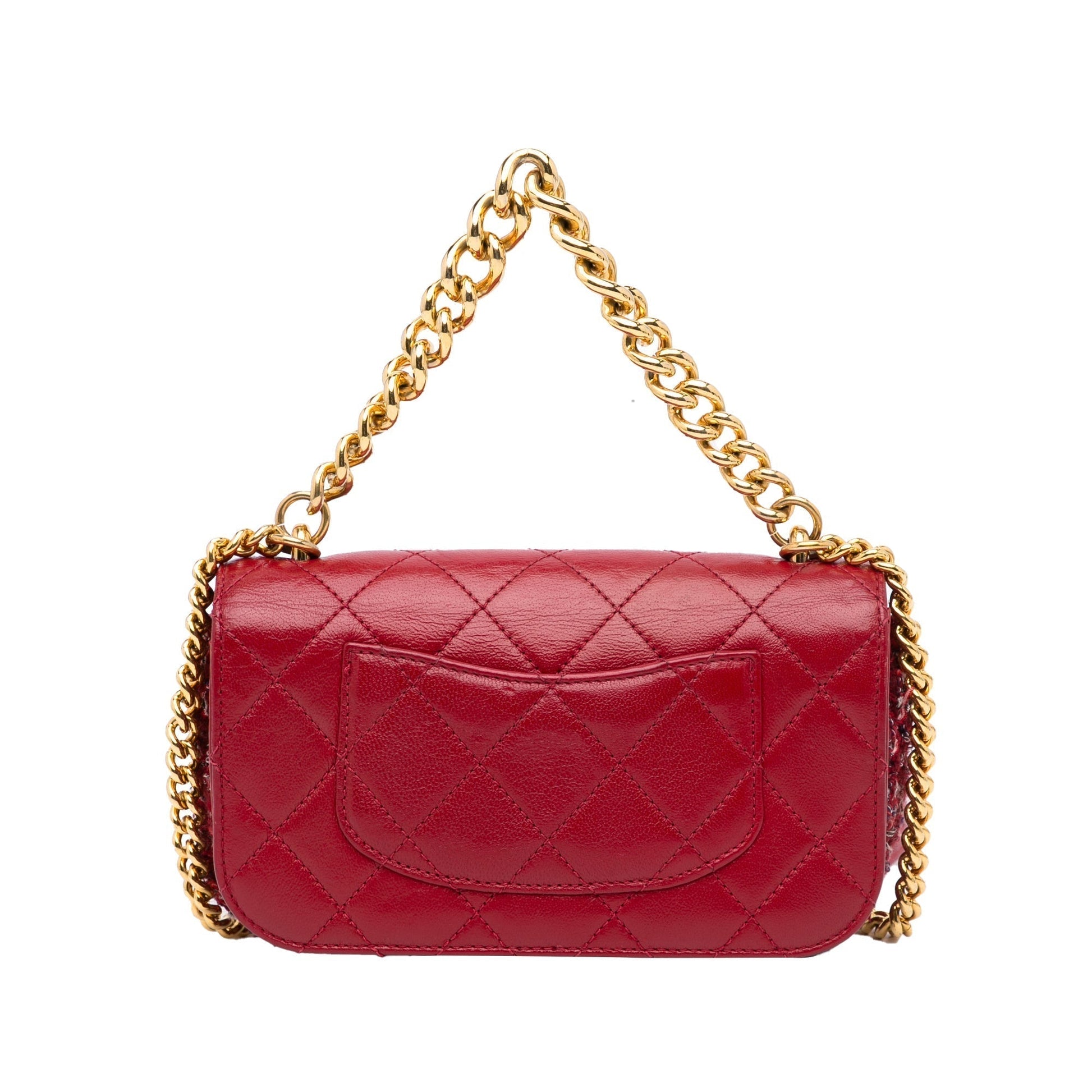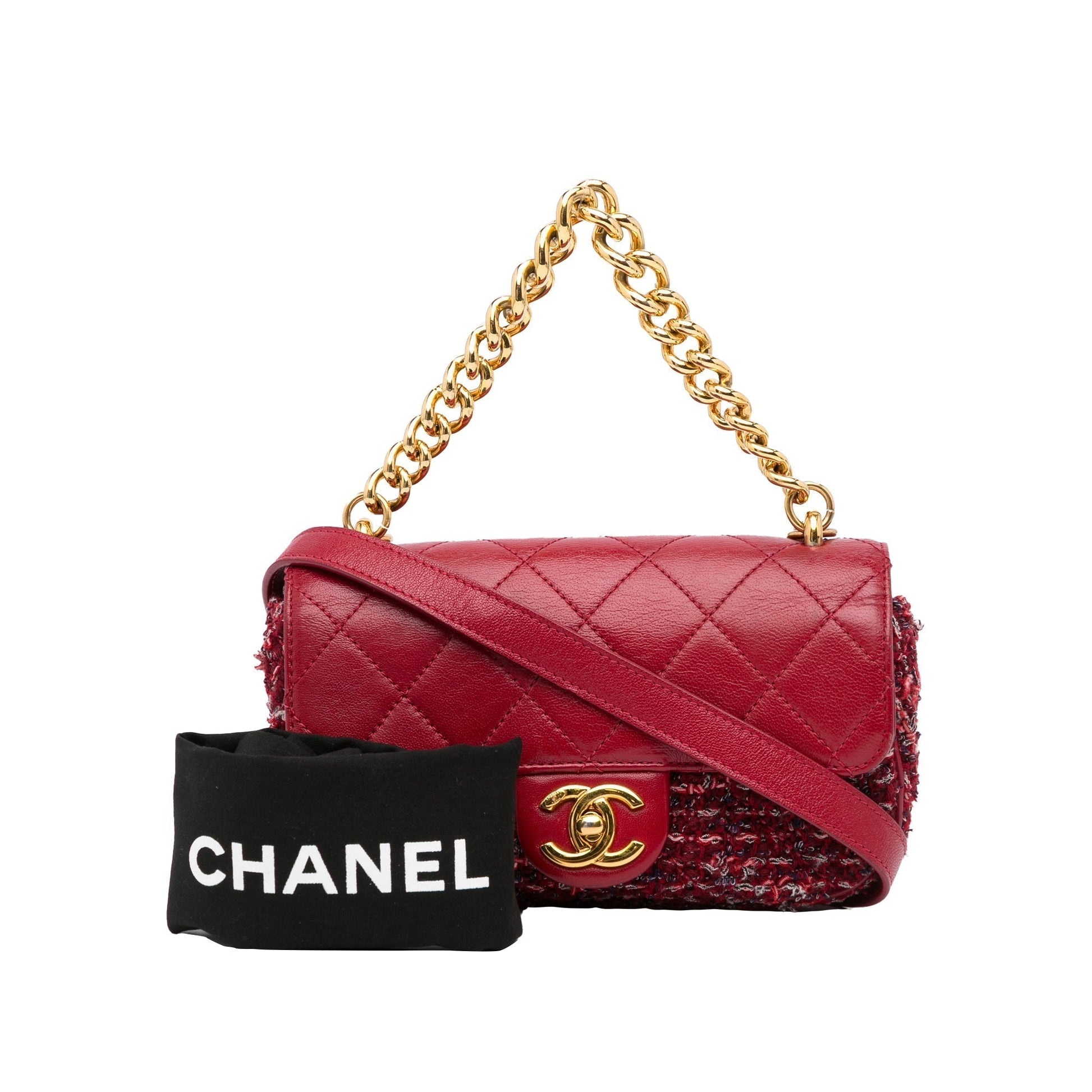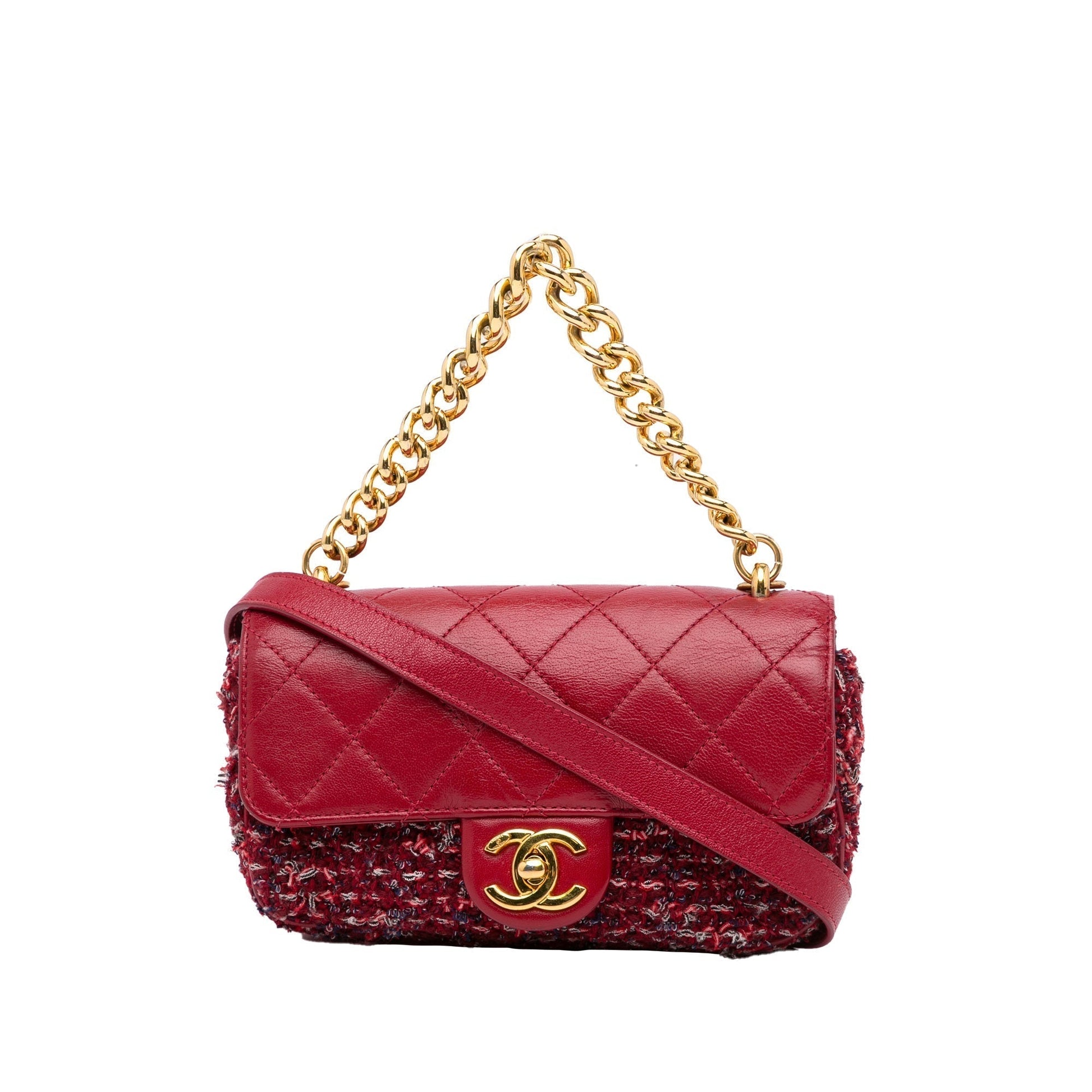 This single flap from Chanel is made of red tweed with lambskin leather trim. It features an exterior back compartment, a gold-tone chain and leather shoulder strap, a front flap with interlocking C's and a twist closure, and interior zippered compartments.