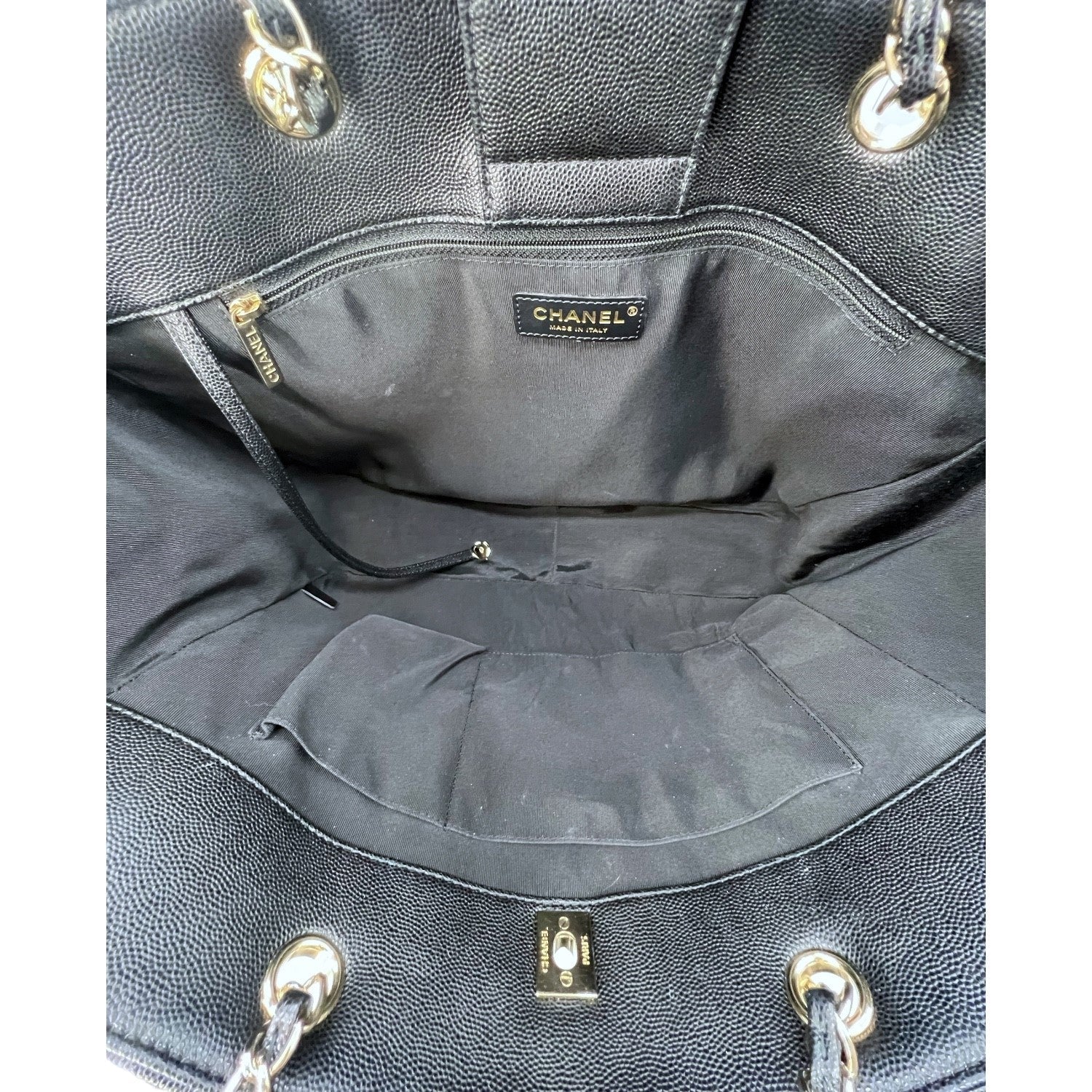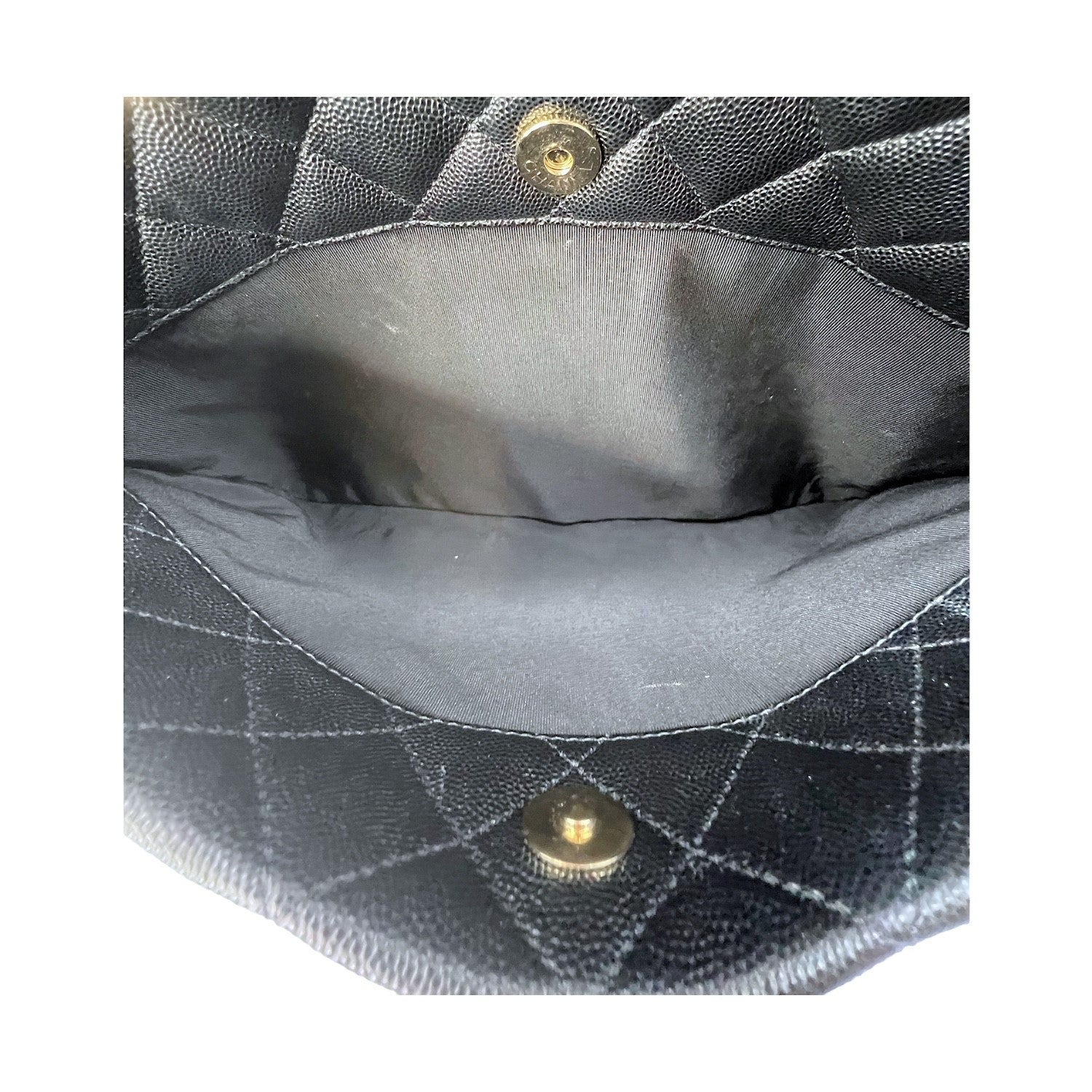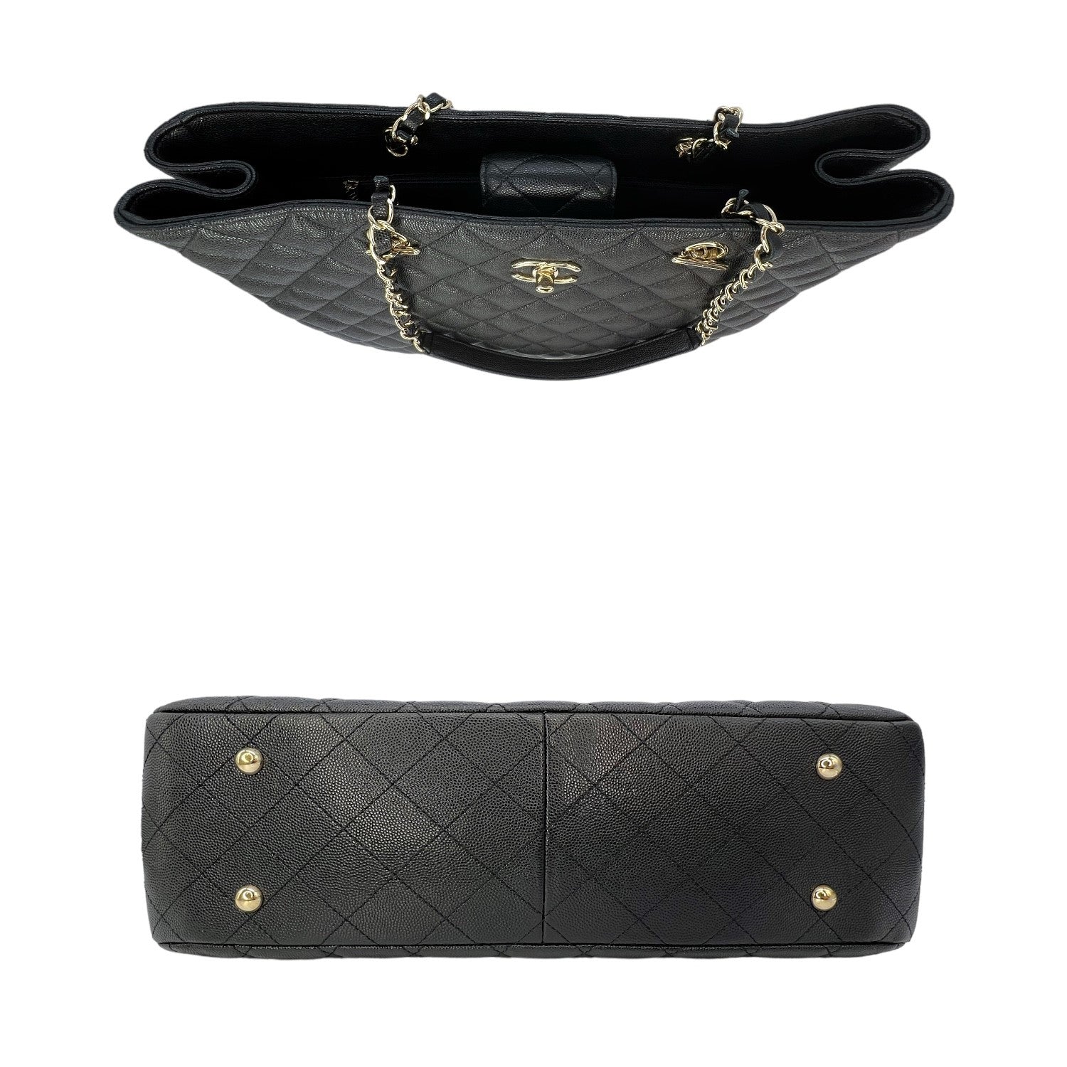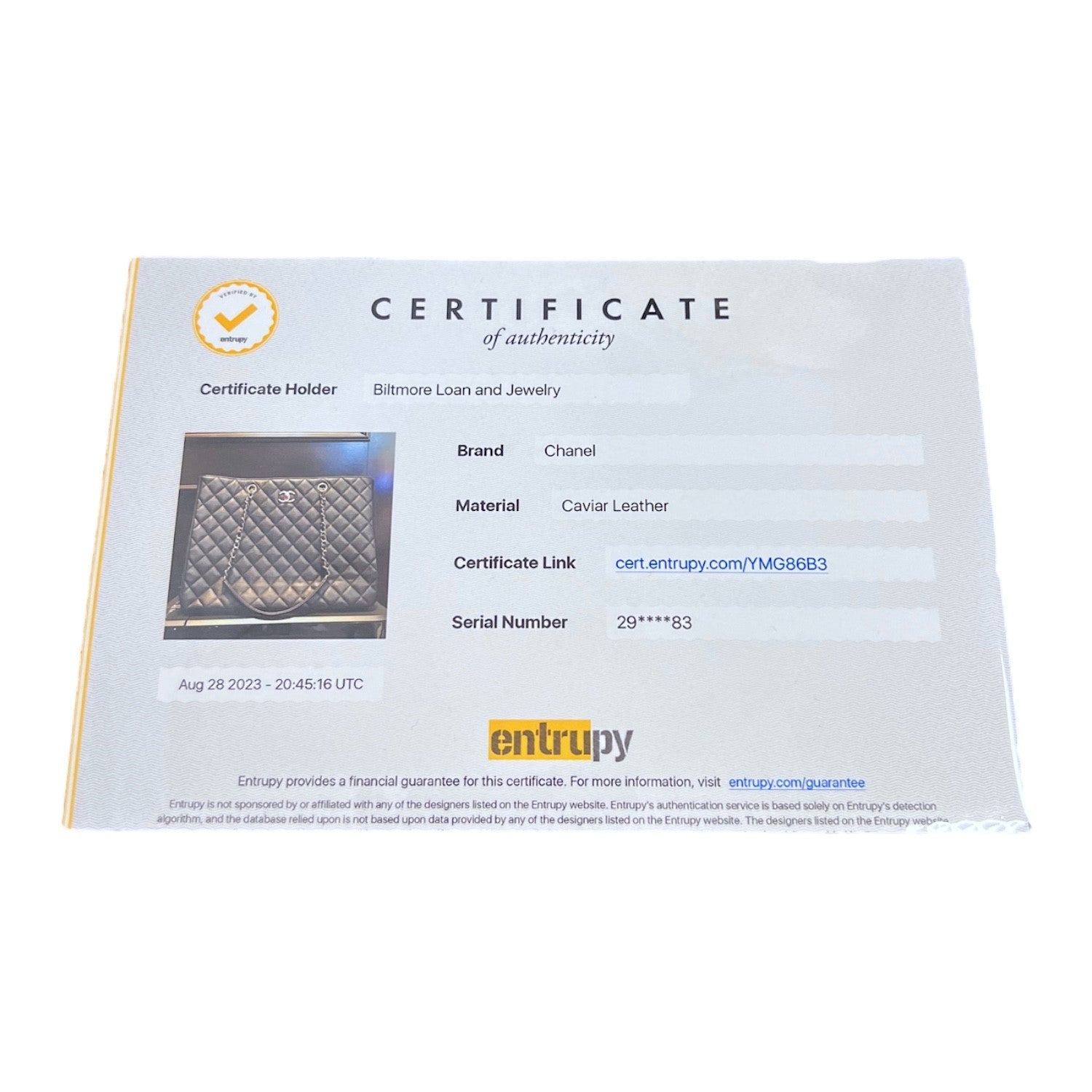 This Chanel Classic Timeless Tote was made in Italy and it is finely crafted of a black quilted caviar leather exterior with gold-tone hardware features. It has dual leather and chain-link shoulder straps. It has a slip pocket on the backside with a magnetic closure. It has a locking push through closure and it opens up to a black grosgrain interior with 2 slip pockets and a zipper pocket. This classic, timeless tote is perfect for everyday use and it is also certified by Entrupy!