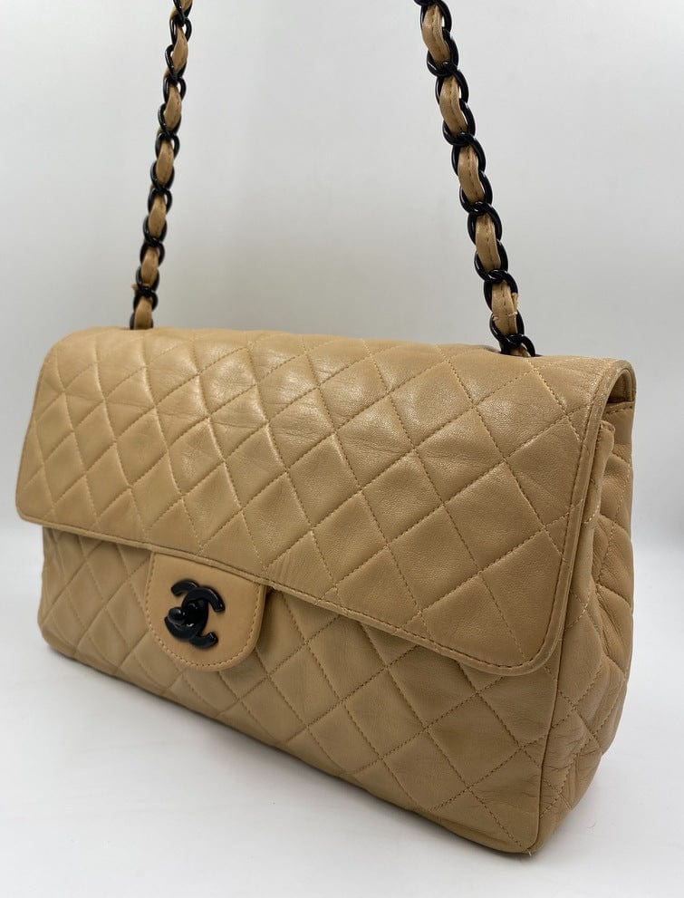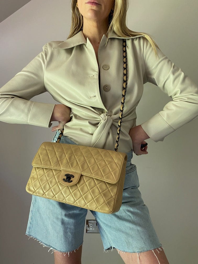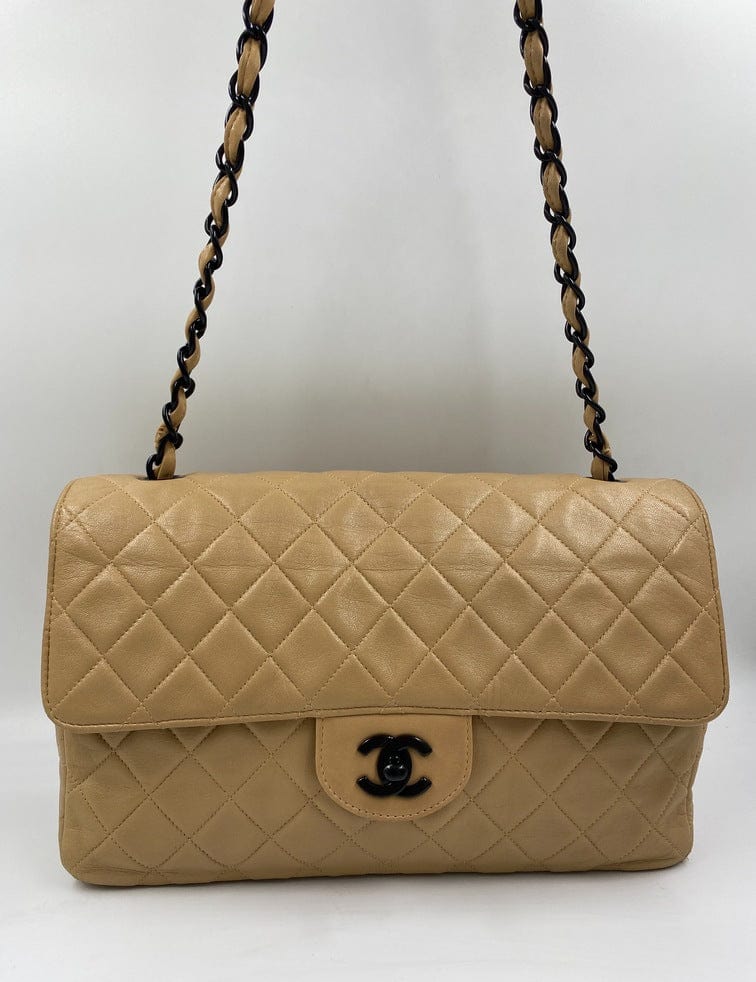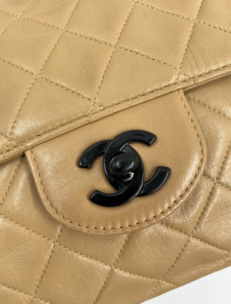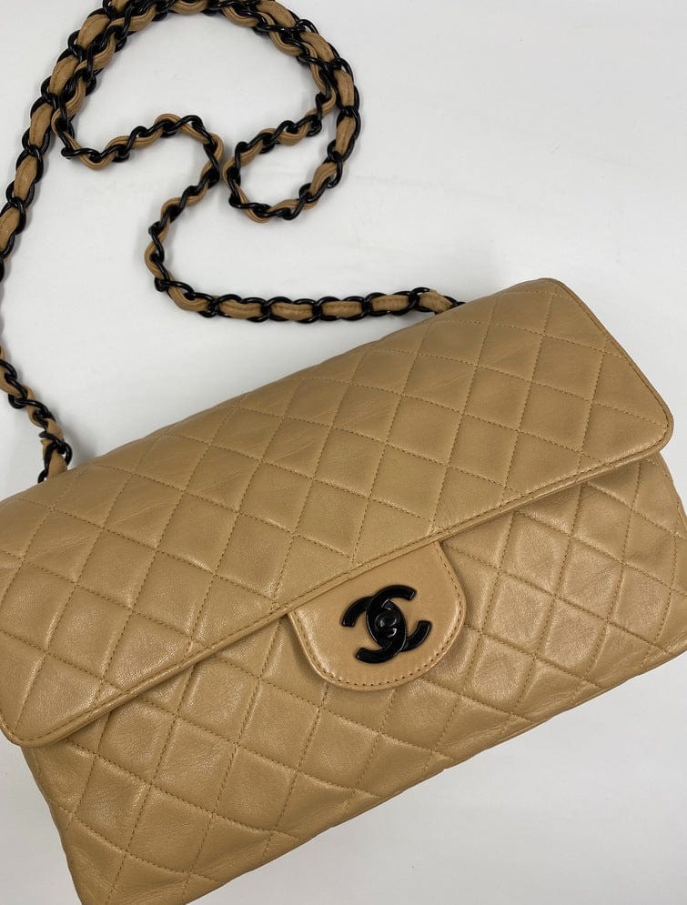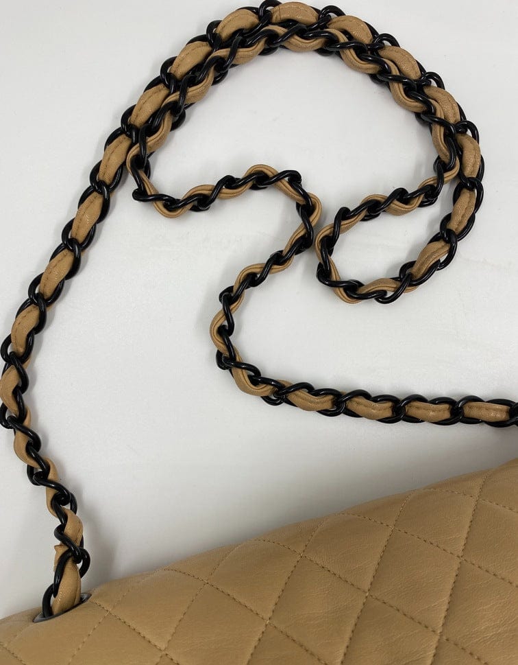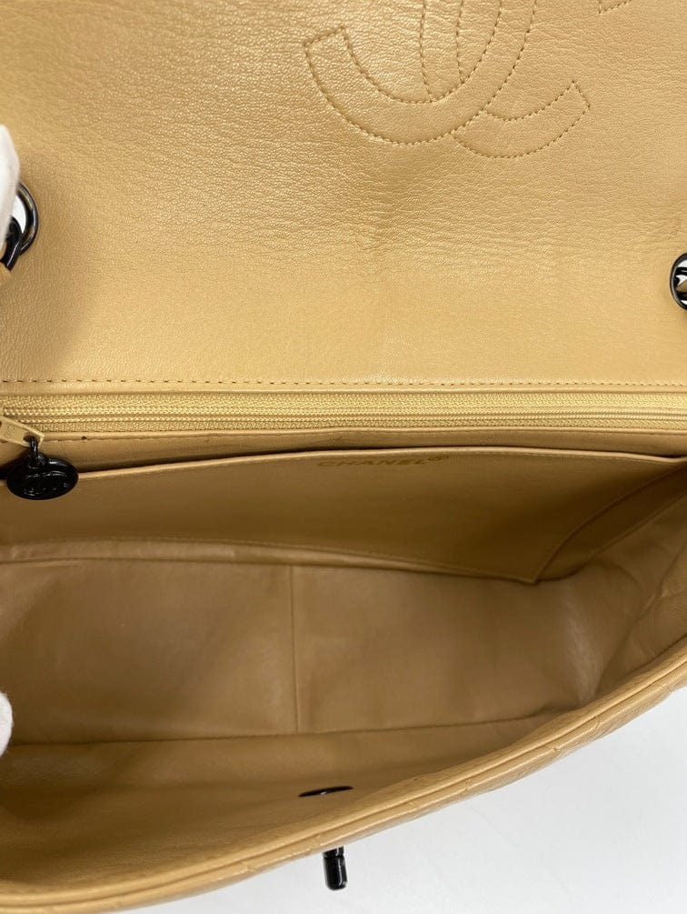 This vintage Classic Chanel Flap bag is crafted with diamond quilted beige lambskin leather with black hardware and a leather-trimmed chain-link shoulder strap. There is a single exterior patch pocket on the back, inside there is a zipped pocket plus slip pocket. The interior of the bag is lined with beige leather. This chain can only be worn at one length - the drop of the chain is 53cm.