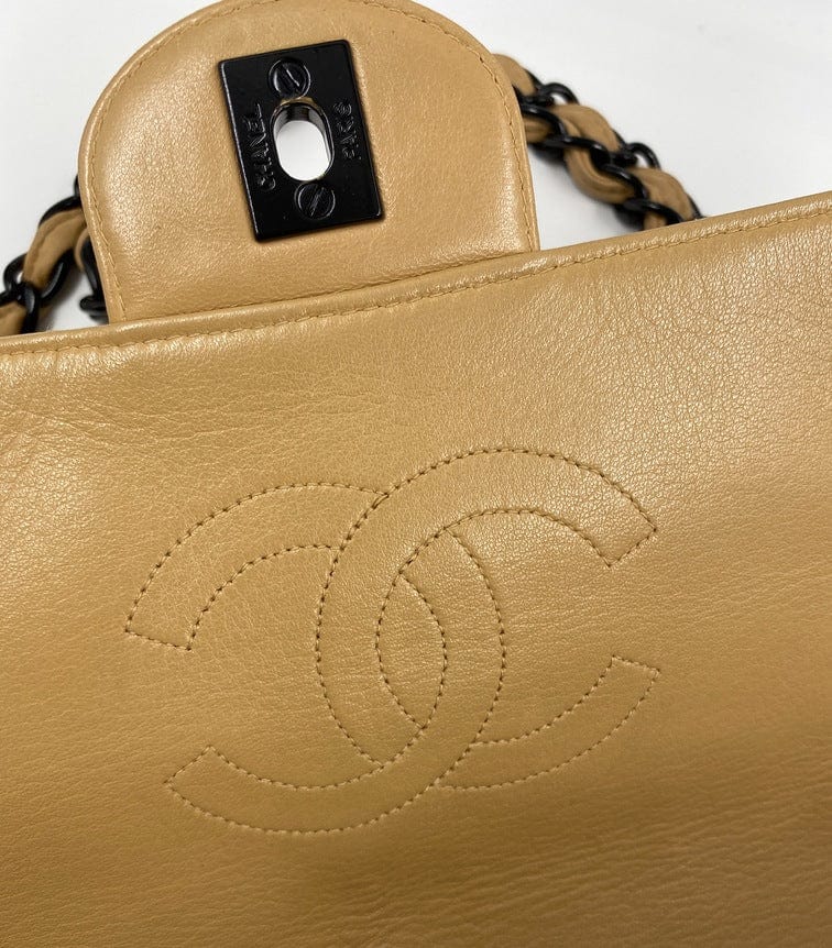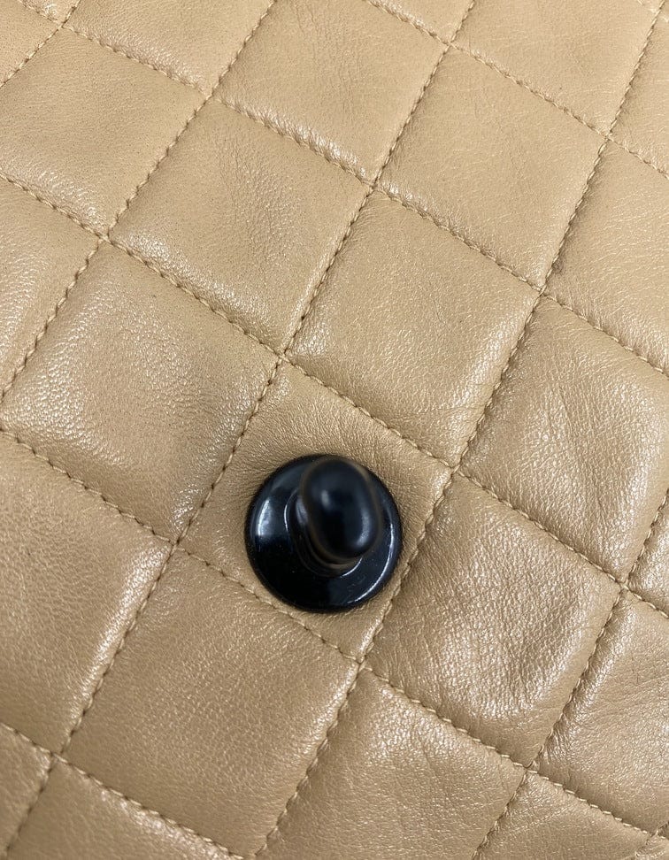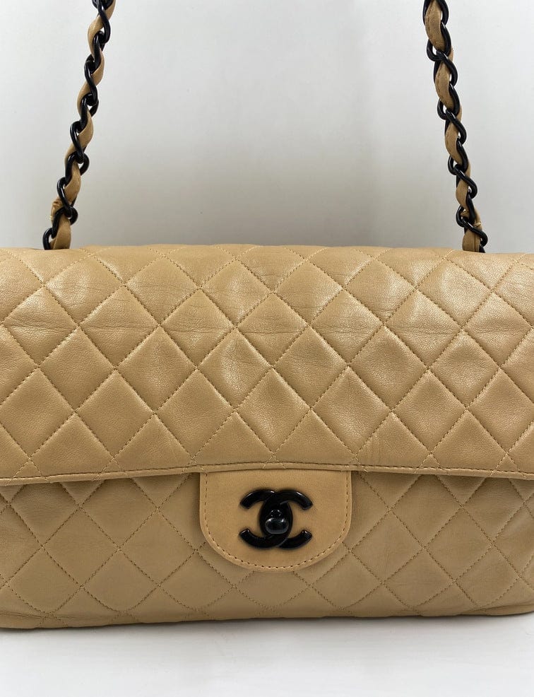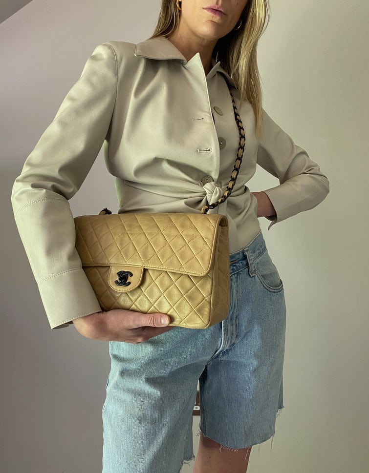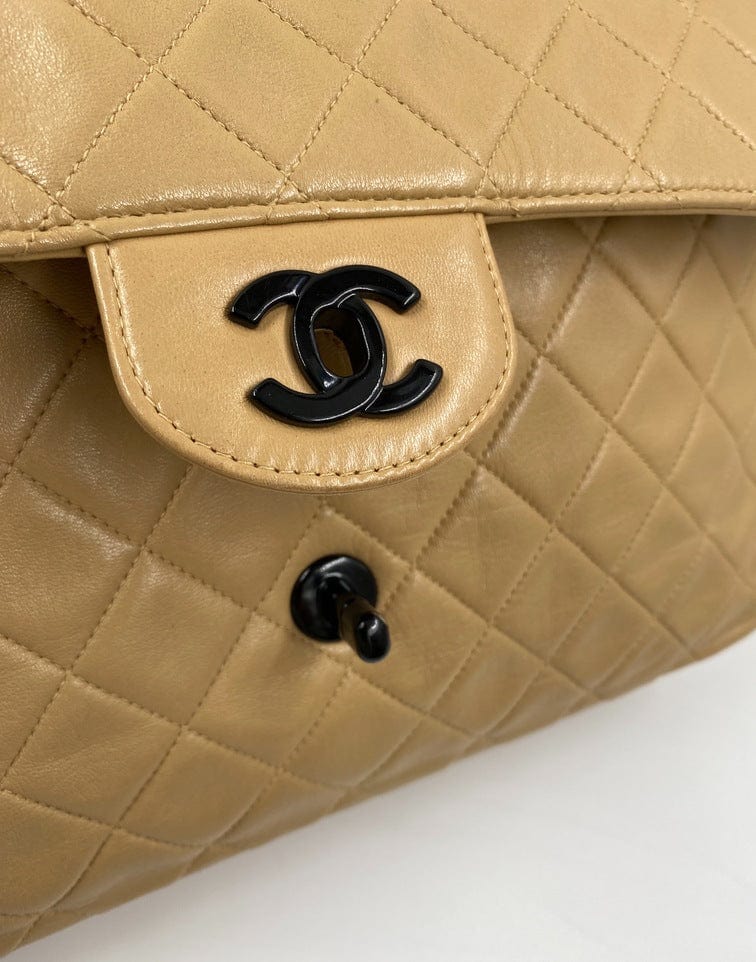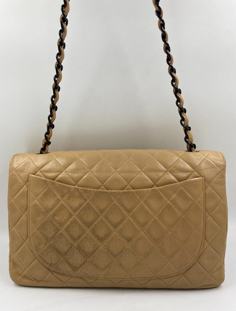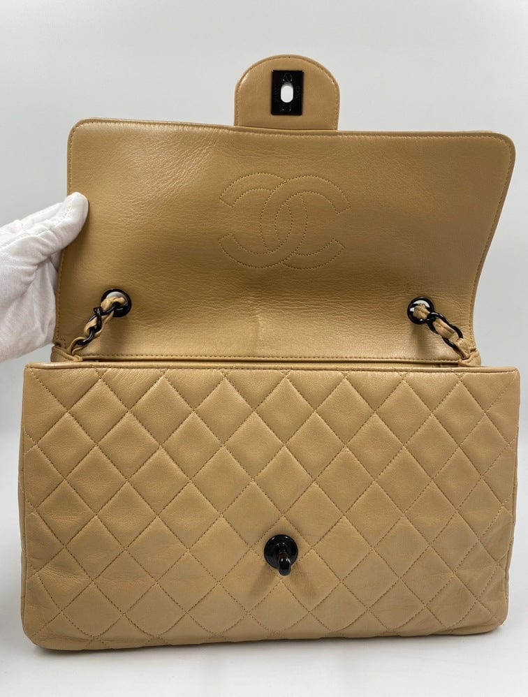 This vintage Classic Chanel Flap bag is crafted with diamond quilted beige lambskin leather with black hardware and a leather-trimmed chain-link shoulder strap. There is a single exterior patch pocket on the back, inside there is a zipped pocket plus slip pocket. The interior of the bag is lined with beige leather. This chain can only be worn at one length - the drop of the chain is 53cm.